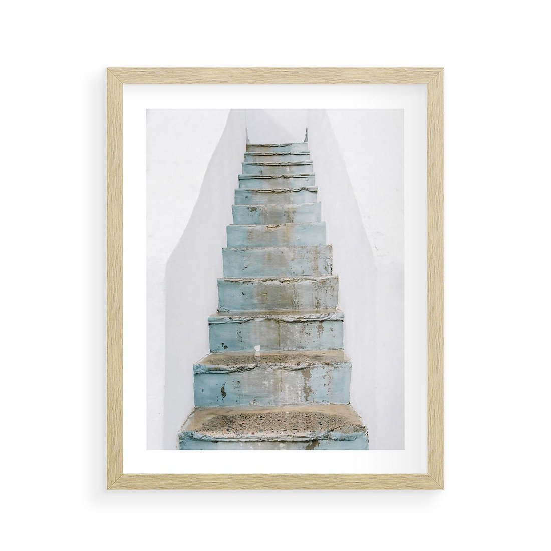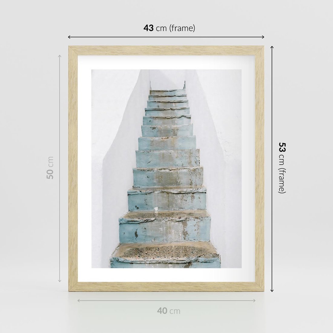 Plakat w ramie 40x50 - Niebieskie Schody Santorini - stare kamienne schody, niebieskie schody - rama drewno