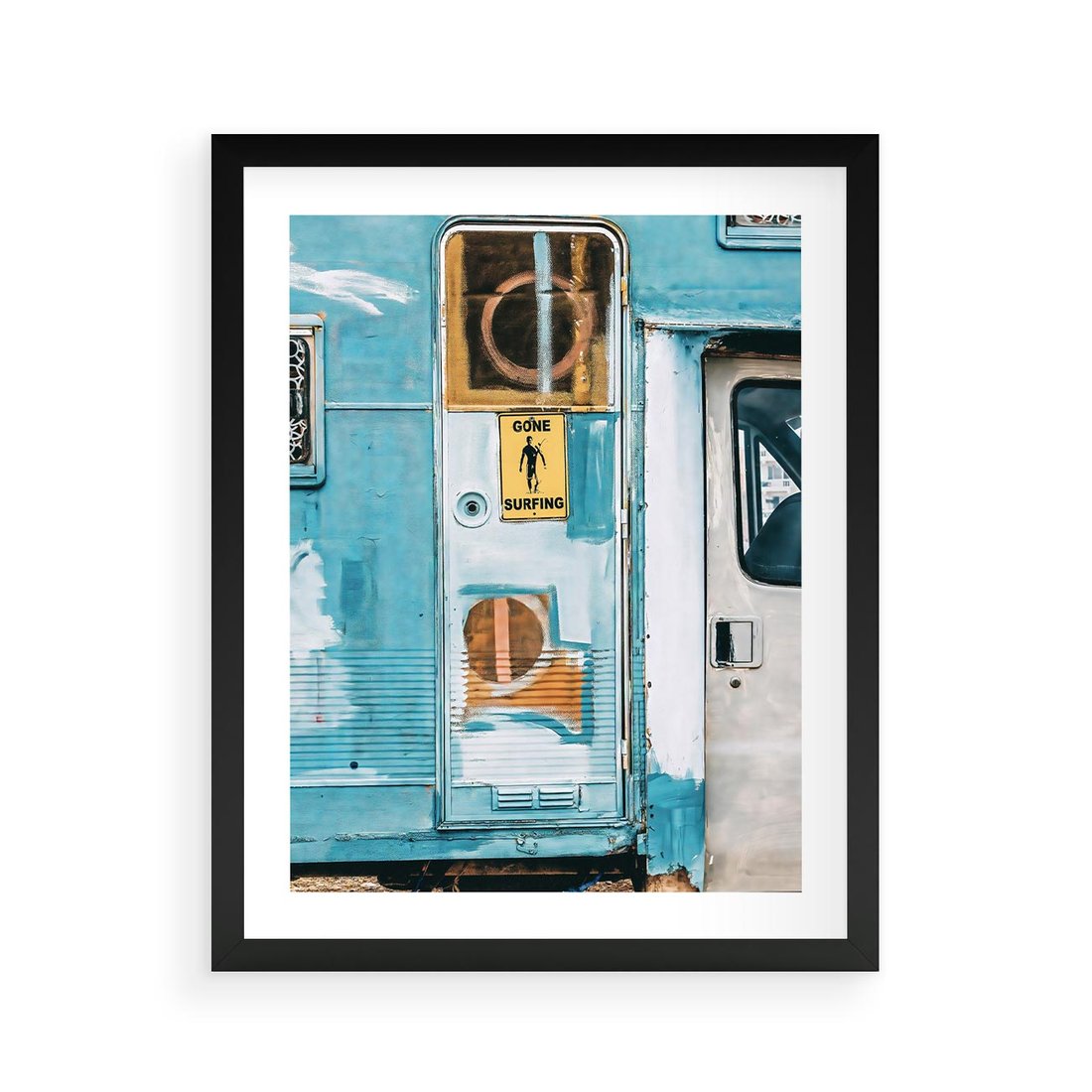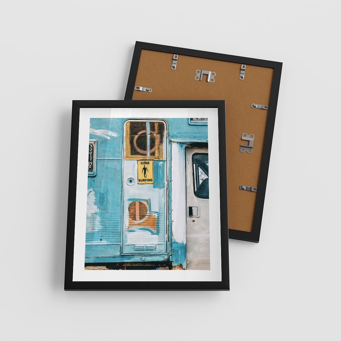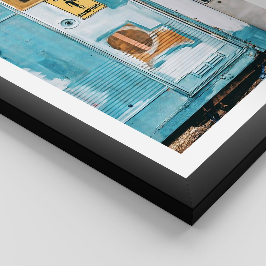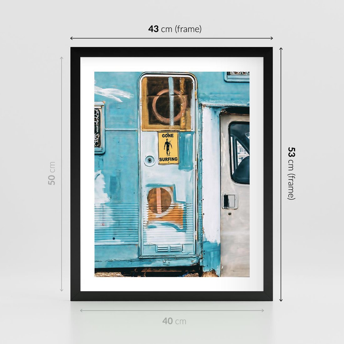 Plakat w ramie 40x50 - Nostalgiczna Podróż - stara przyczepa kempingowa, niebieskie kolory - rama czarna