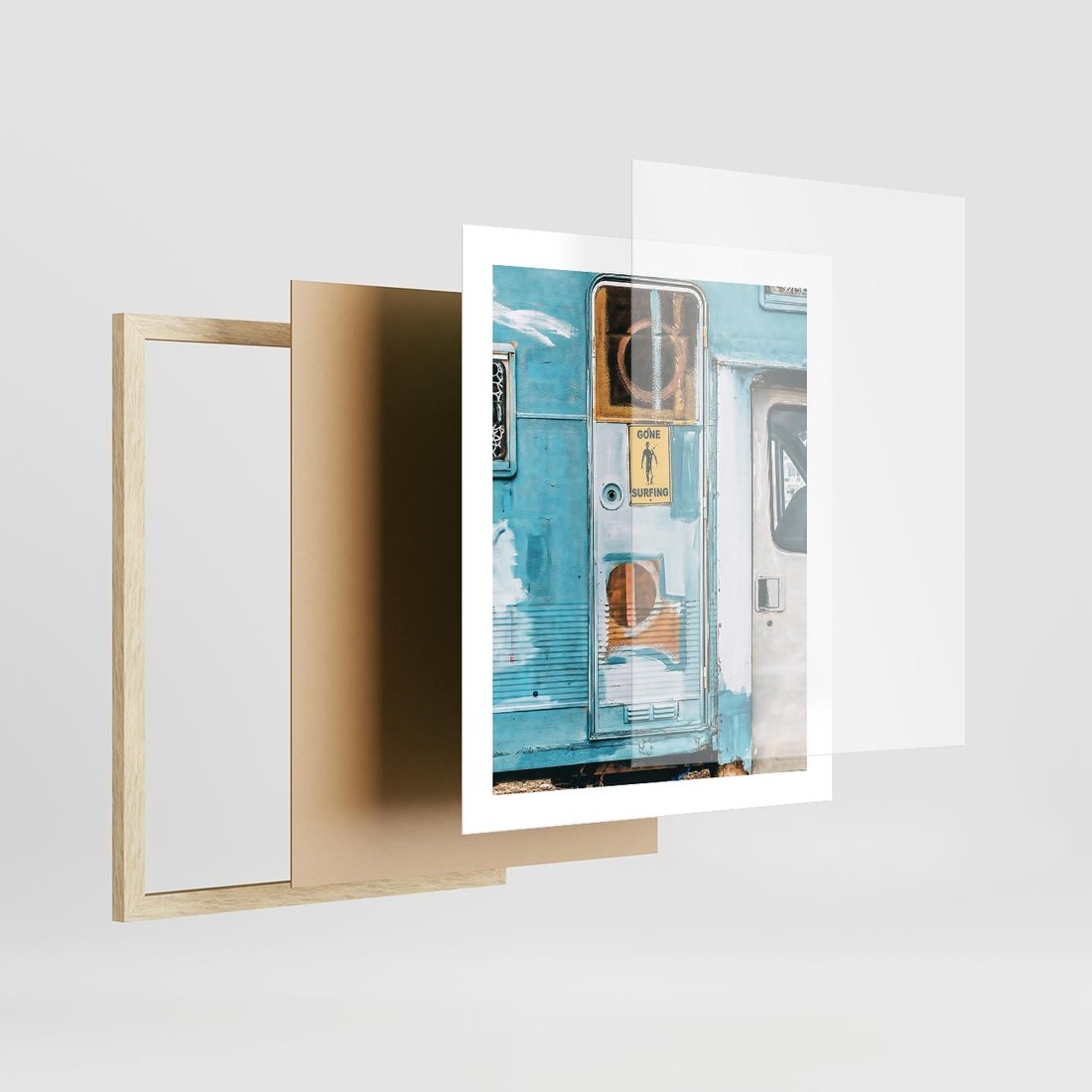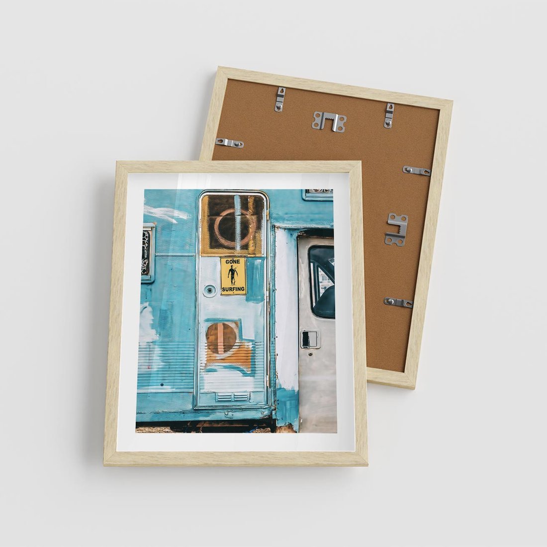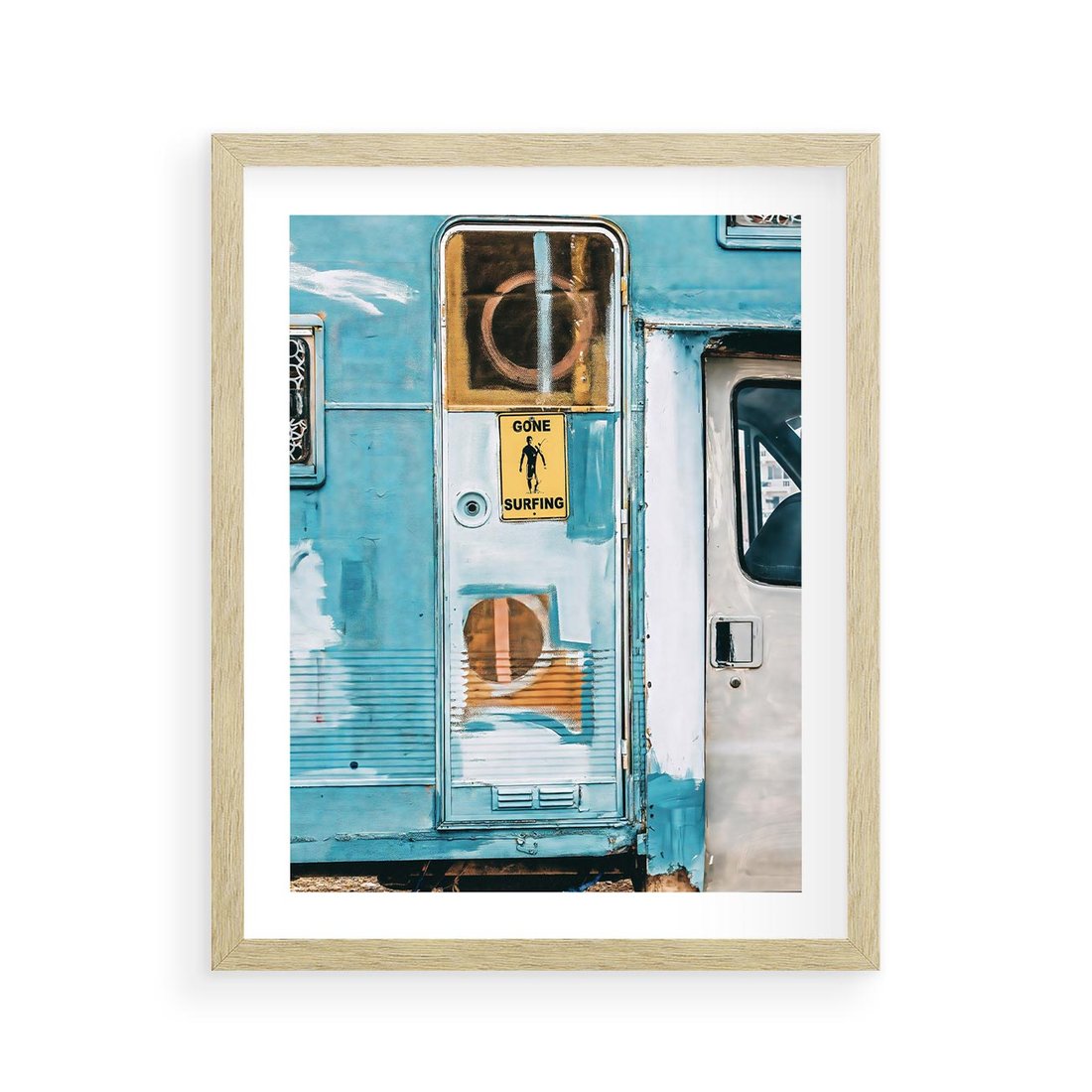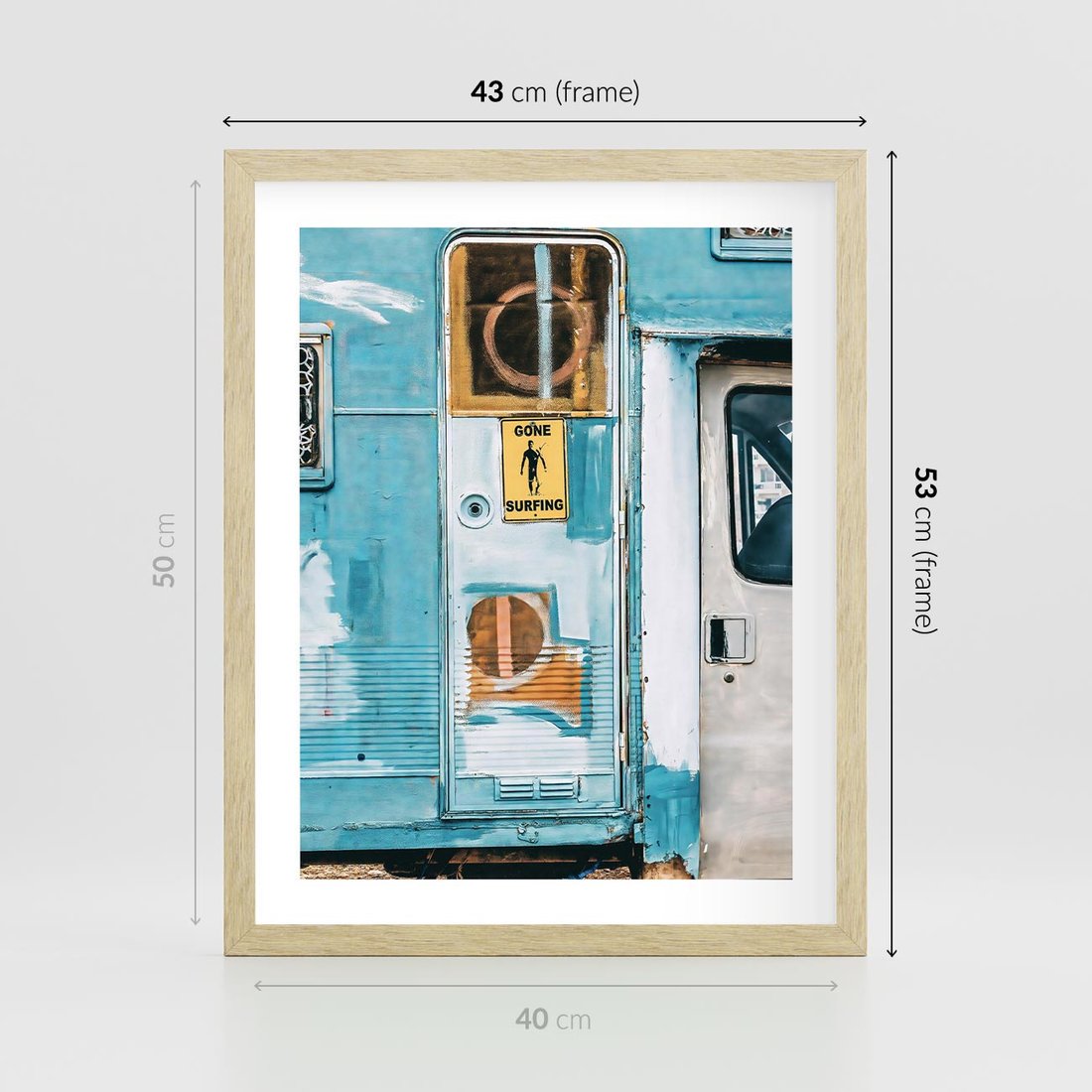 Plakat w ramie 40x50 - Nostalgiczna Podróż - stara przyczepa kempingowa, niebieskie kolory - rama drewno