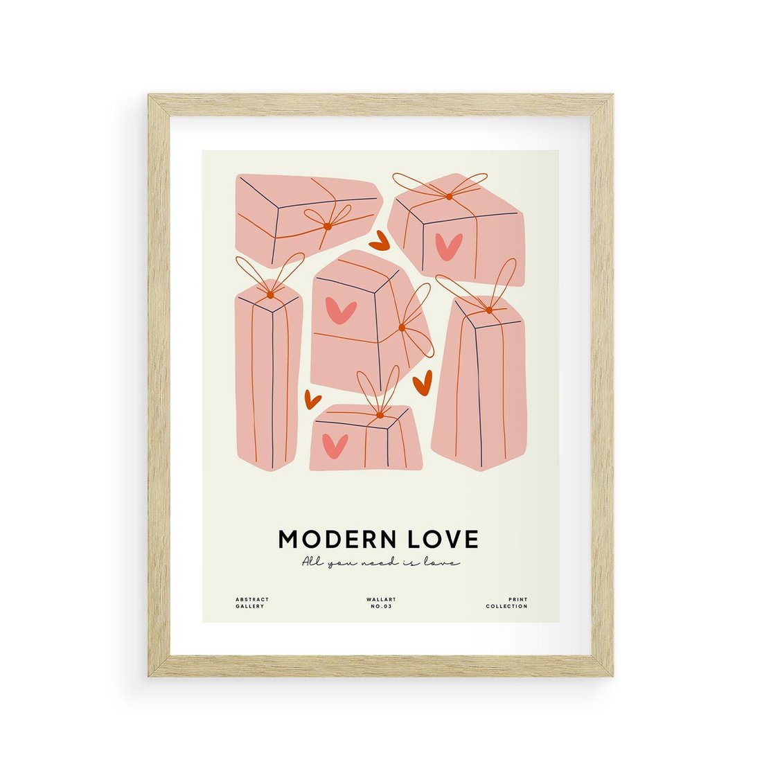 Ta nowoczesna grafika w pastelowych odcieniach ukazuje serduszka i prezenty, tworząc dynamiczną kompozycję. "Nowoczesna Miłość" to hołd dla uczucia w stylu współczesnym, z subtelną typografią "Modern Love". Obraz ten wniesie do wnętrza dawkę radości i romantyzmu, jednocześnie podkreślając nowoczesny charakter miłości.