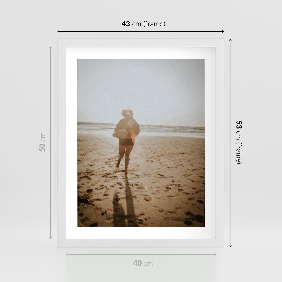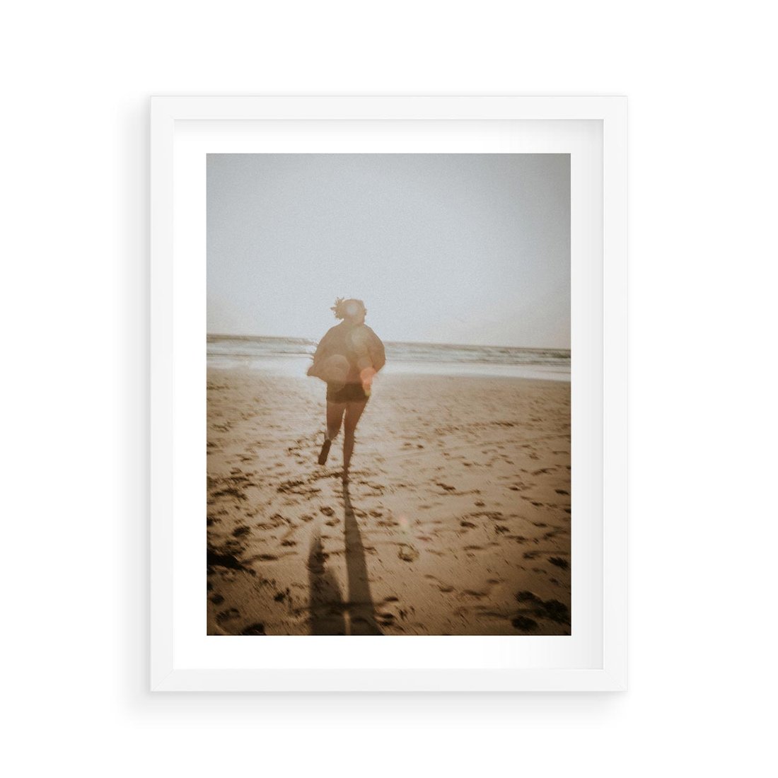 Plakat w ramie 40x50 - O Zachodzie Słońca - klimatyczna fotografia, postać biegnie po plaży - rama biała