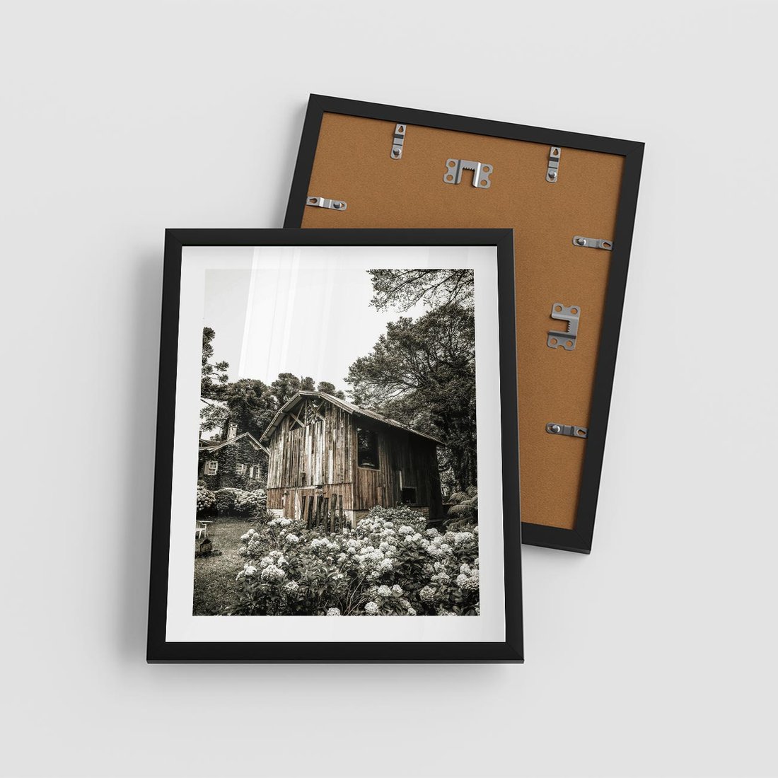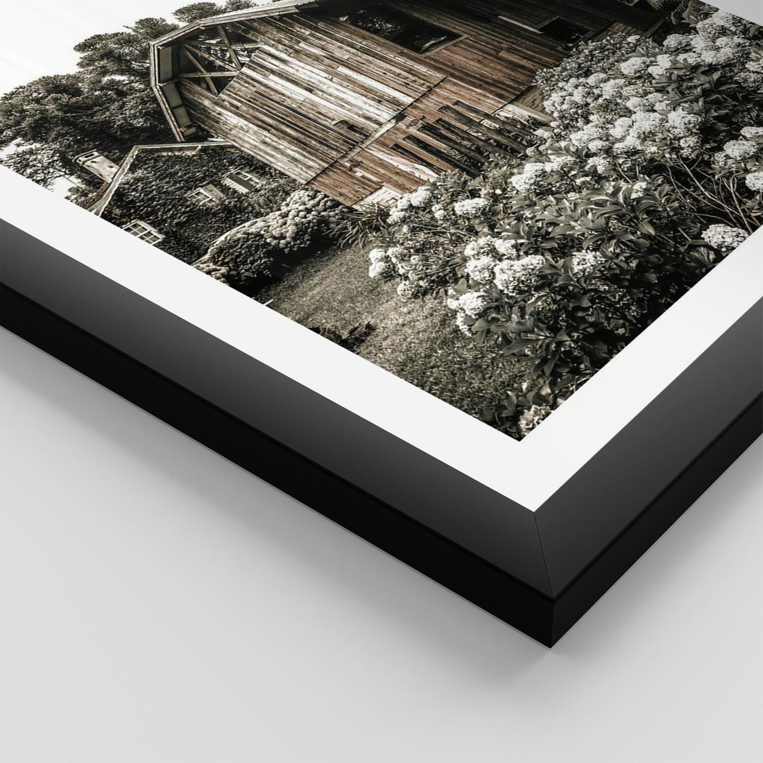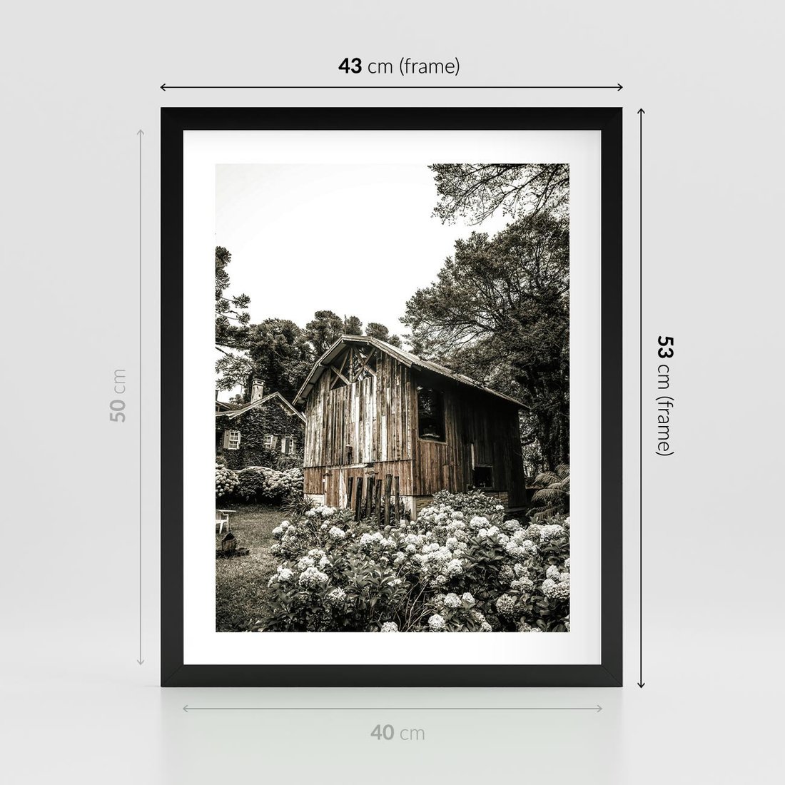Plakat w ramie 40x50 - Oaza Uroku: Drewniana Chatka i Ogród - domek, ogród - rama czarna
