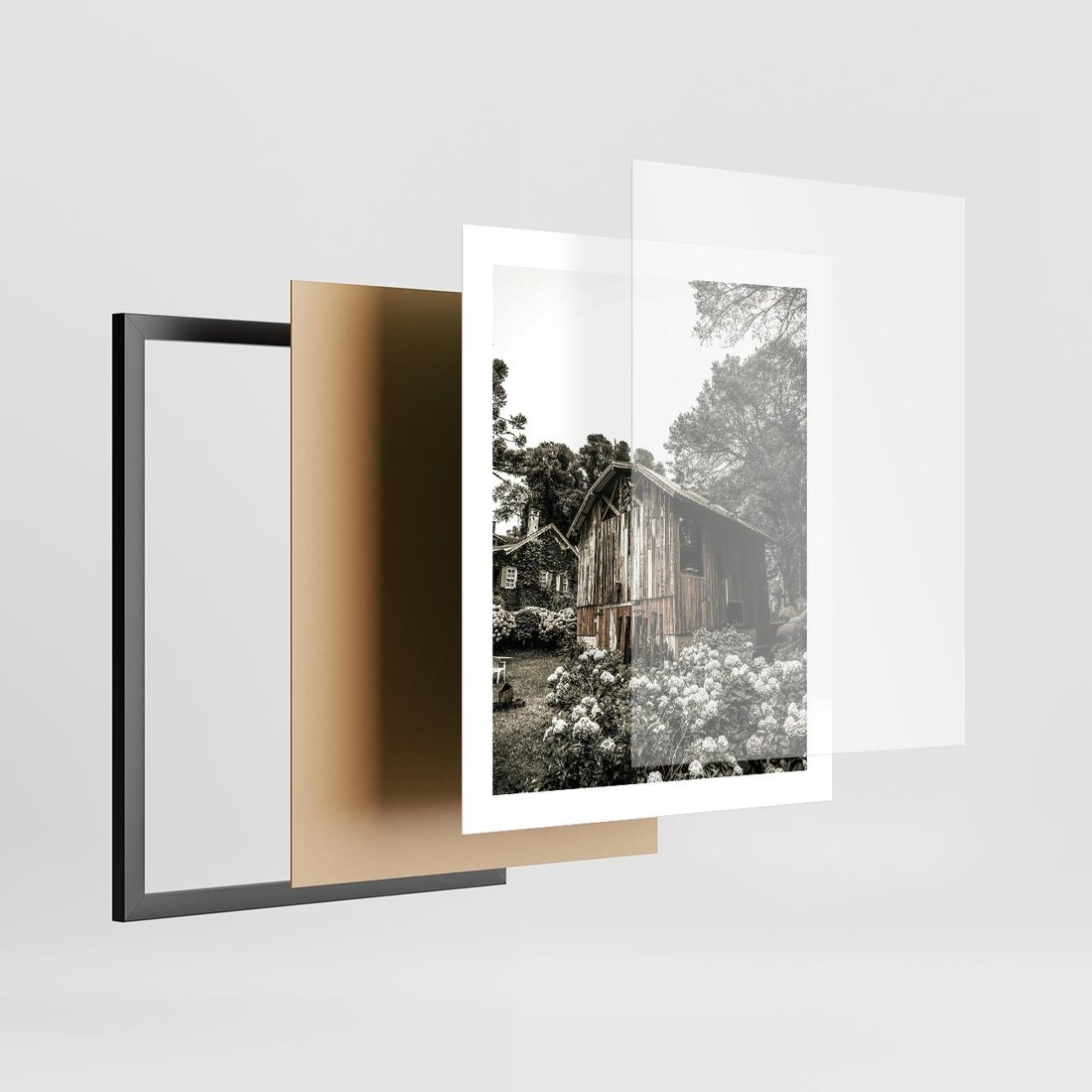 - Plakat w ramie 40x50 - Oaza Uroku: Drewniana Chatka i Ogród