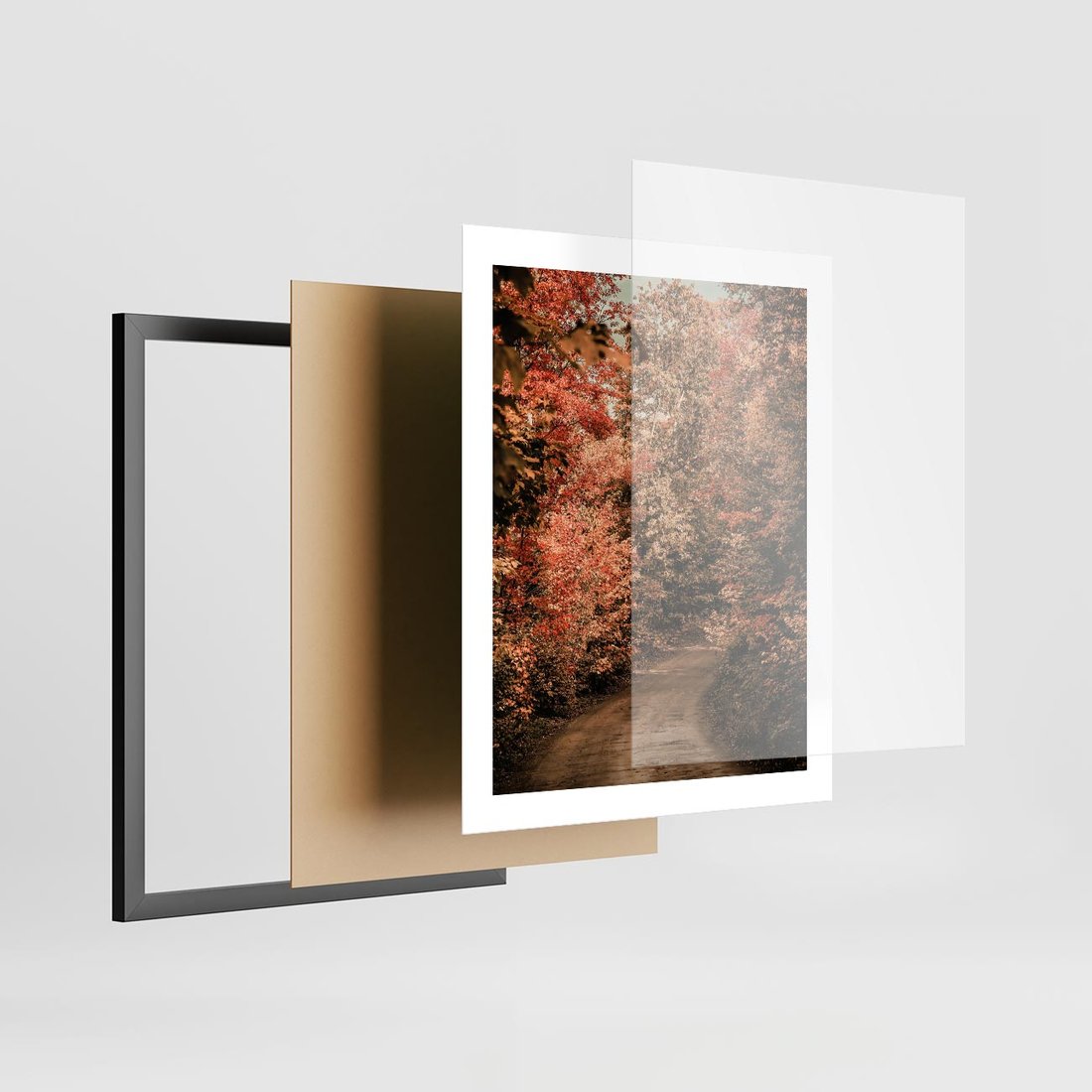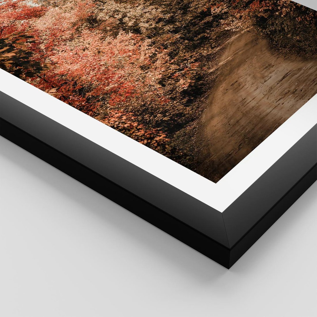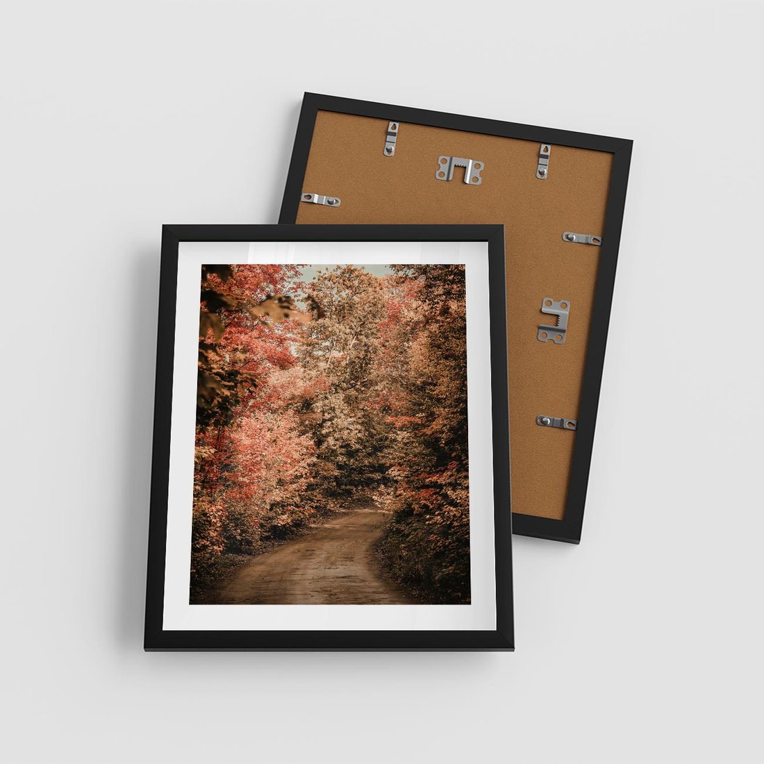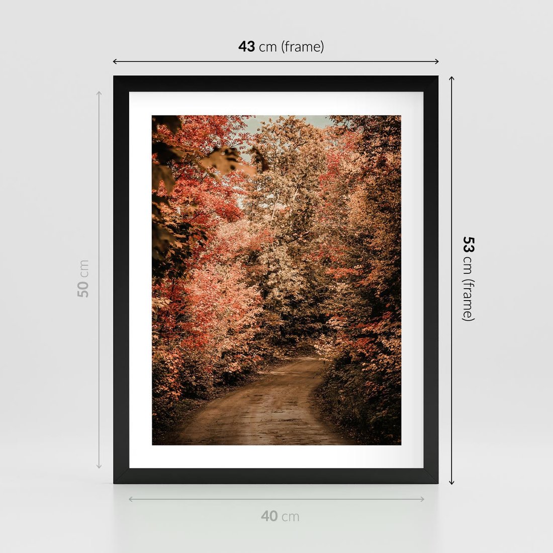 Plakat w ramie 40x50 - Obraz przedstawia jesienne drzewa i czerwone liście na ścieżce w lesie. Ta sceneria doskonale oddaje urok i kolorystykę jesieni w lesie. - las, jesień - rama czarna