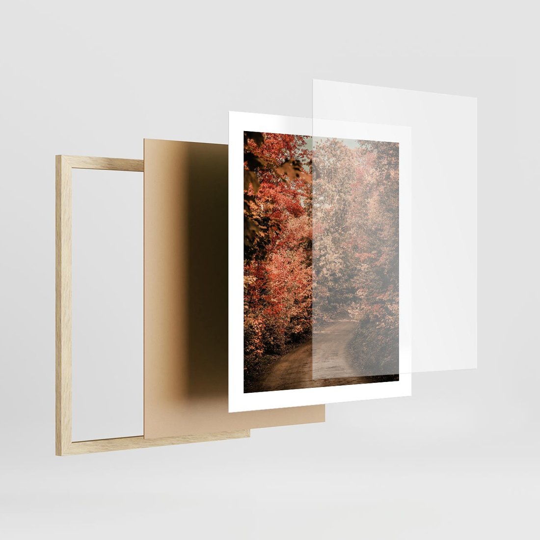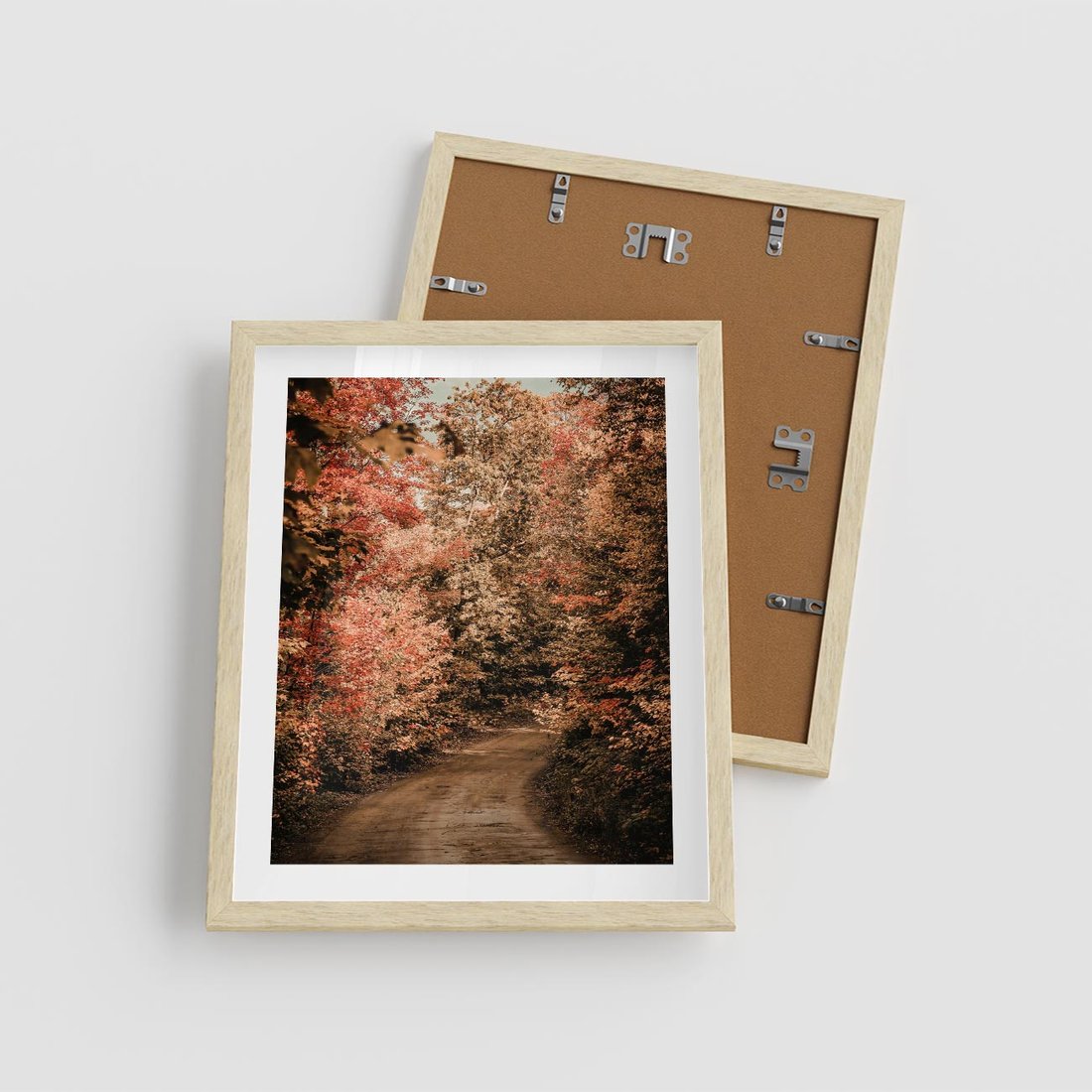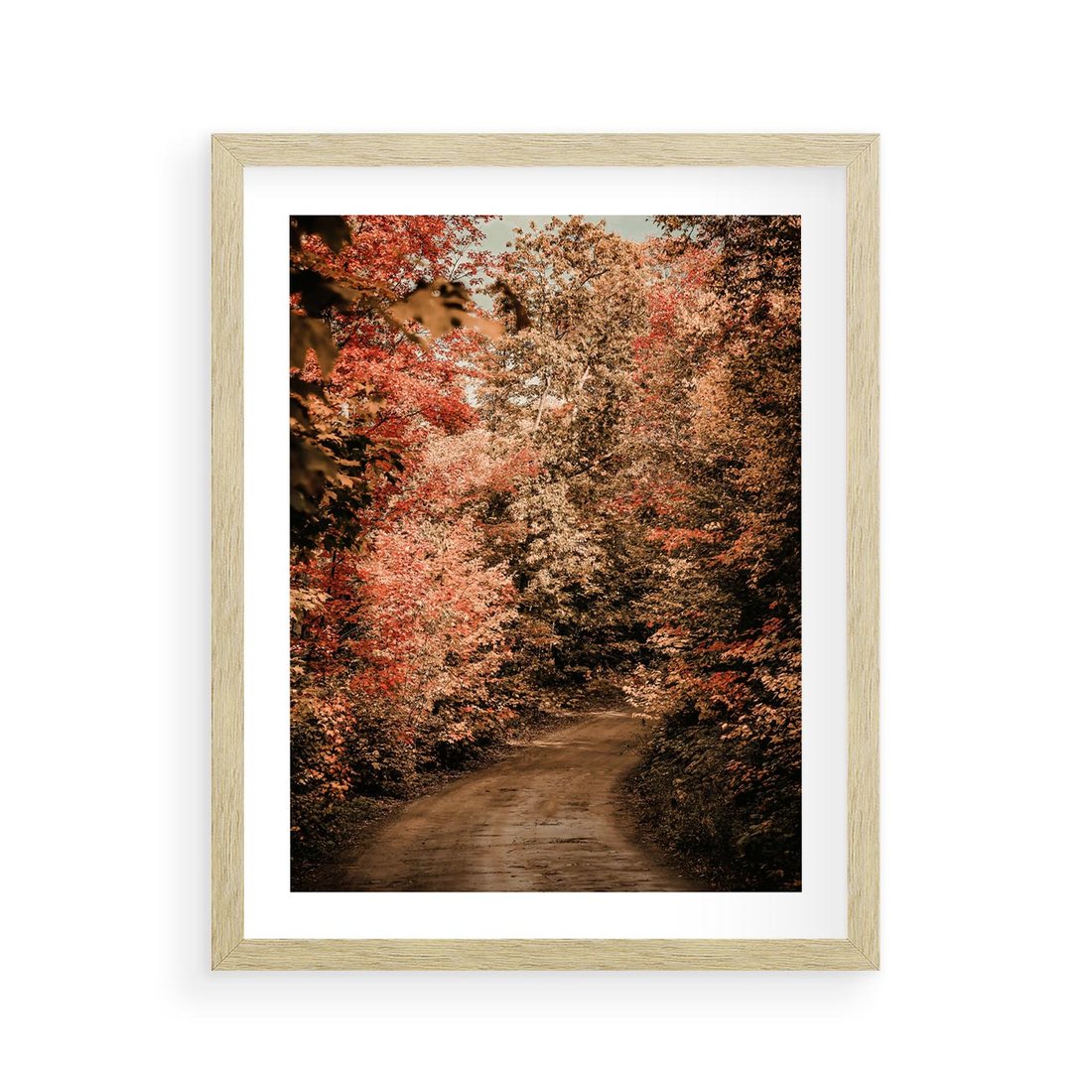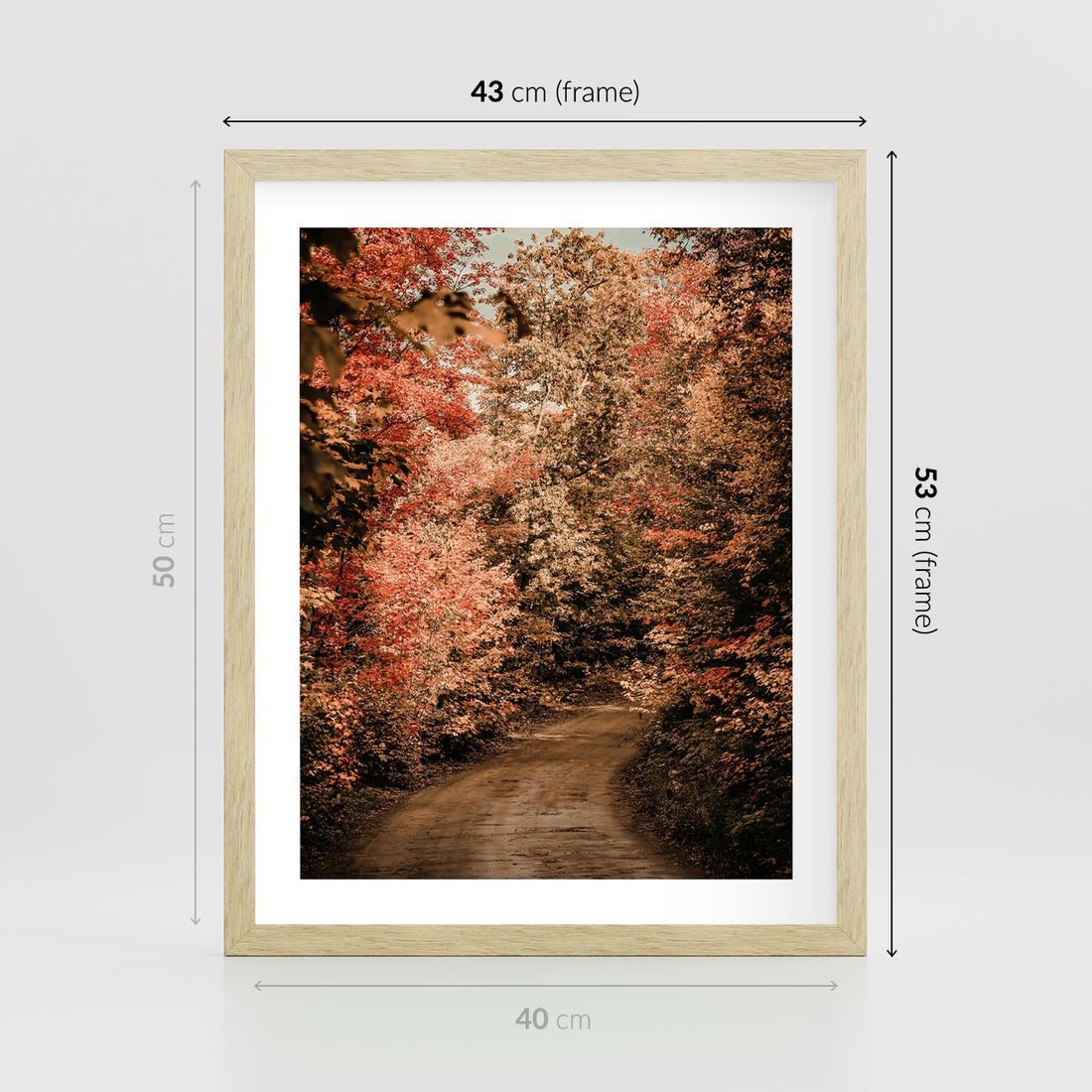 Plakat w ramie 40x50 - Obraz przedstawia jesienne drzewa i czerwone liście na ścieżce w lesie. Ta sceneria doskonale oddaje urok i kolorystykę jesieni w lesie. - las, jesień - rama drewno