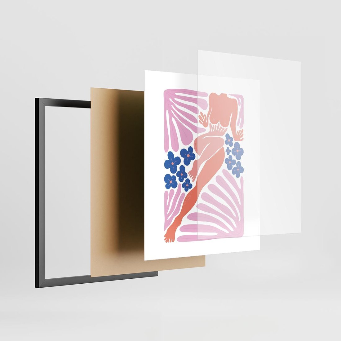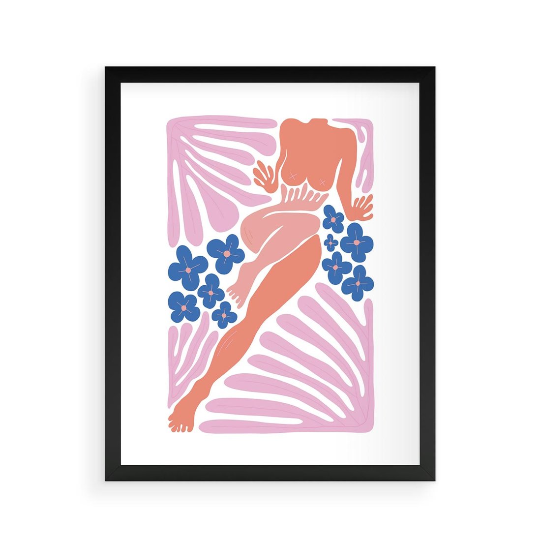 Ten nowoczesny akt w kobiecym stylu wykorzystuje graficzne kształty i pastelowe kolory, tworząc kompozycję z delikatnymi kwiatami. To obraz, który łączy piękno ciała z harmonią natury. Doskonale oddaje subtelność i siłę kobiecej postaci, jednocześnie wprowadzając do wnętrza dawkę kolorów i elegancji.
