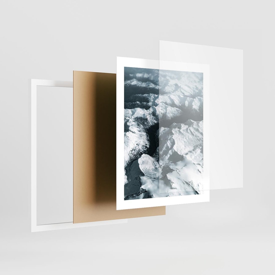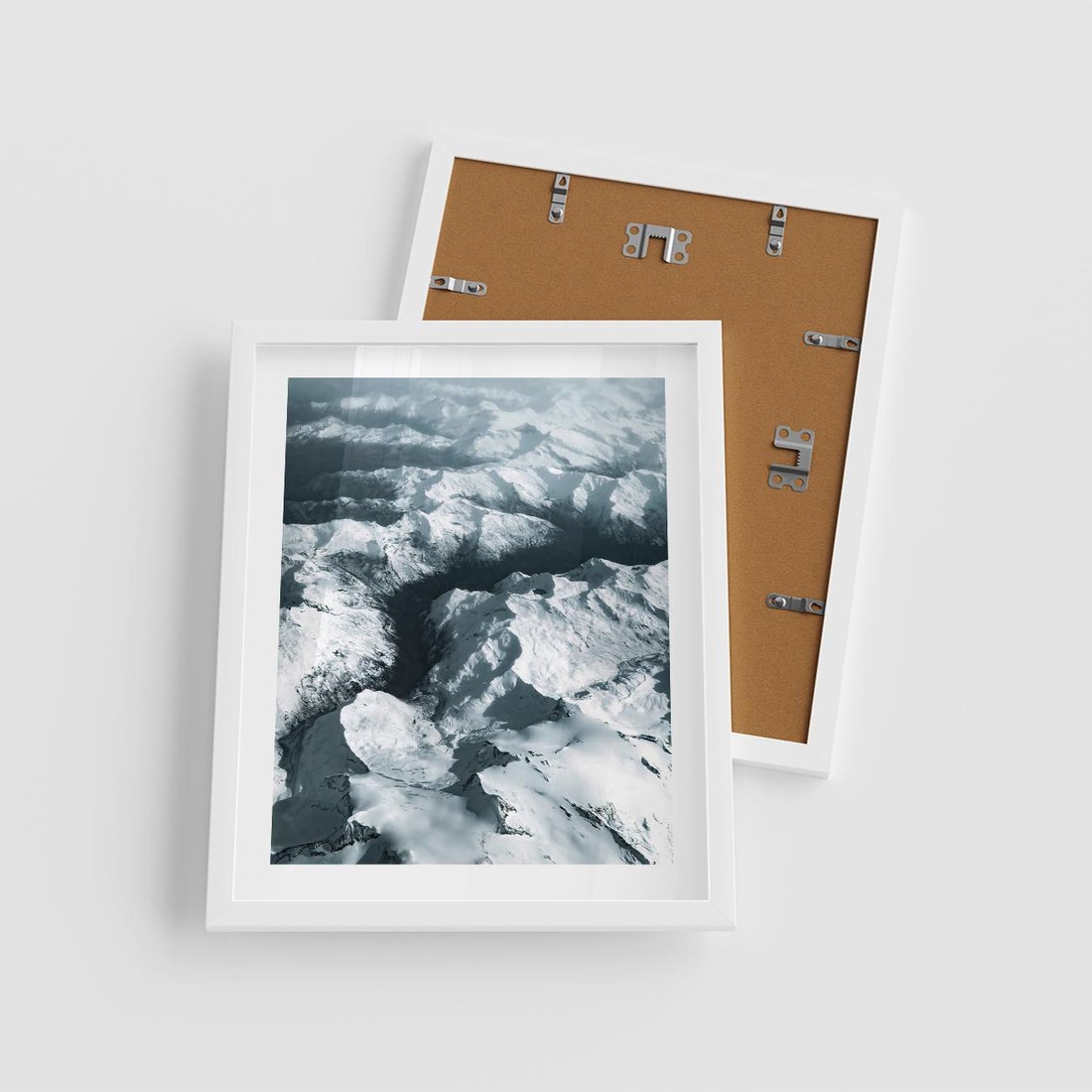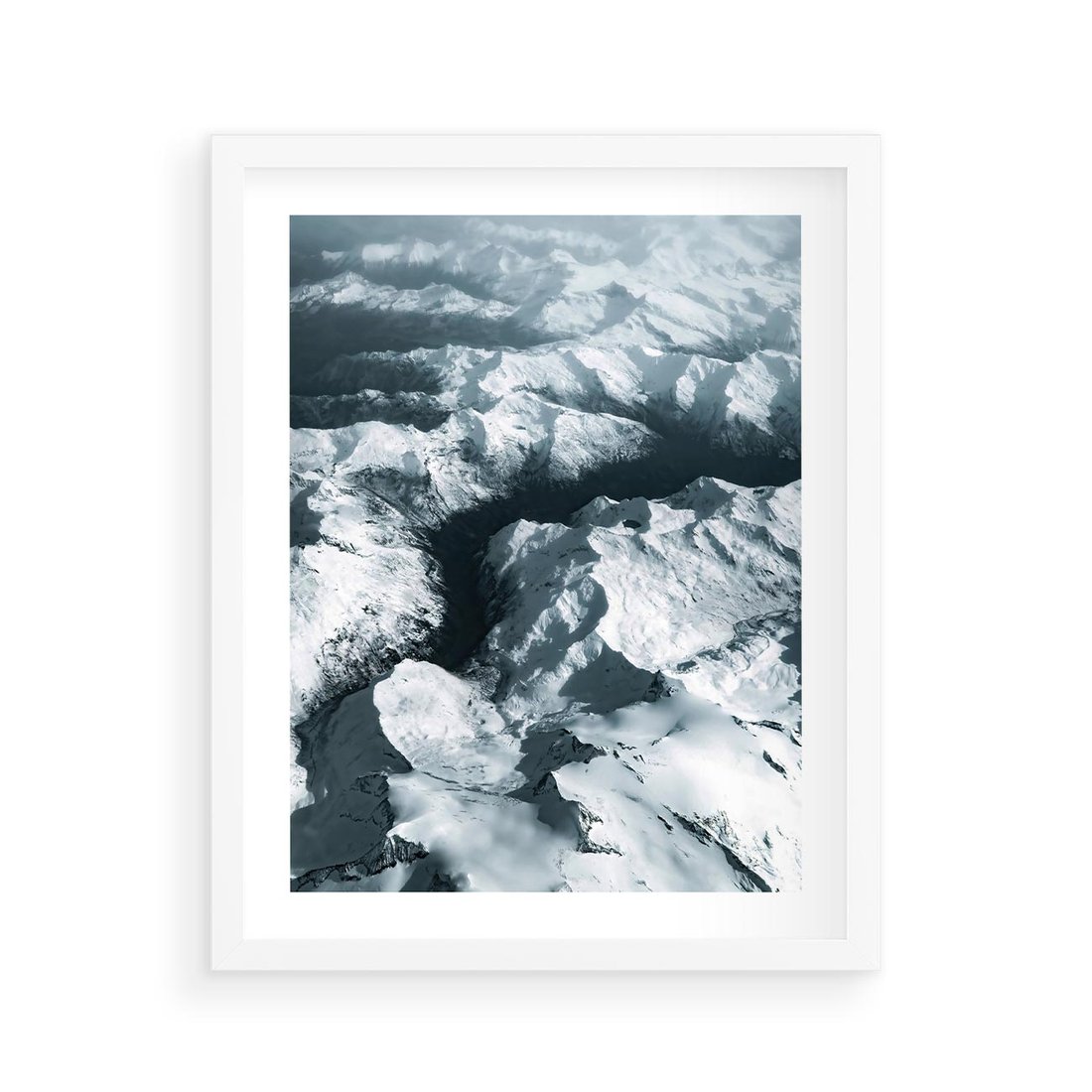 Plakat w ramie 40x50 - Ośnieżone Szczyty z Wysoka - ośnieżone szczyt górskie, zdjęcie z lotu ptaka - rama biała