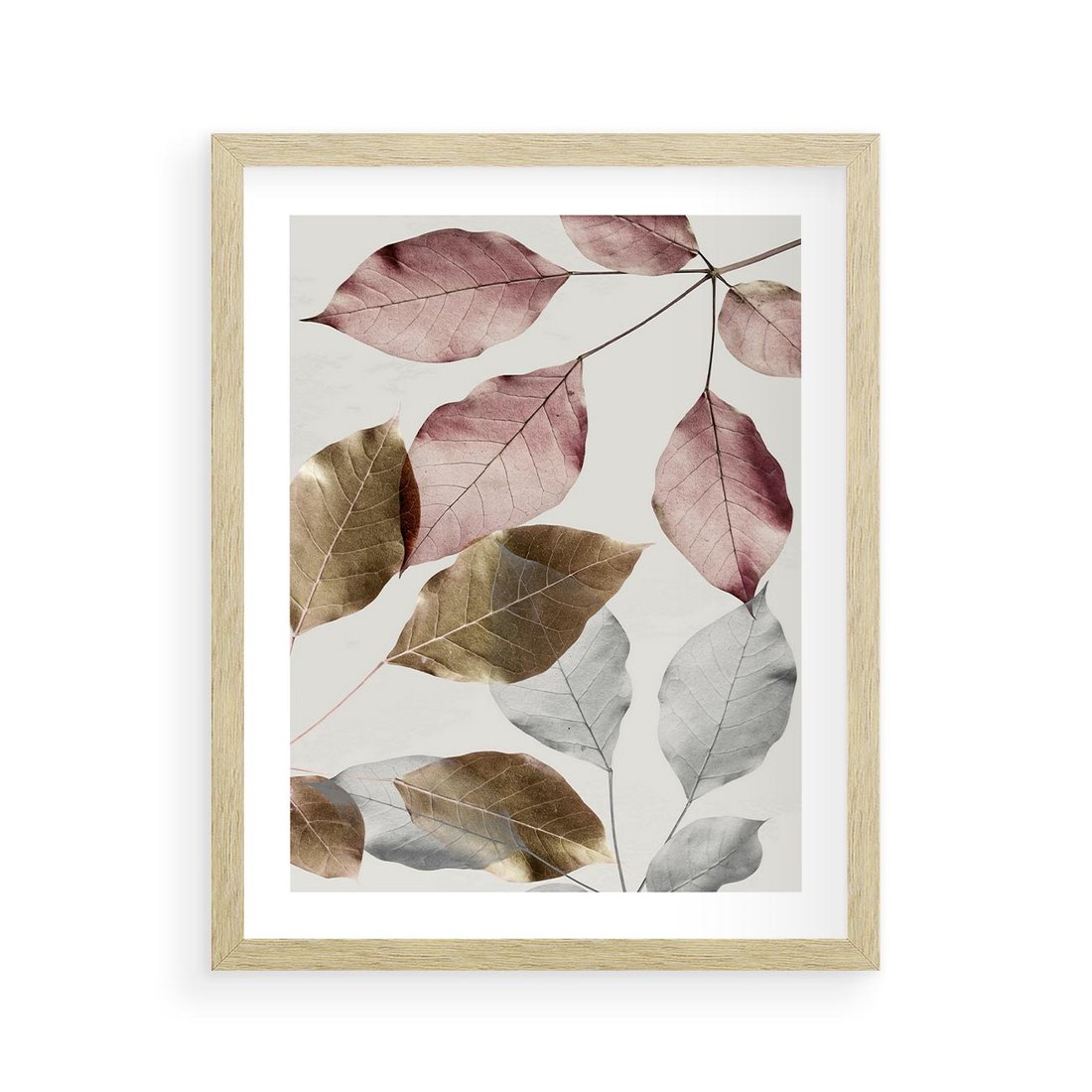Plakat w ramie 40x50 - Pastelowe Liście z Nutką Złota - liście, pastelowe kolory - rama drewno