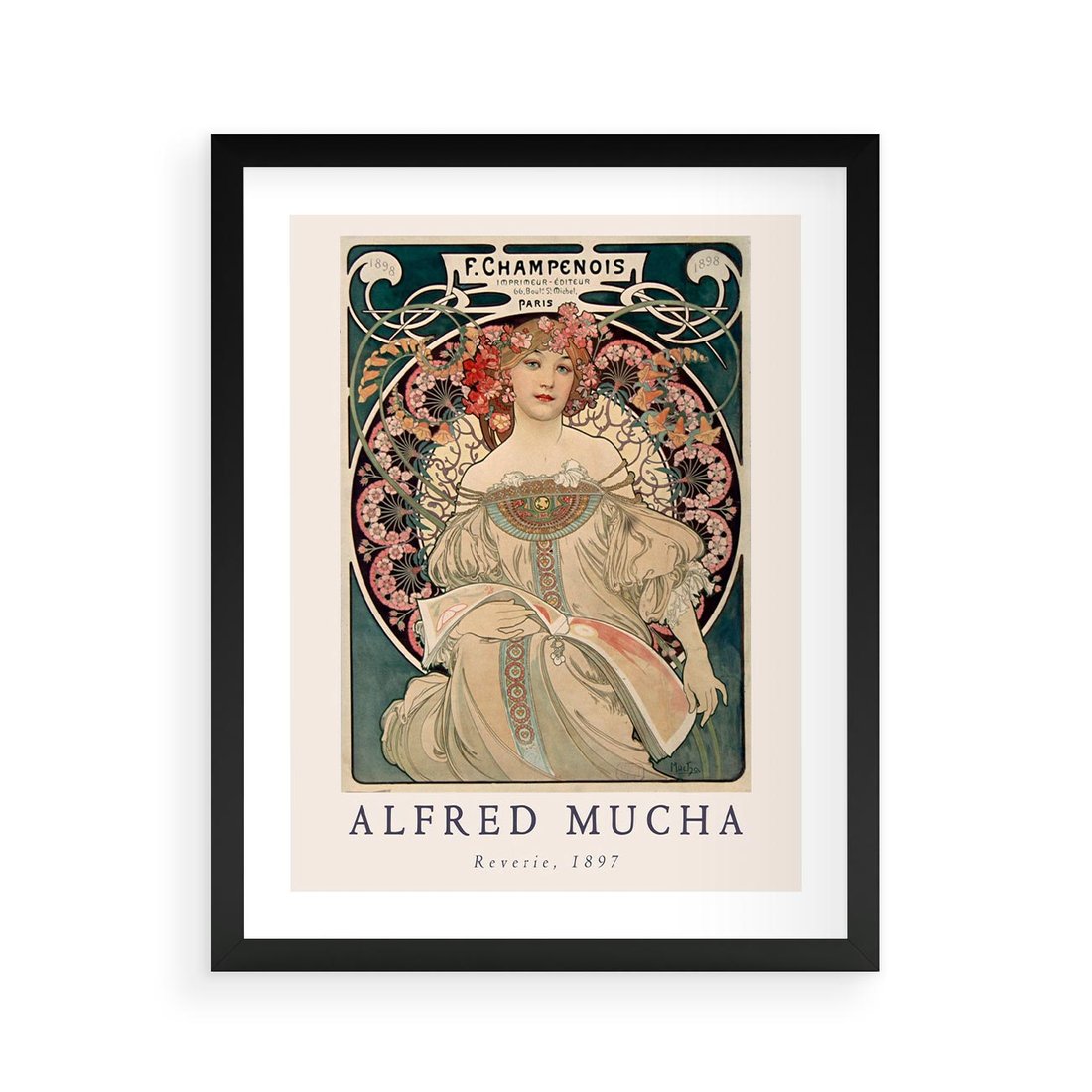 Ta reprodukcja dzieła Alfonsa Muchy przenosi nas w świat art nouveau z wyrafinowaną liniową estetyką i uroczymi damami w kwiatowych kompozycjach.