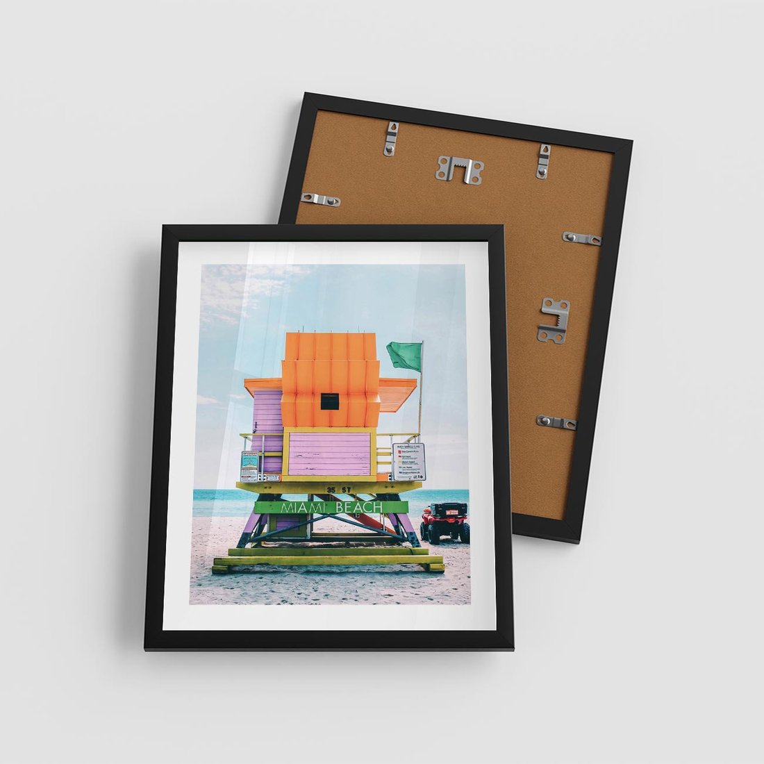 Plakat w ramie 40x50 - Plaża Miami w Słoneczny Dzień - domek ratownika, kolorowy - rama czarna