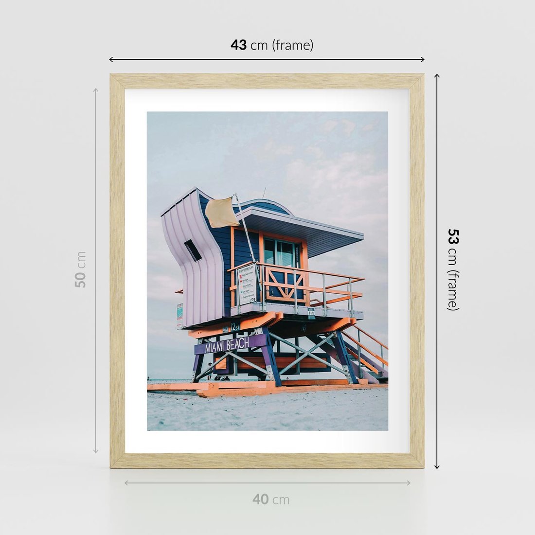 Plakat w ramie 40x50 - Plażowa Kolorystyka: Budka Ratownika w Pastelach - pastelowa budka ratownika, plaża Miami - rama drewno