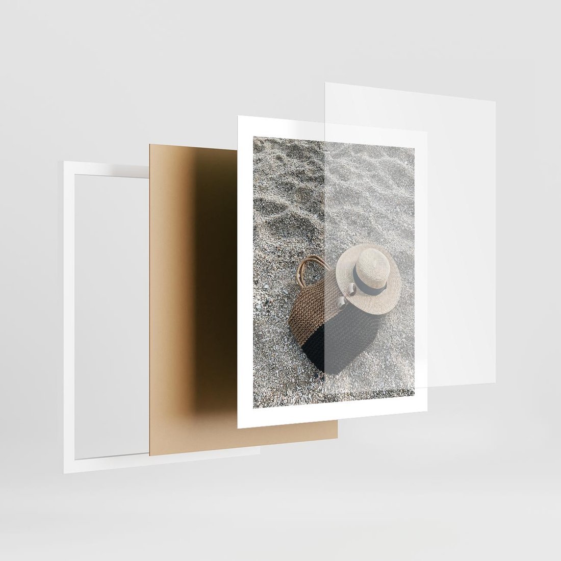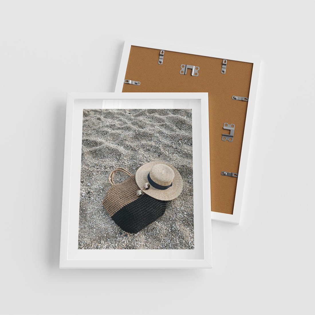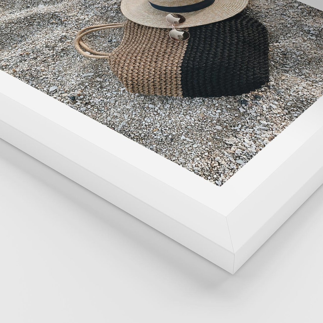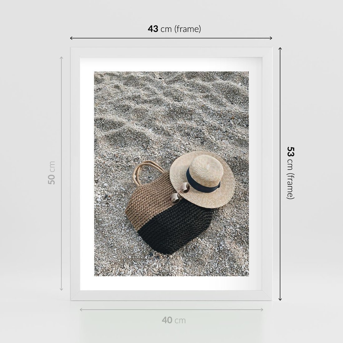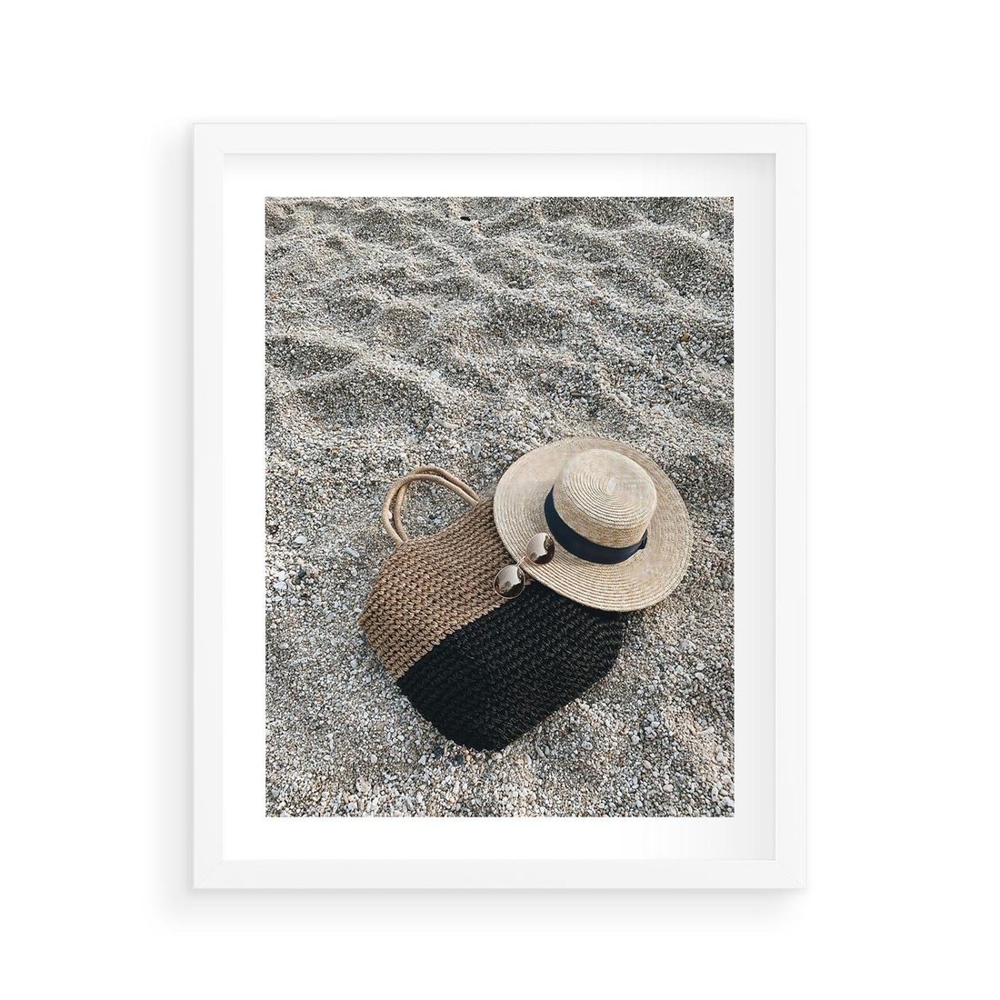 Plakat w ramie 40x50 - Plażowe Przygotowania - torba plażowa, kapelusz - rama biała