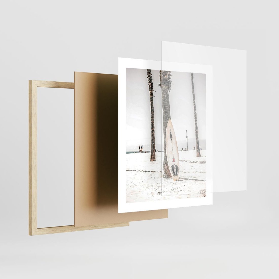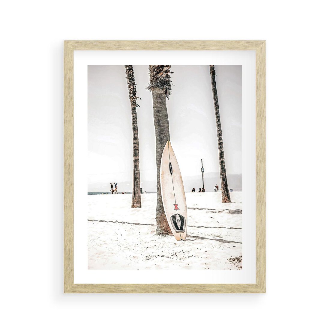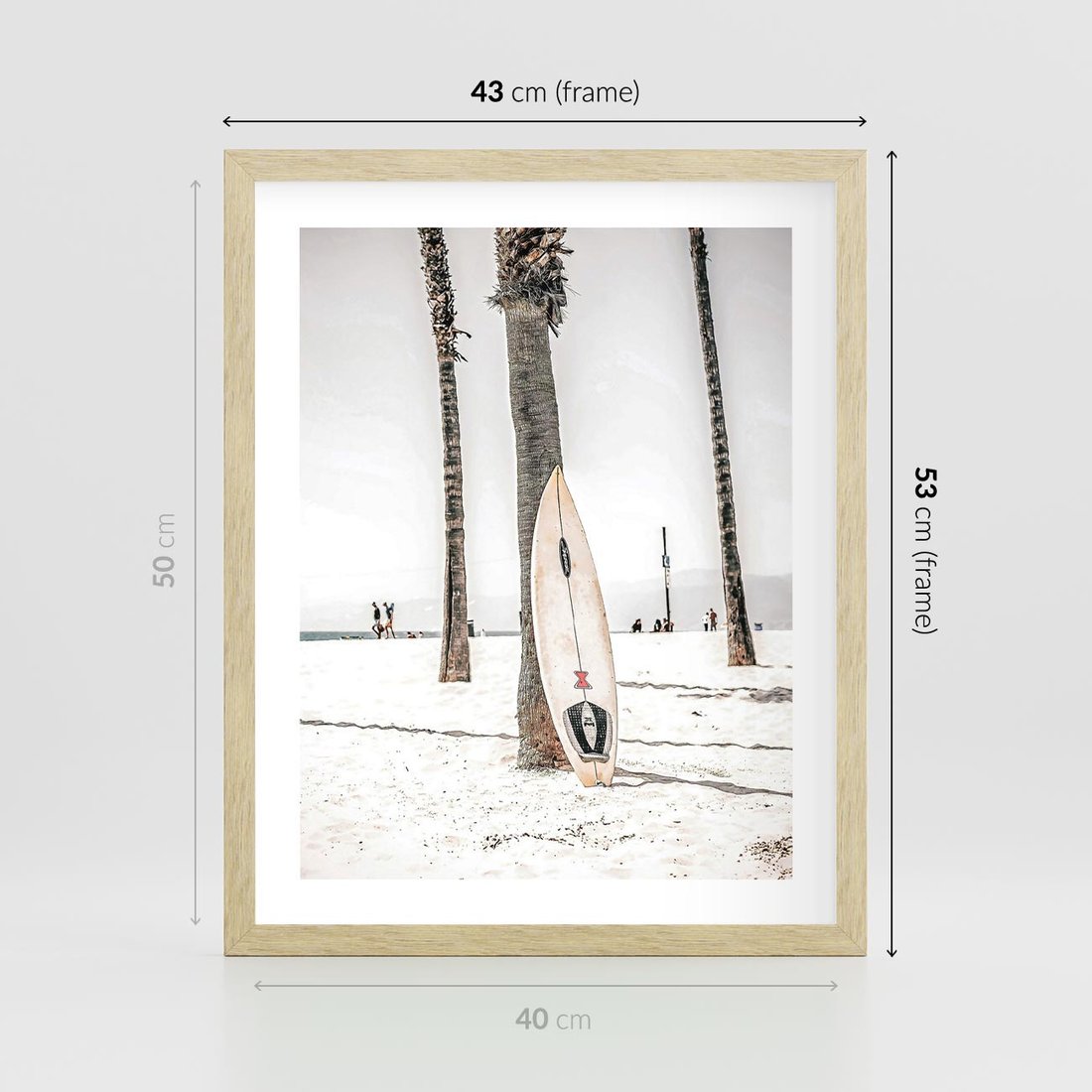 Plakat w ramie 40x50 - Plażowy Relaks - deska surfingowa, oparta o palmę - rama drewno
