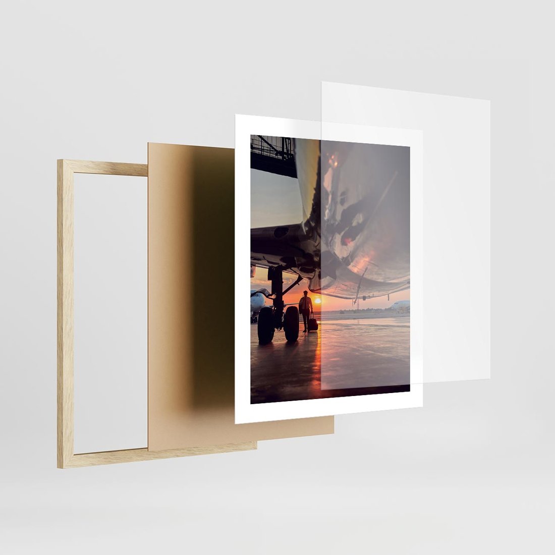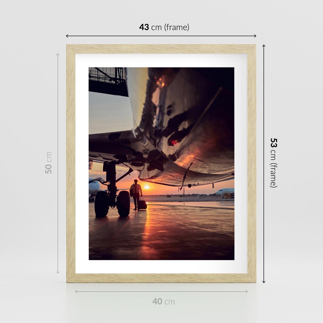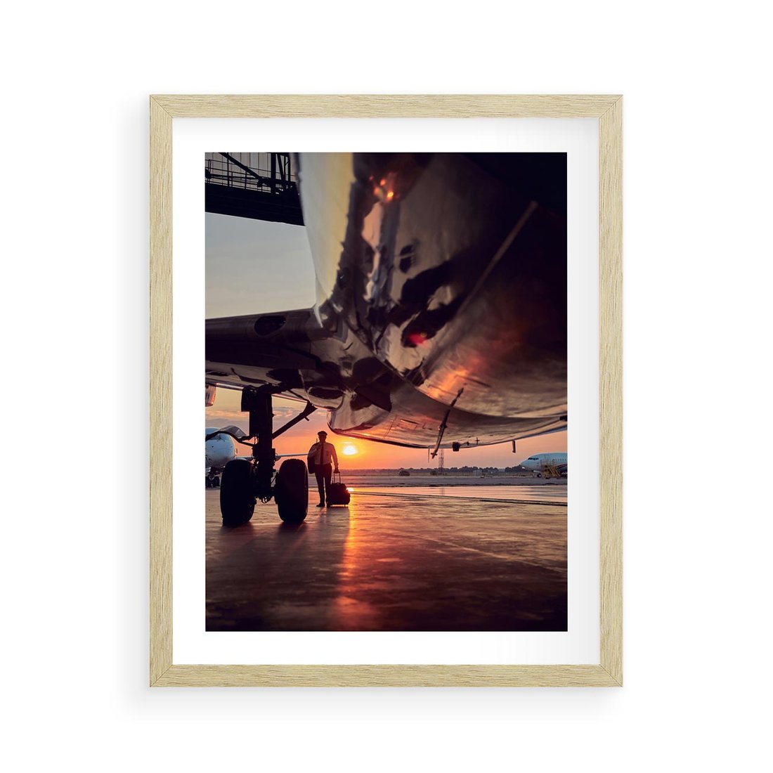 Plakat w ramie 40x50 - Podróż ku Zachodzącemu Słońcu - samolot, scena na lotnisku - rama drewno