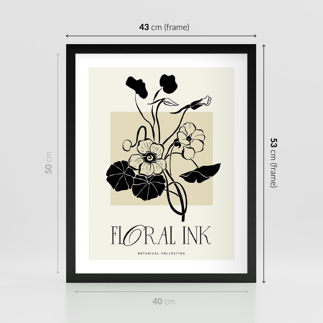 Twórcza harmonia kwiatów i typografii w minimalistycznym stylu. Monochromatyczne kolory i czarny kontur tworzą elegancką prostotę. To doskonały obraz, który wnosi do wnętrza delikatny powiew natury i estetycznego minimalizmu.