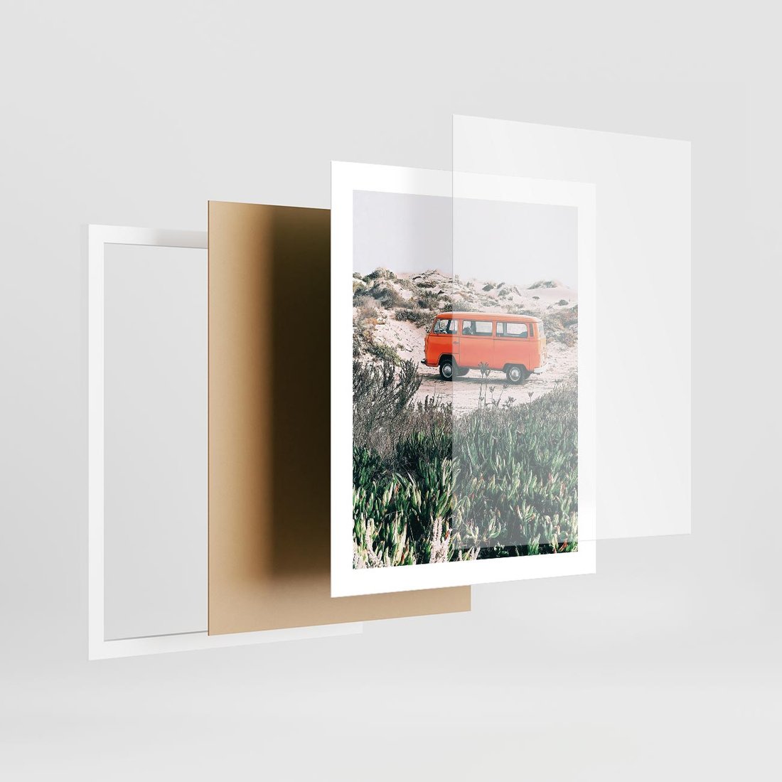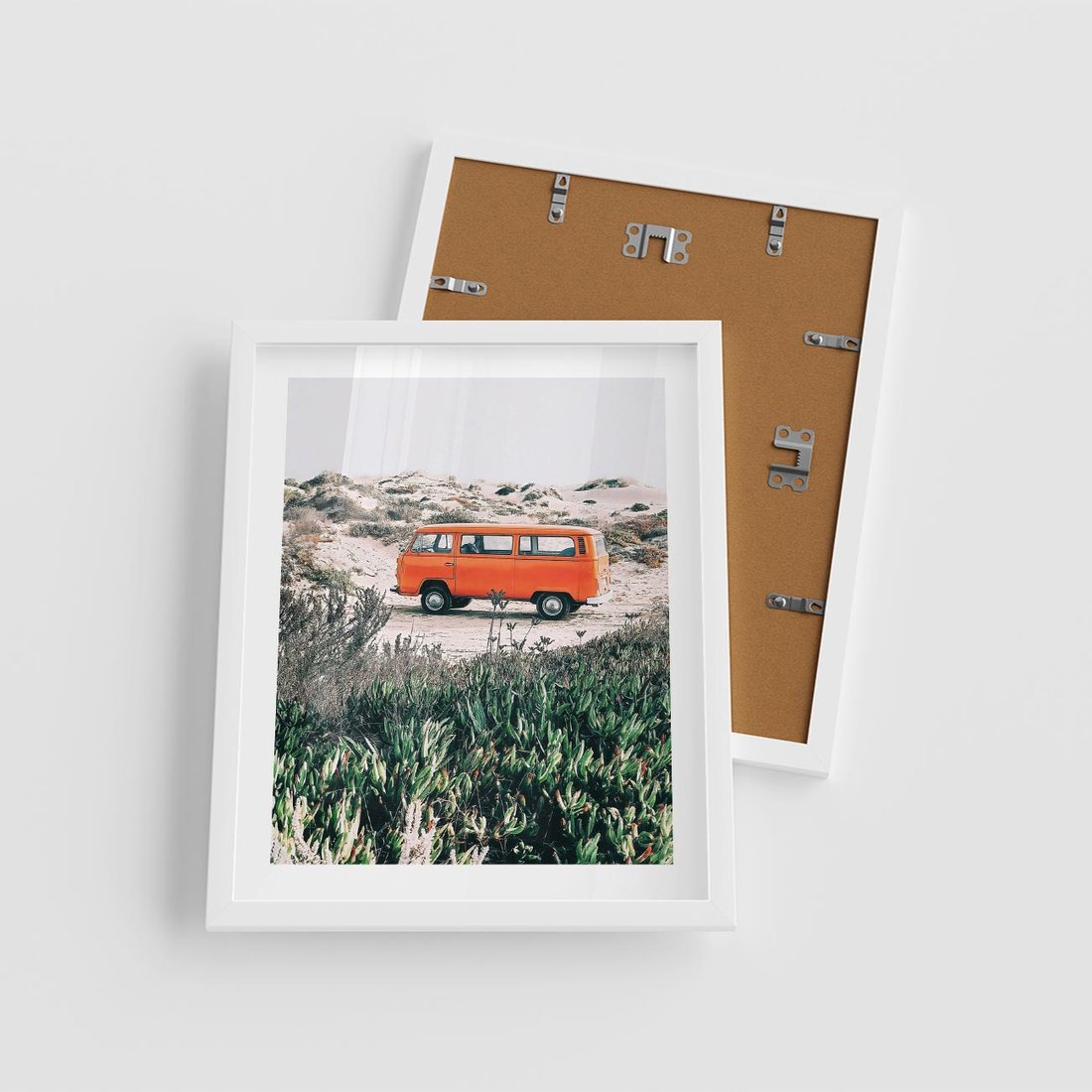 Plakat w ramie 40x50 - Podróże po Pustyni - stary samochód van, pomarańczowy - rama biała