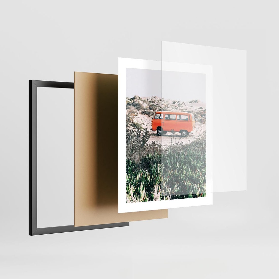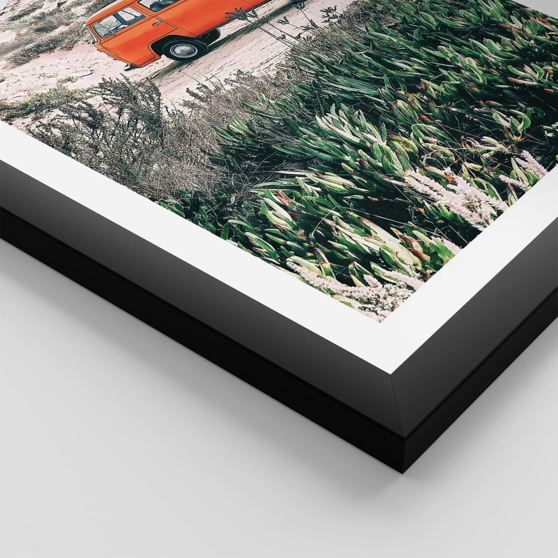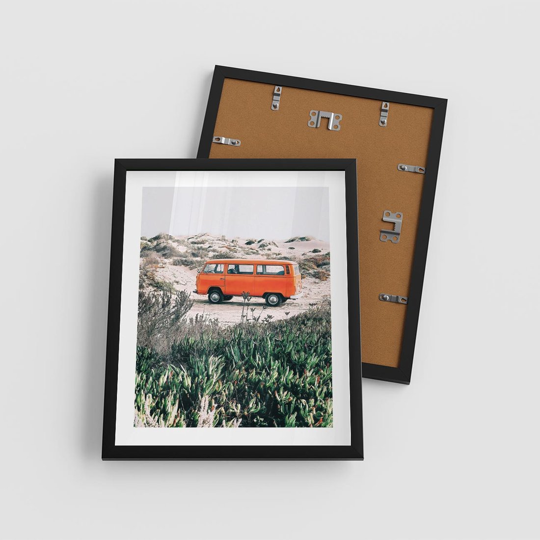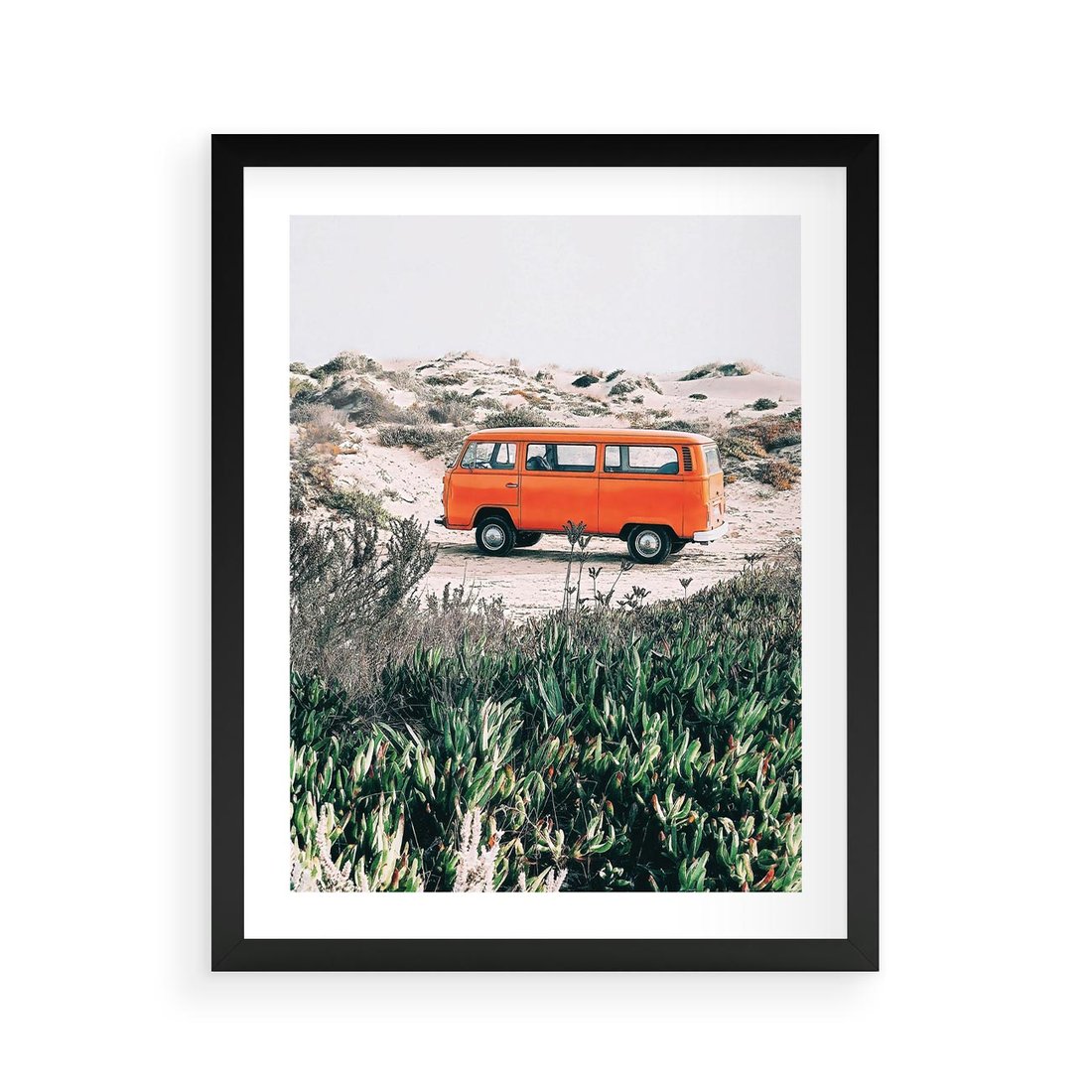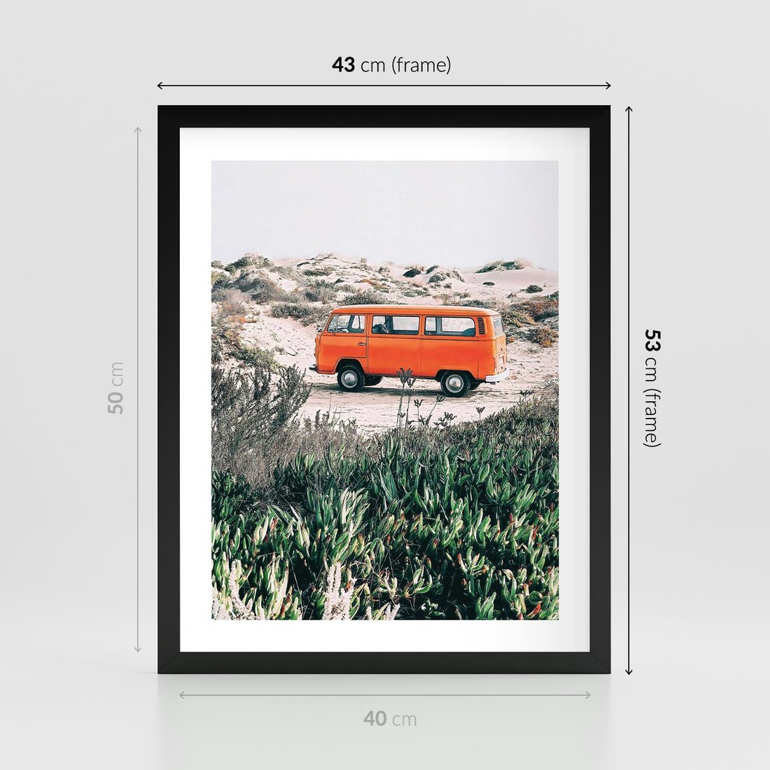 Plakat w ramie 40x50 - Podróże po Pustyni - stary samochód van, pomarańczowy - rama czarna