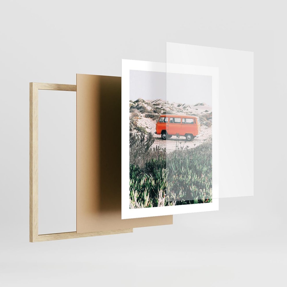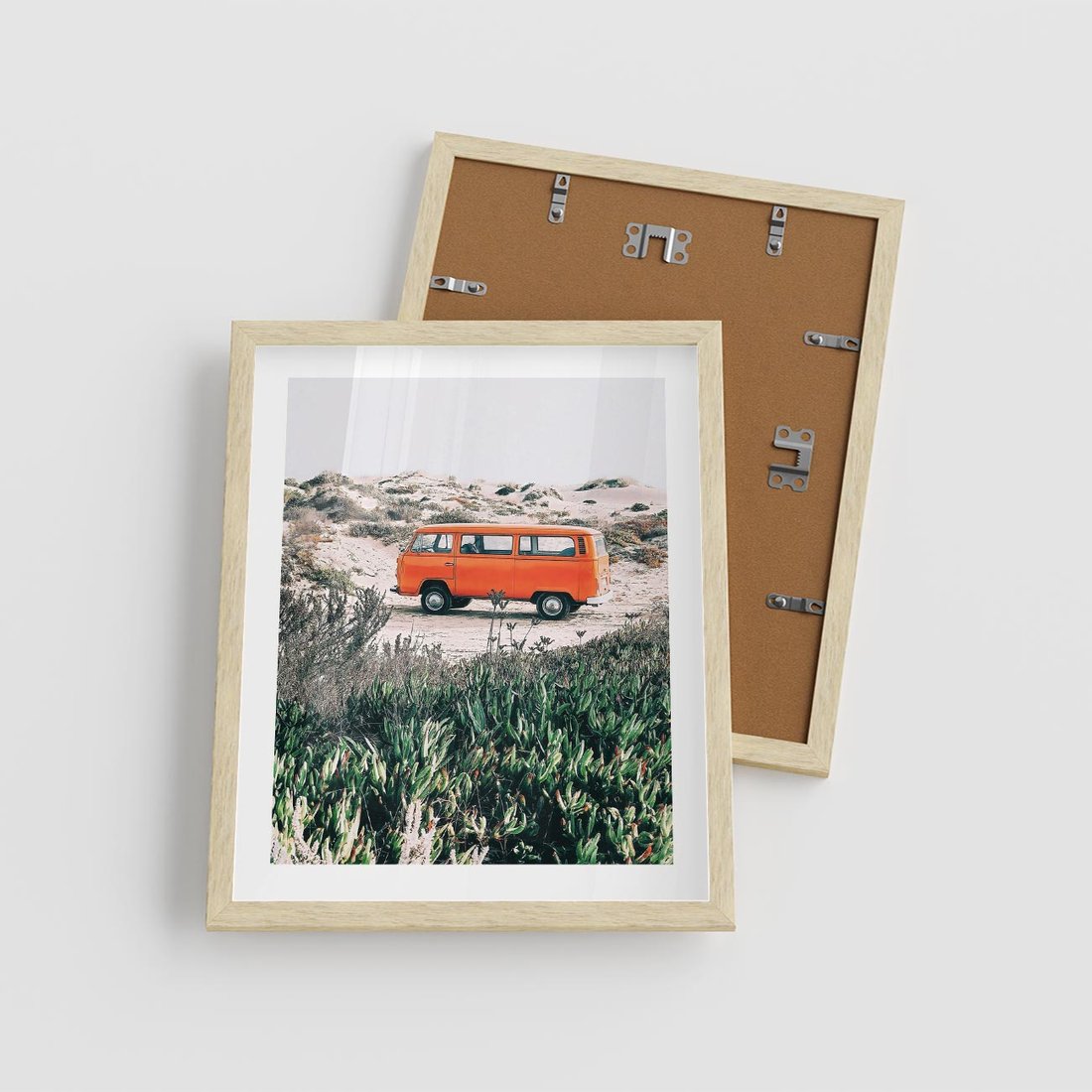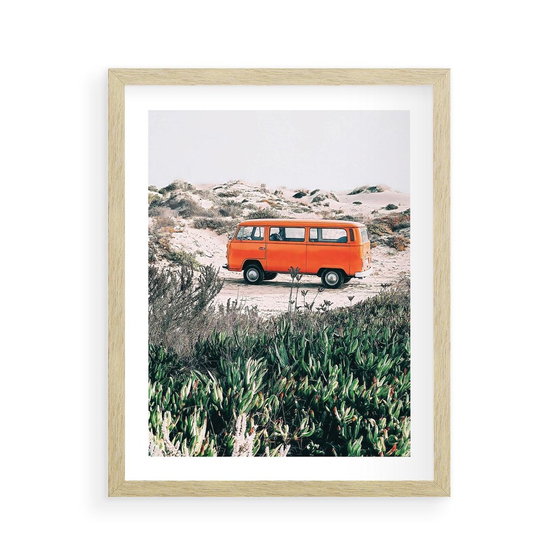 Plakat w ramie 40x50 - Podróże po Pustyni - stary samochód van, pomarańczowy - rama drewno