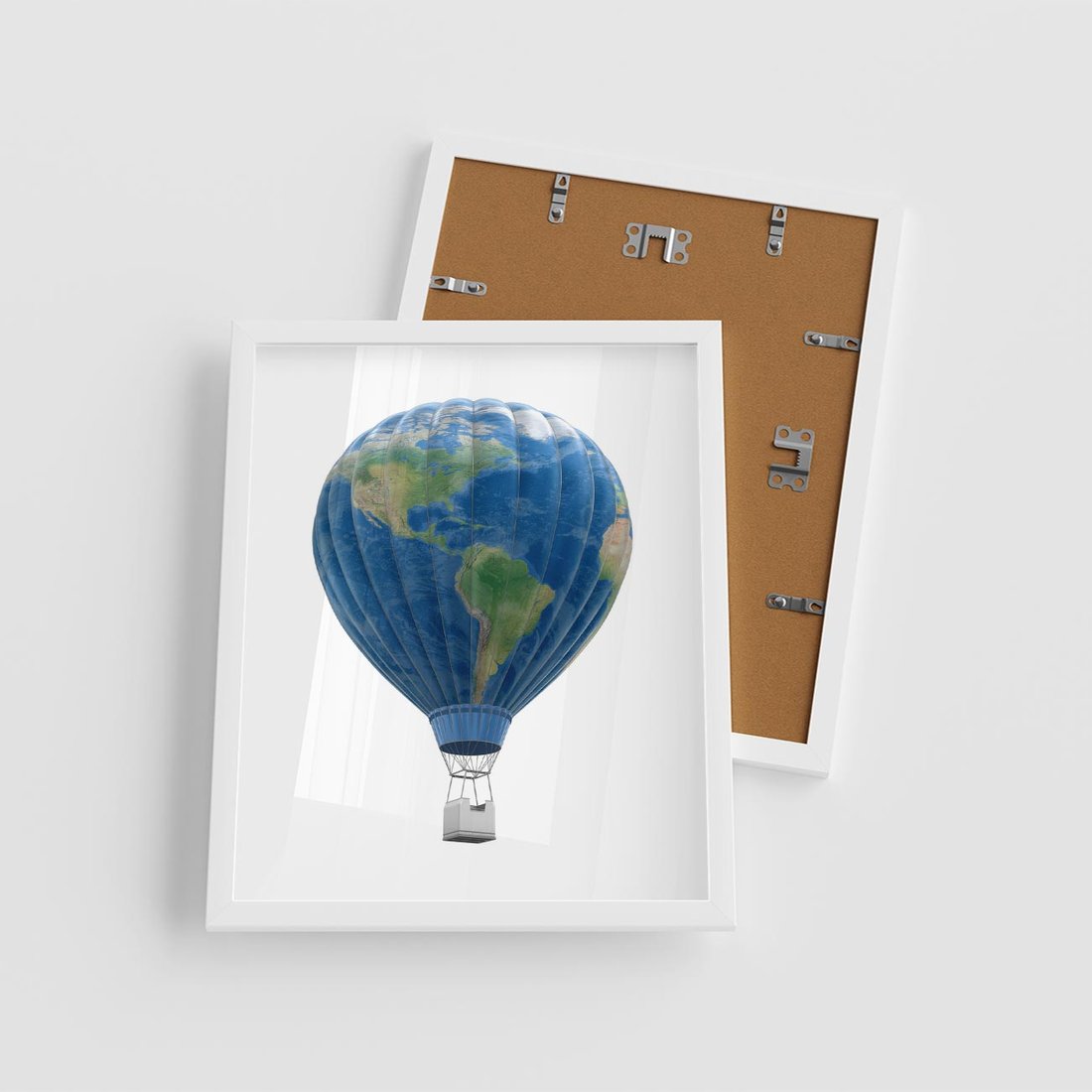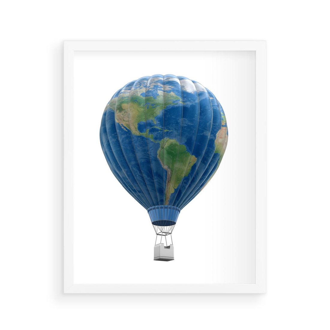 Plakat w ramie 40x50 - Podróżniczy balon nad ziemią - balon, ziemia - rama biała