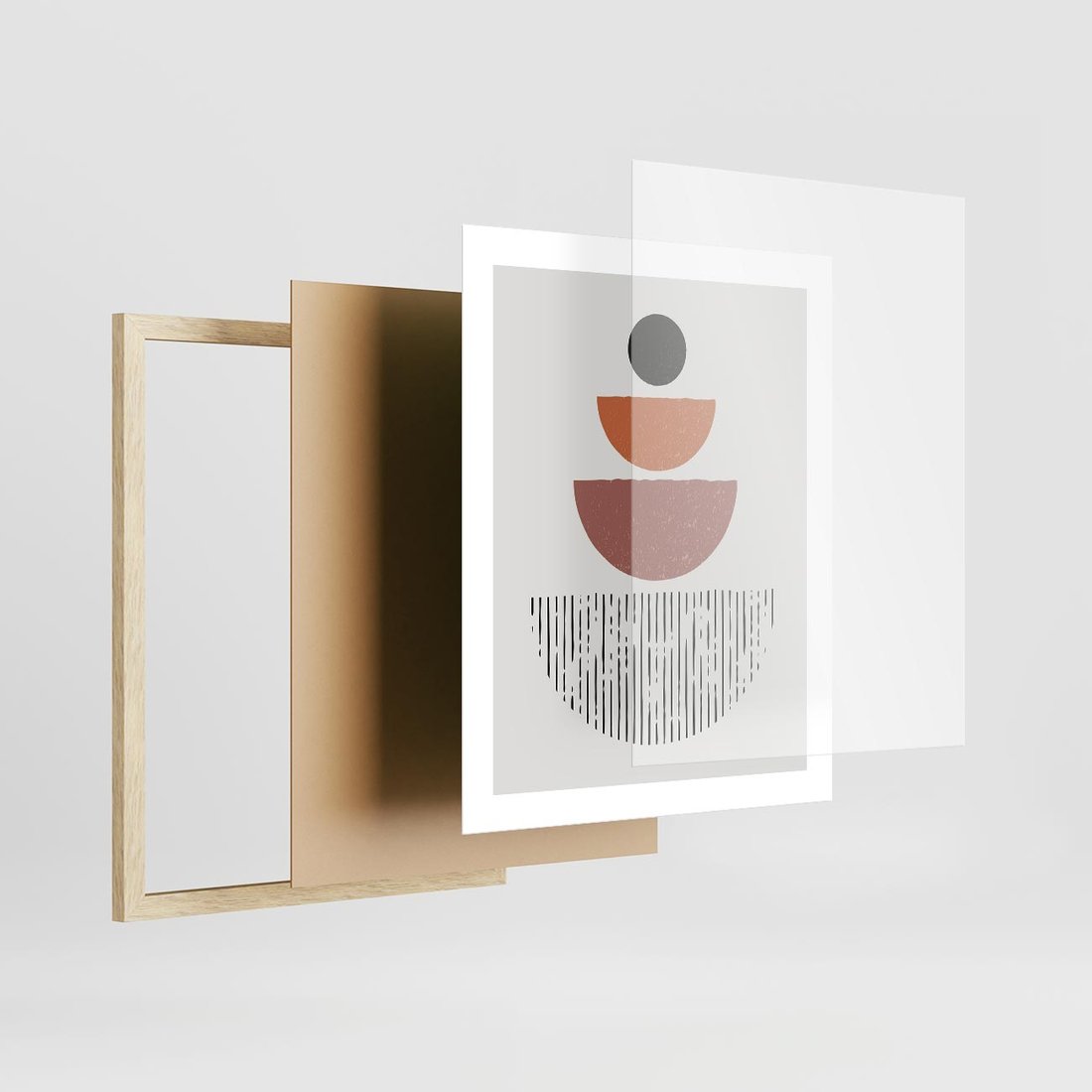 Obraz przedstawia geometryczną kompozycję półkół w stylu midcentury, który dodaje nutkę boho stylu. Ta kompozycja jest pełna wyrazu i elegancji.