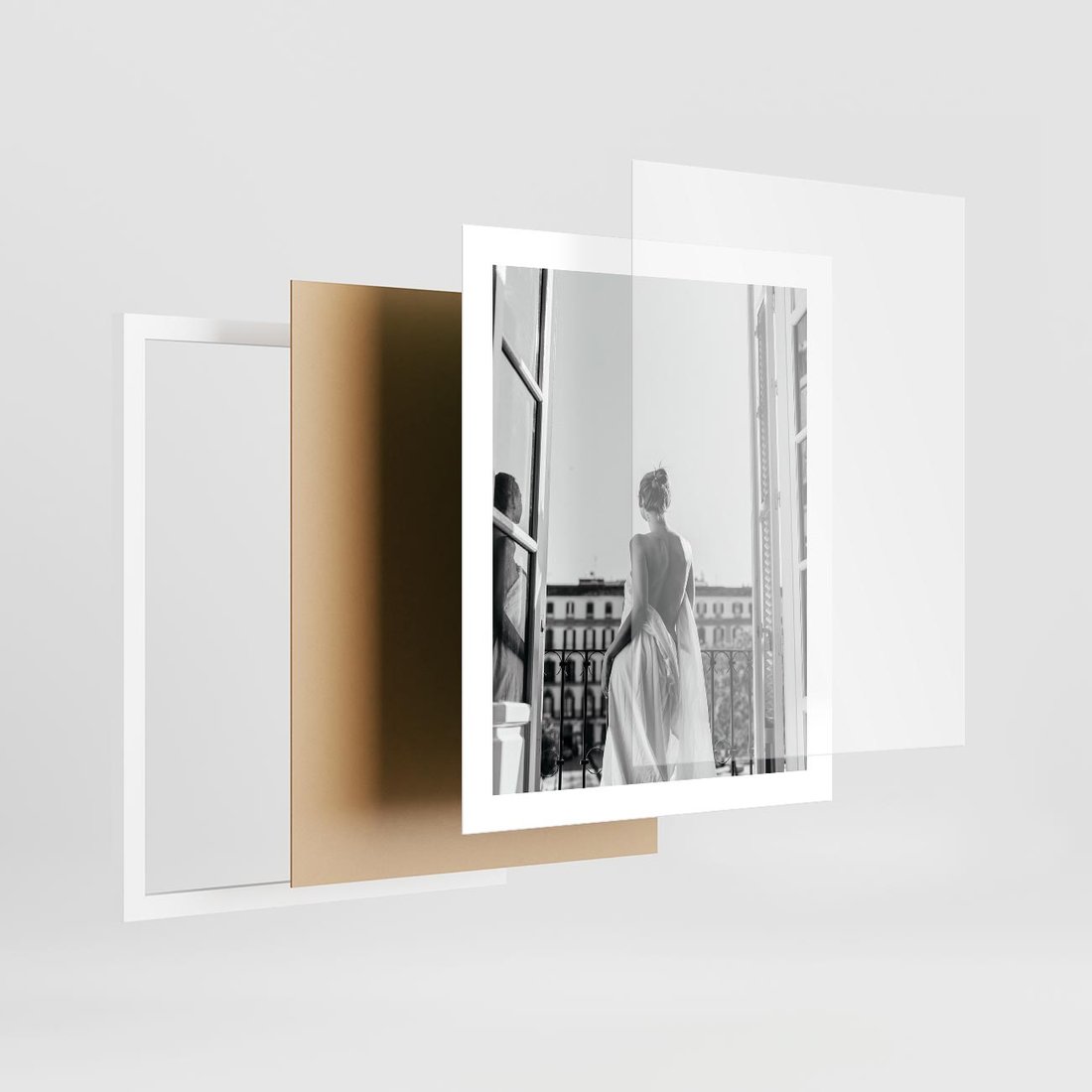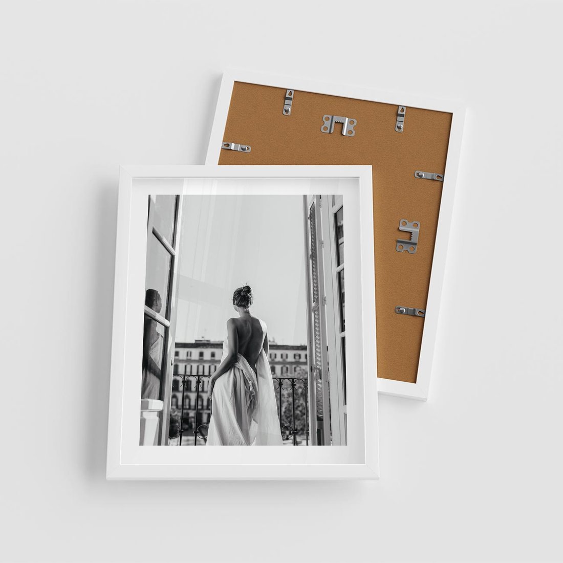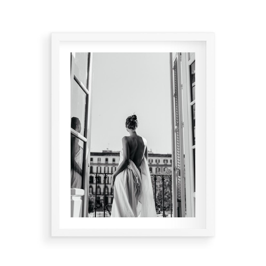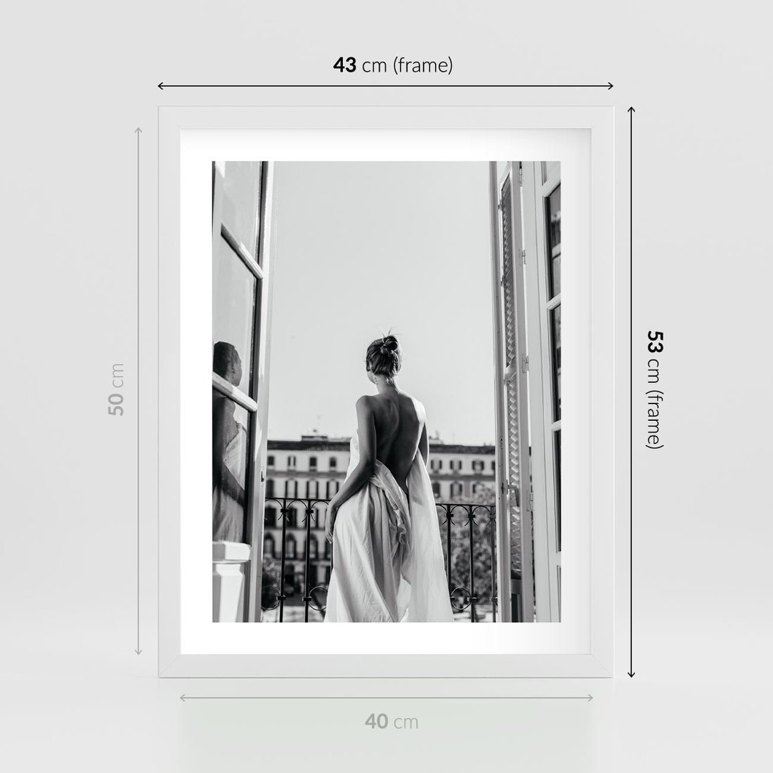 Plakat w ramie 40x50 - Poranki w Paryżu - czarno białe zdjęcie, kobieta w prześcieradle na balkonie - rama biała