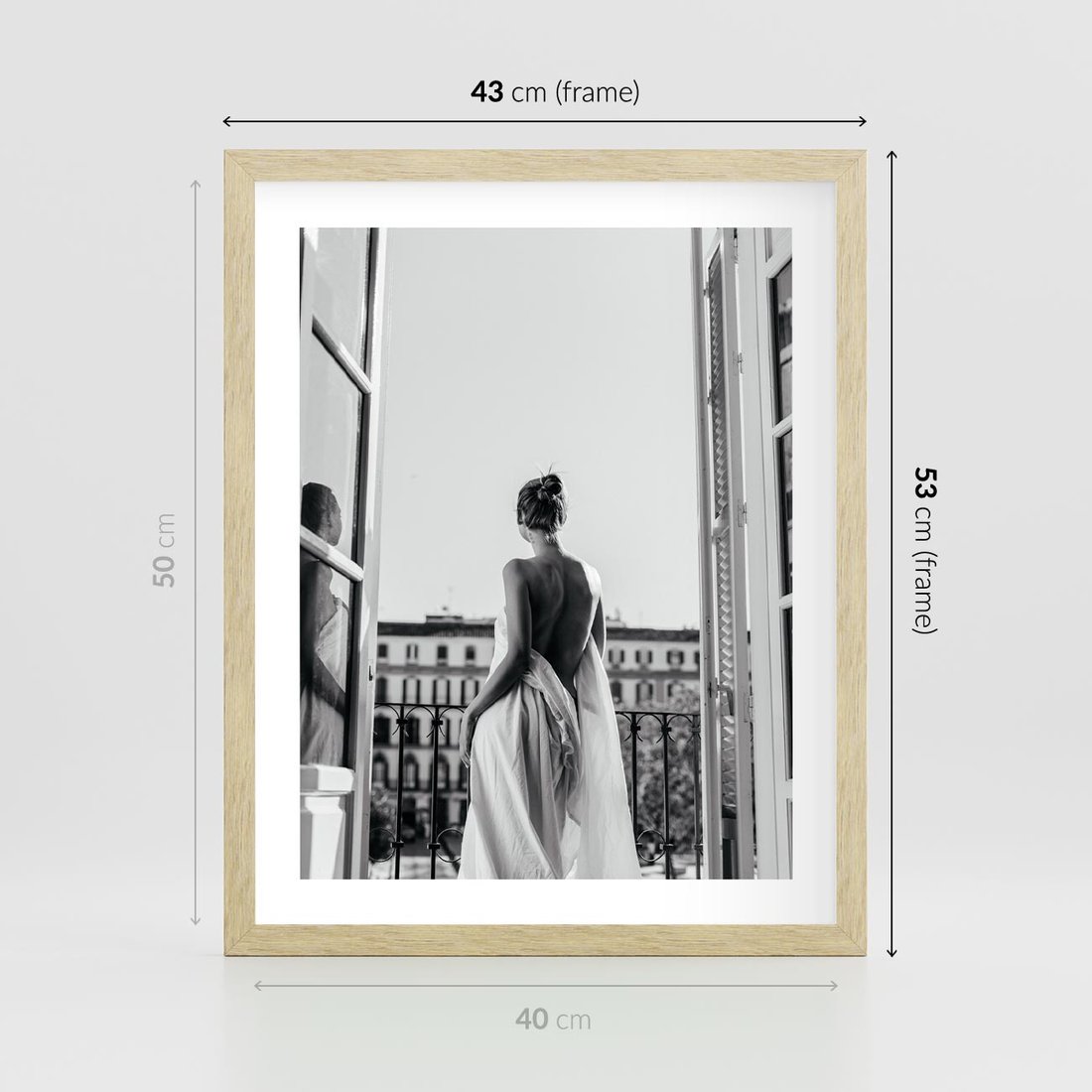 Plakat w ramie 40x50 - Poranki w Paryżu - czarno białe zdjęcie, kobieta w prześcieradle na balkonie - rama drewno