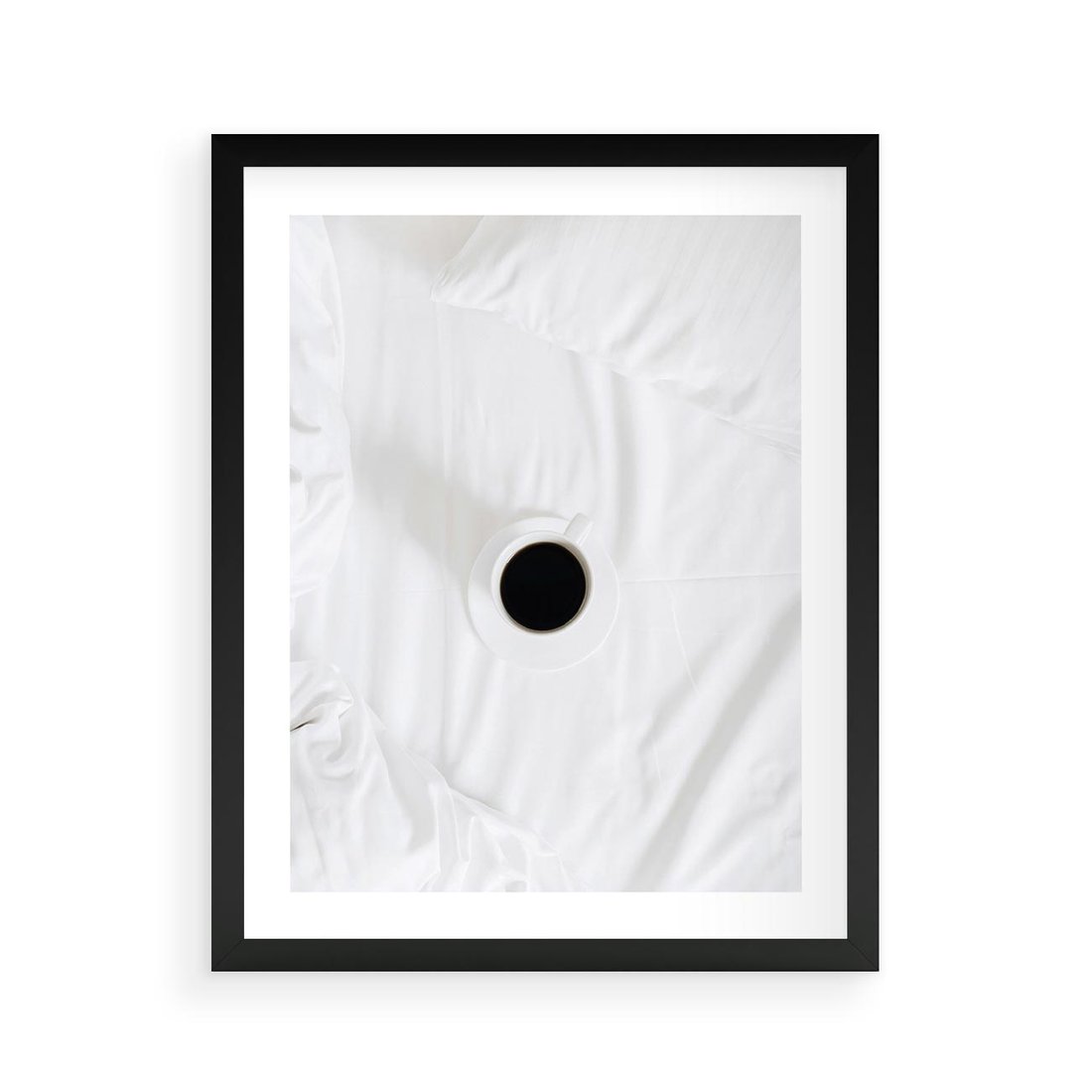 To minimalistyczna fotografia przedstawiająca białą filiżankę z czarną kawą na białej pościeli. Ujęcie z góry podkreśla prostotę i elegancję tego motywu.