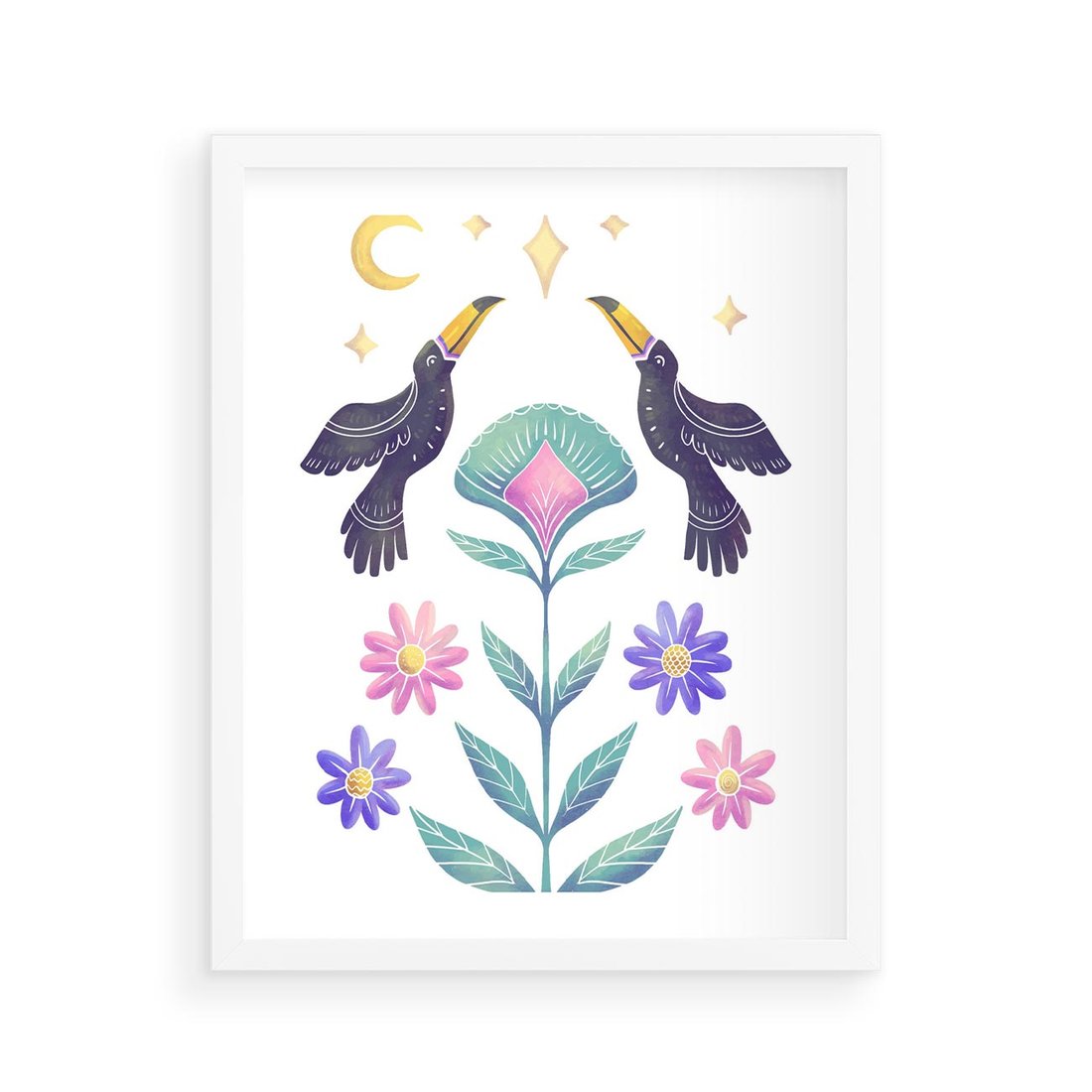 Plakat w ramie 40x50 - Przenikająca Dżungla - boho plakat, tukany - rama biała