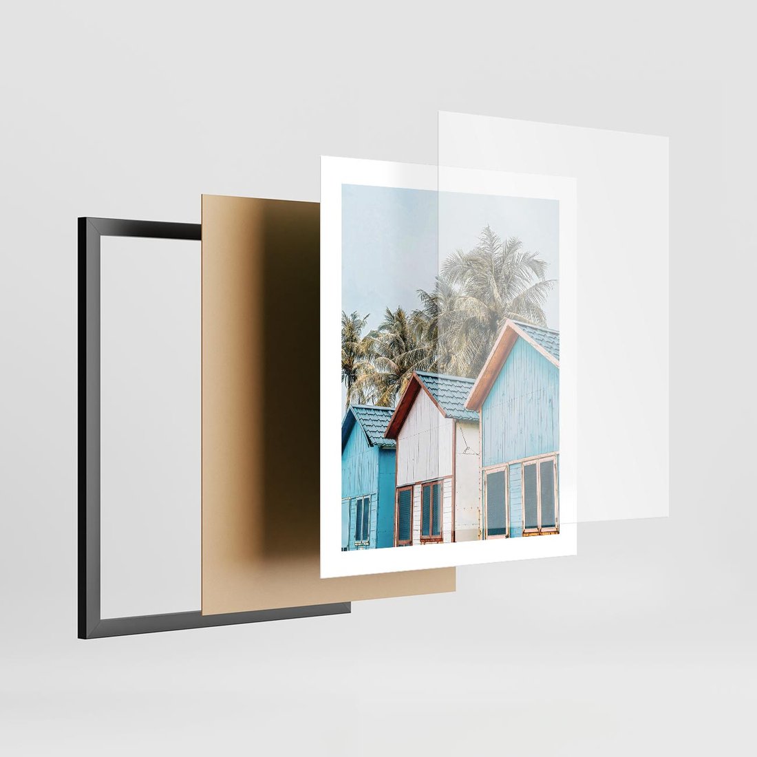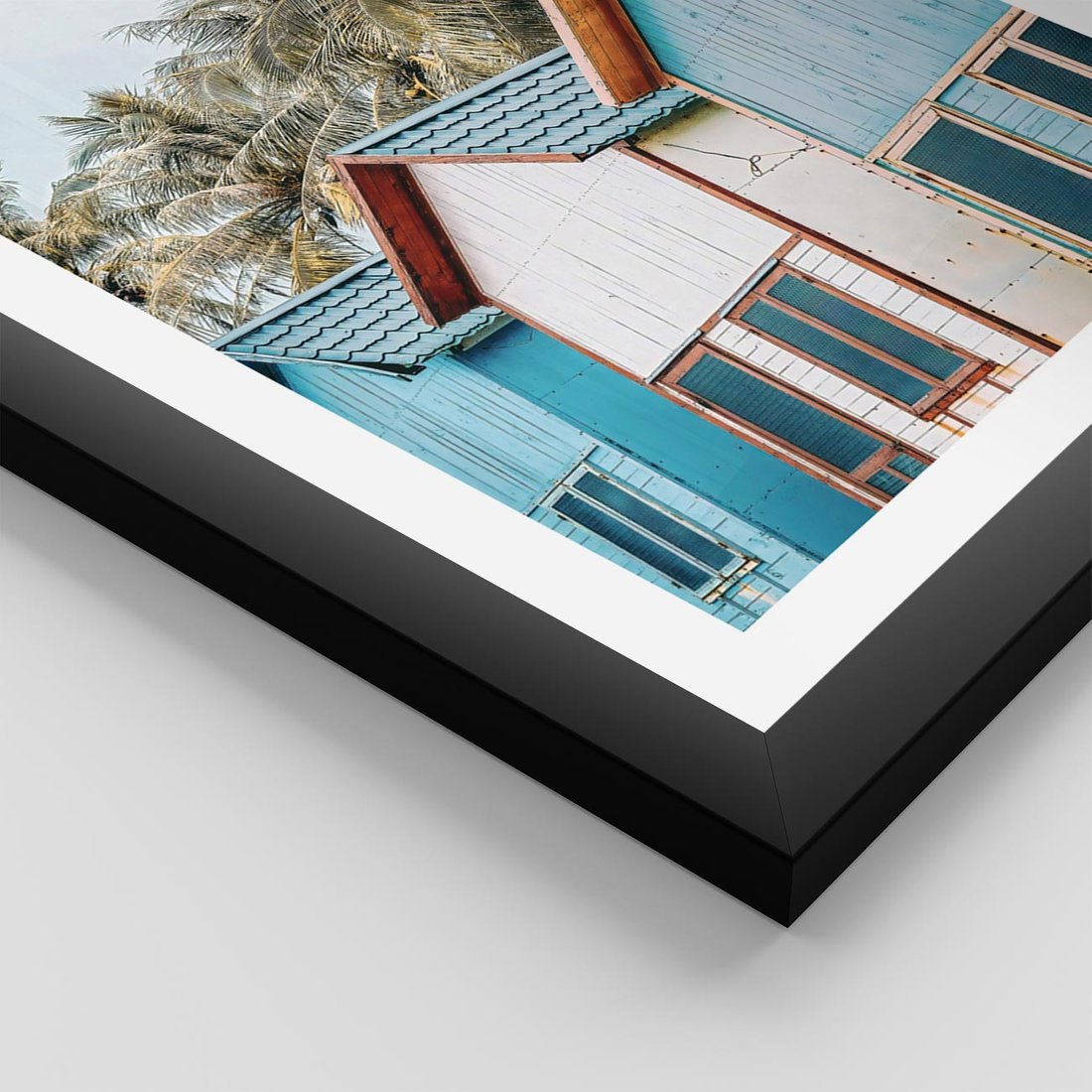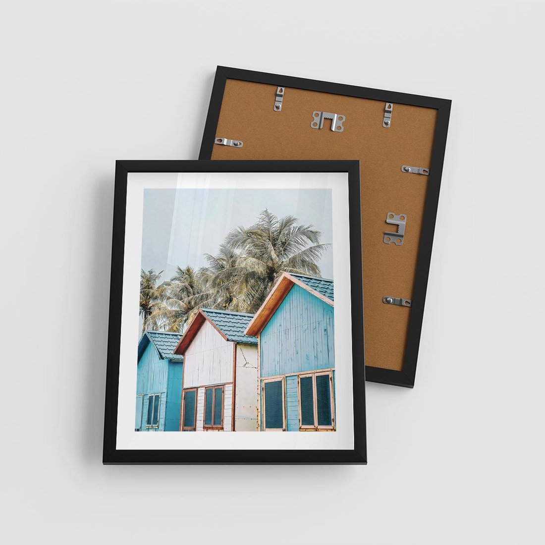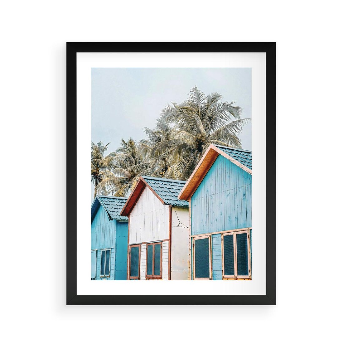 Plakat w ramie 40x50 - Rajskie Wakacje - domki na plaży, błękitne domki - rama czarna