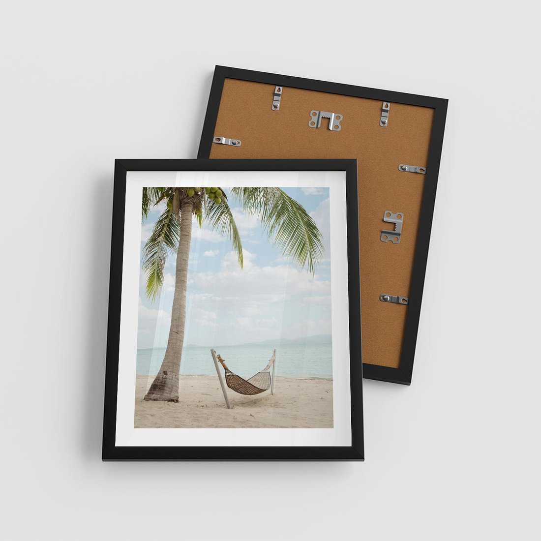 Plakat w ramie 40x50 - Relaks na plaży - palma, hamak - rama czarna