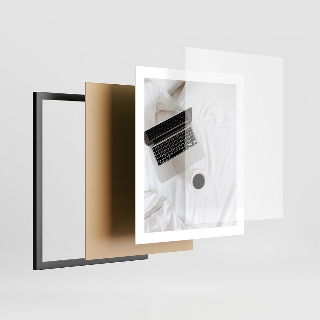 Plakat w ramie 40x50 - Relaks w Łóżku: Kawa i Laptop w Pościeli - komputer, na łóżku - rama czarna