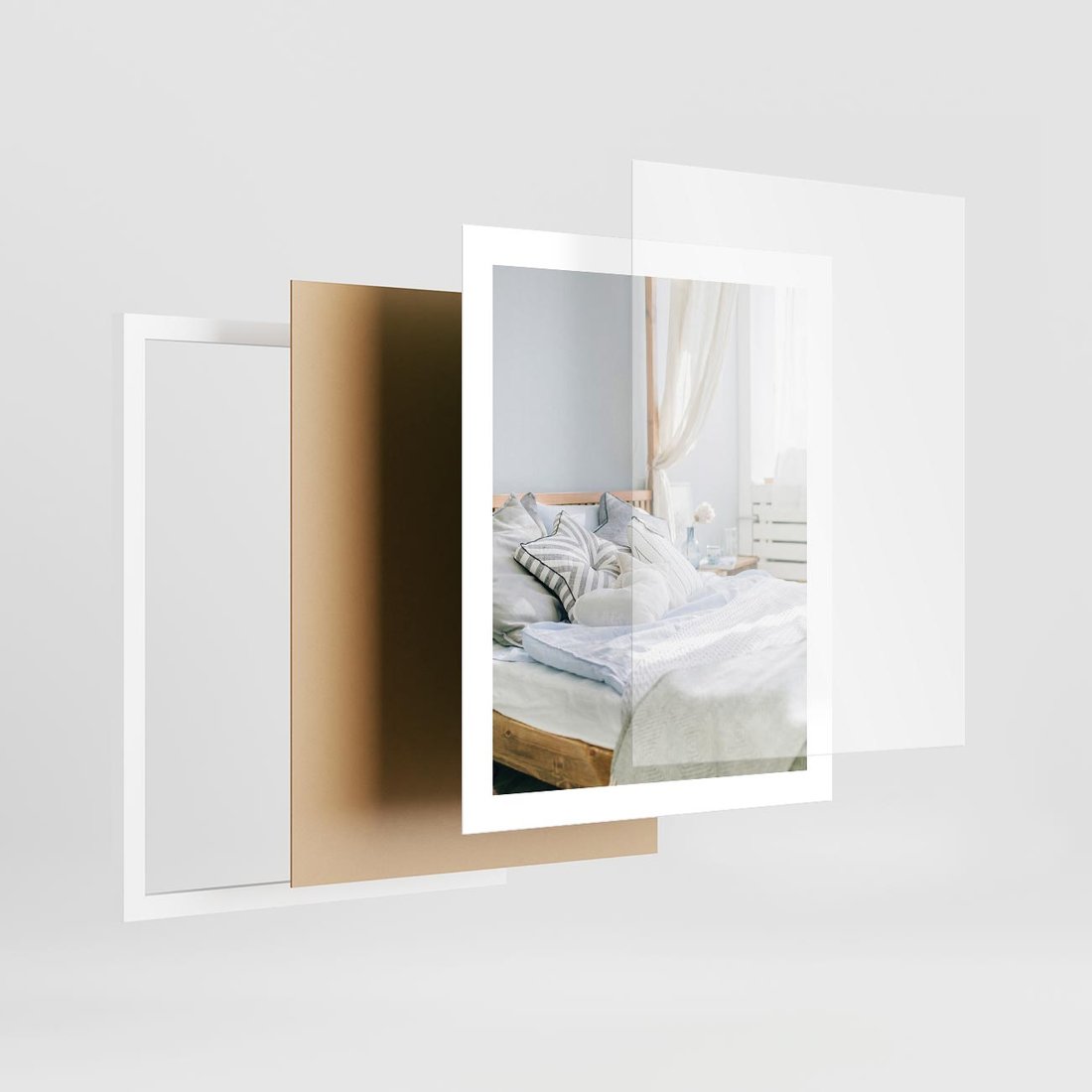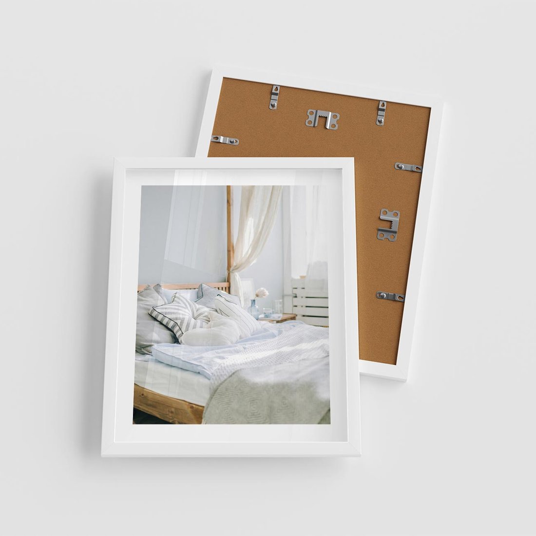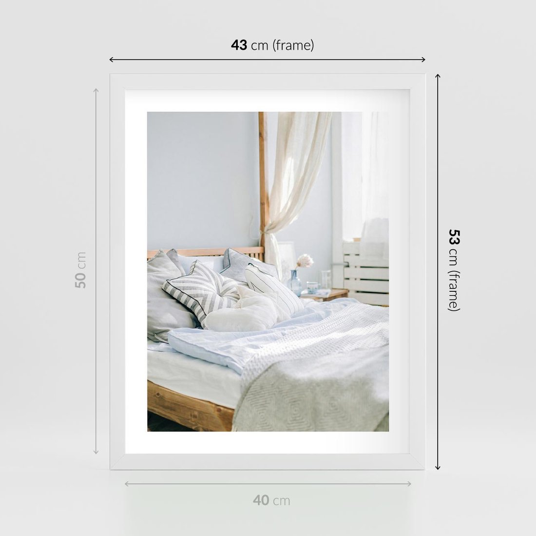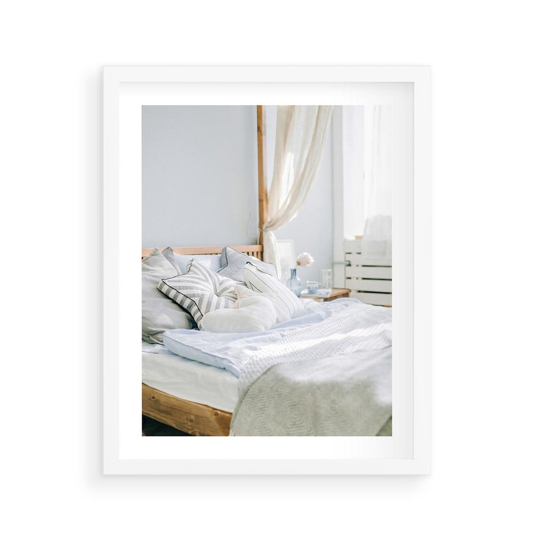 Plakat w ramie 40x50 - Relaks w Sypialni: Jasne Kolory - zdjęcie sypialni, łóżko - rama biała