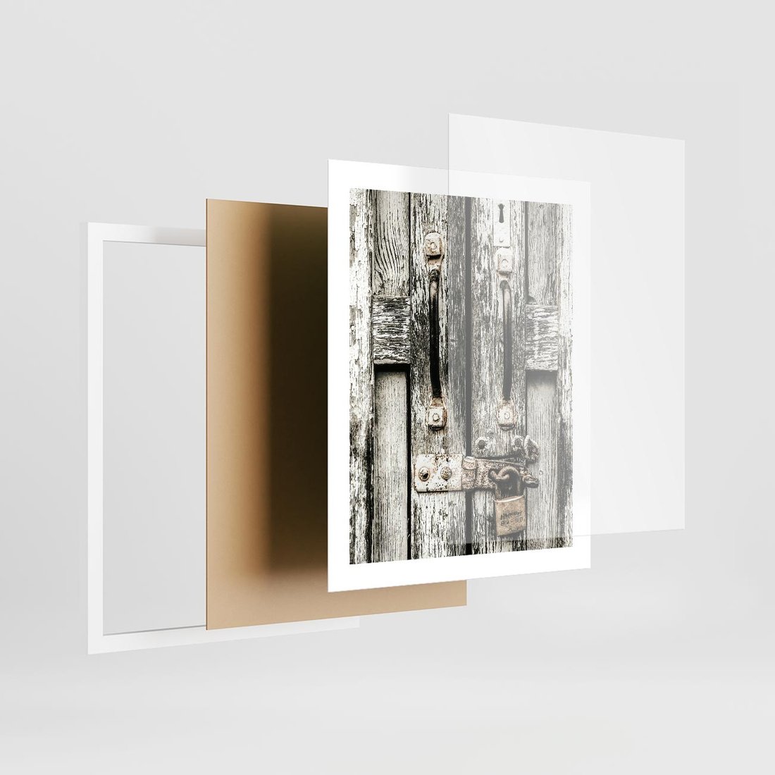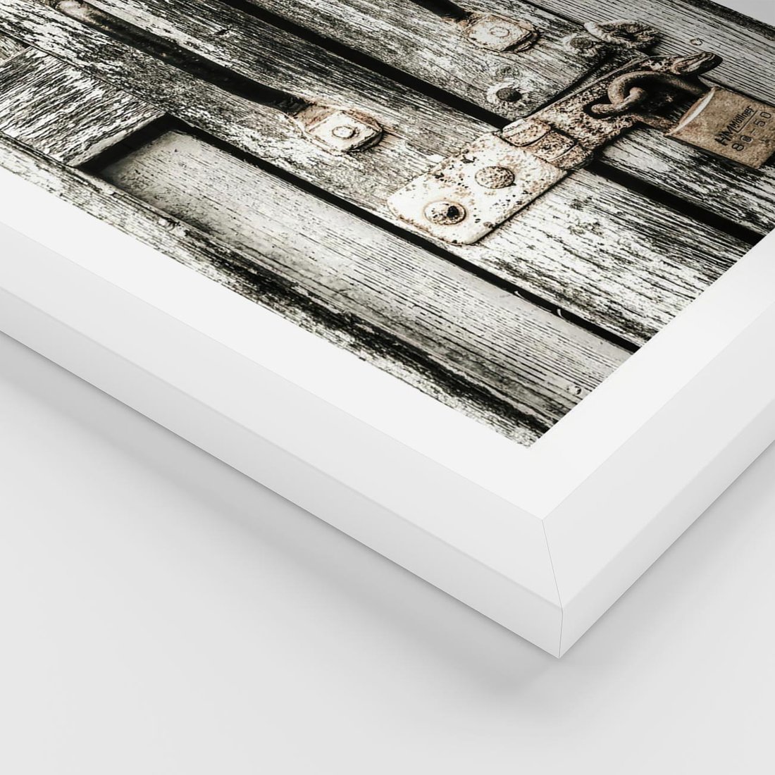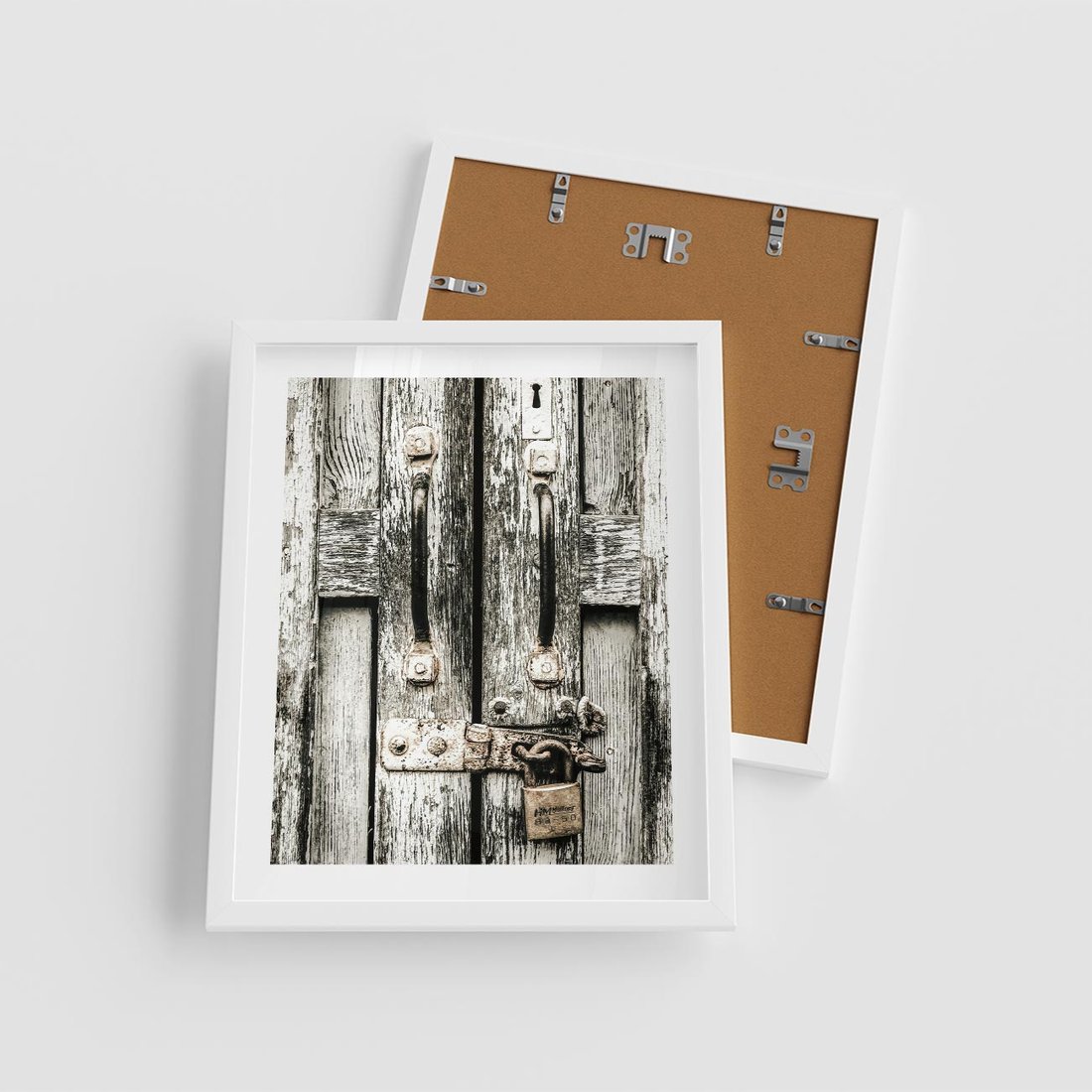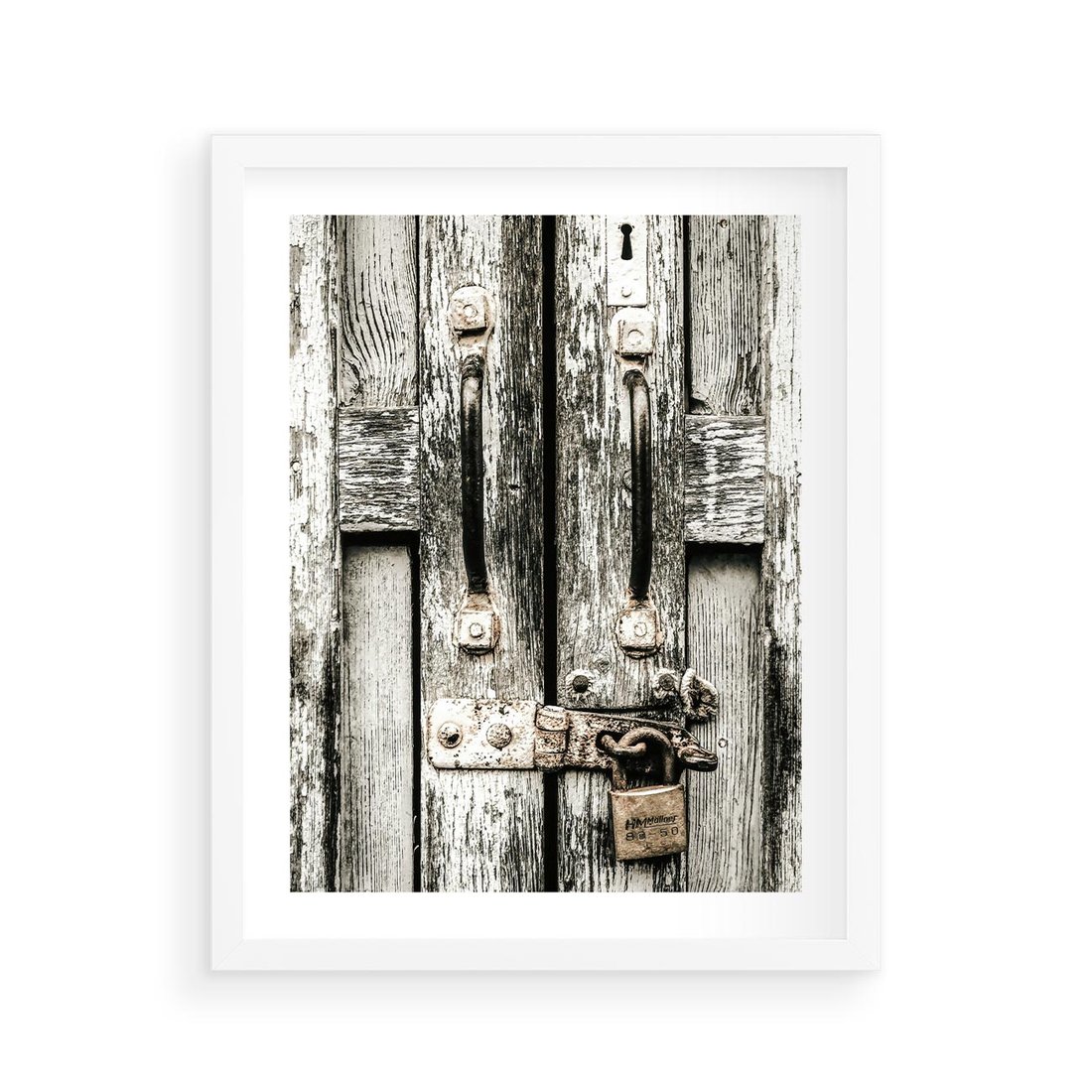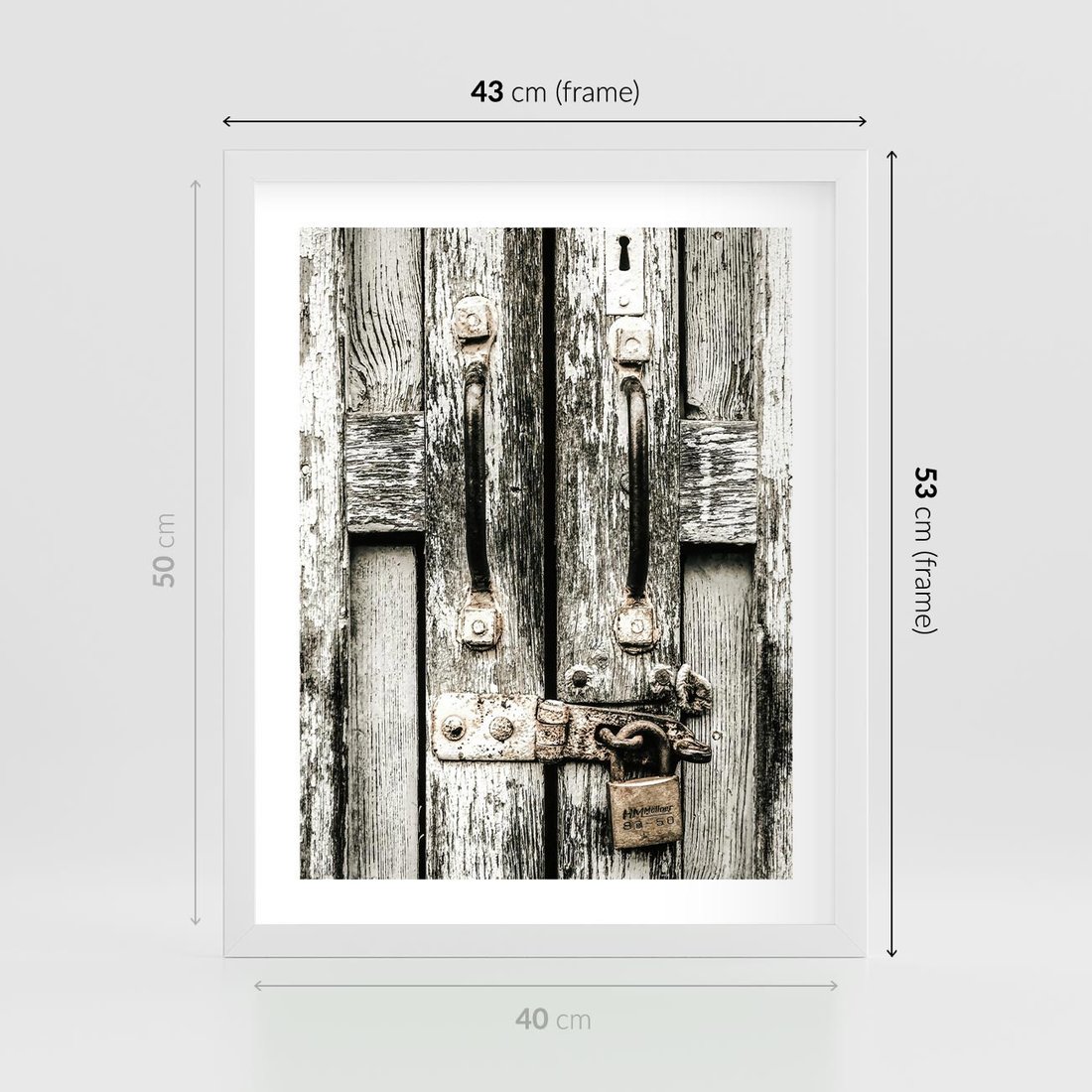 Plakat w ramie 40x50 - Retro Drzwi: Zamknięta Tajemnica - stare drzwi, kłódka - rama biała
