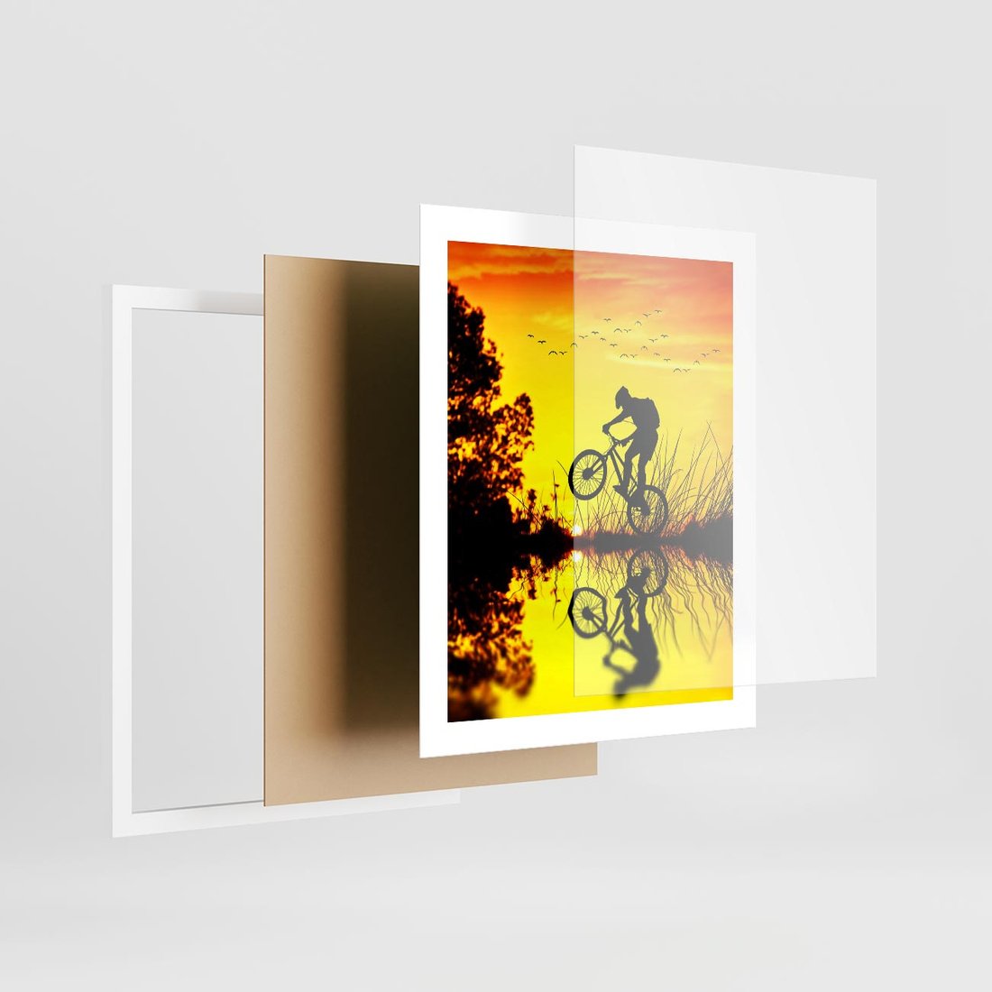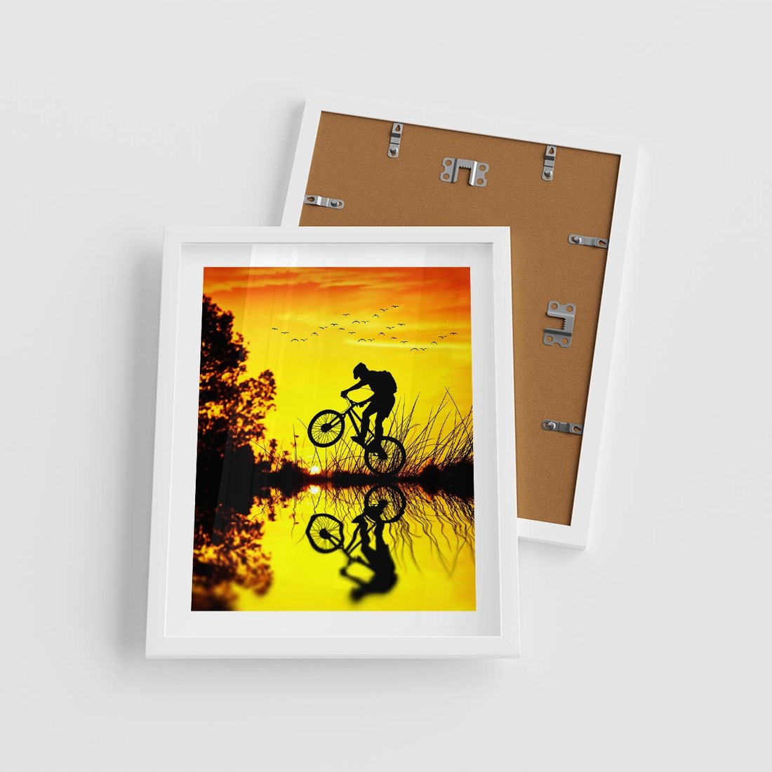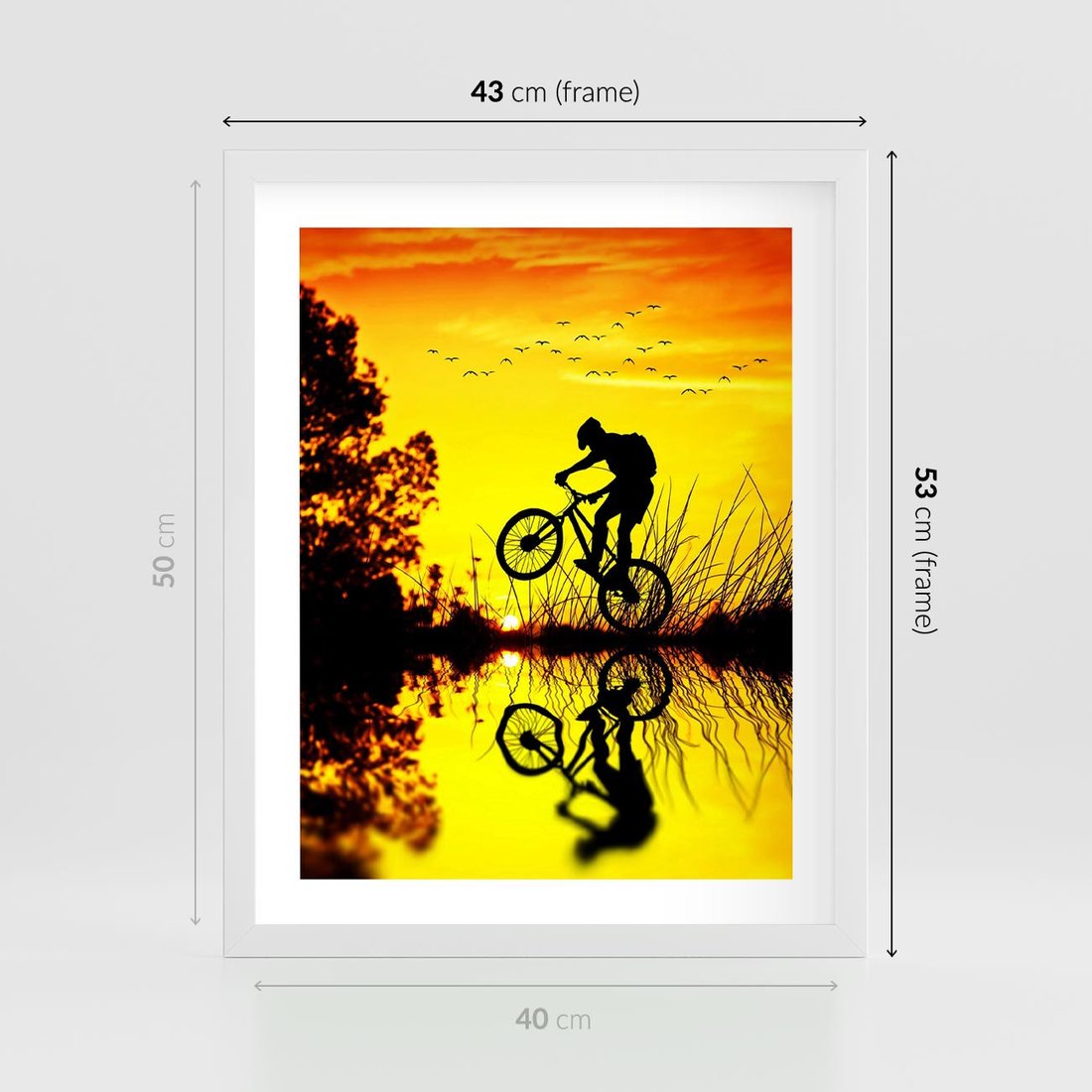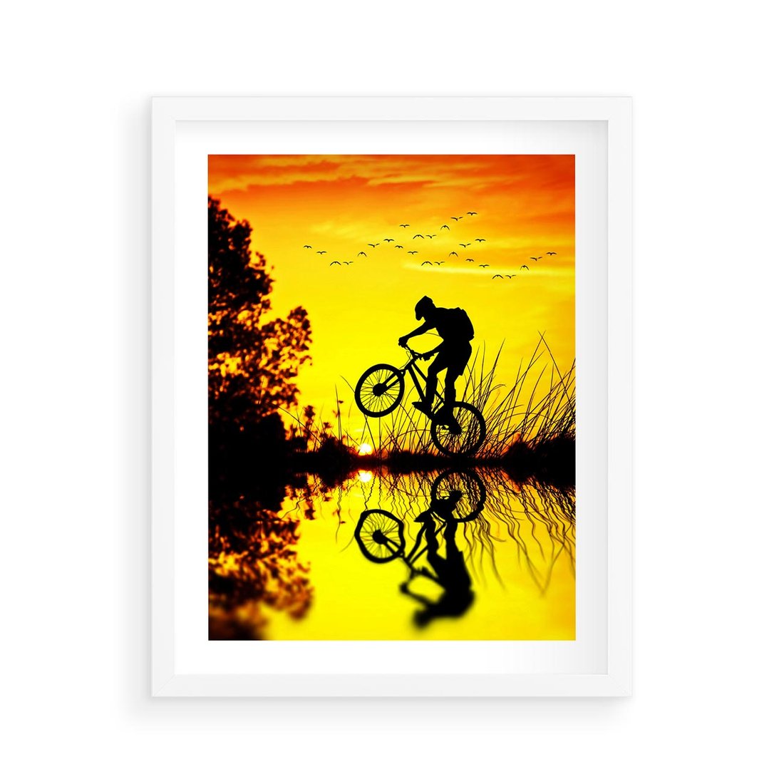 Plakat w ramie 40x50 - Rower przy zachodzie słońca - rower, zachód - rama biała
