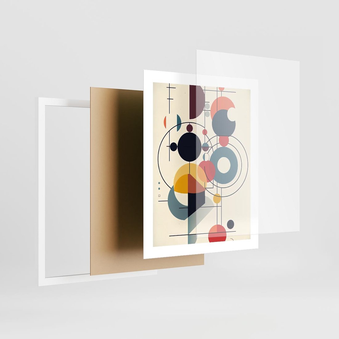 Ta abstrakcyjna geometryczna kompozycja jest zbudowana z precyzyjnych kształtów, takich jak koła i linie. Tworzą one harmonijną równowagę pomiędzy formami, tworząc interesującą wizualną podróż dla oglądającego.