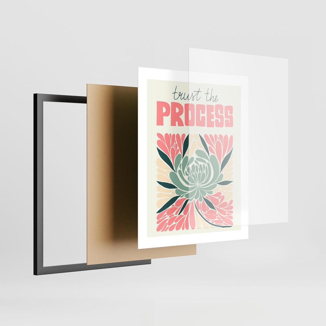 Ta nowoczesna sztuka łączy abstrakcyjny pastelowy kwiat z wyrazistą typografią, tworząc harmonijną kompozycję. Sztuka ta przenosi nas w delikatny świat estetyki, inspirując do refleksji i postrzegania piękna w subtelności.