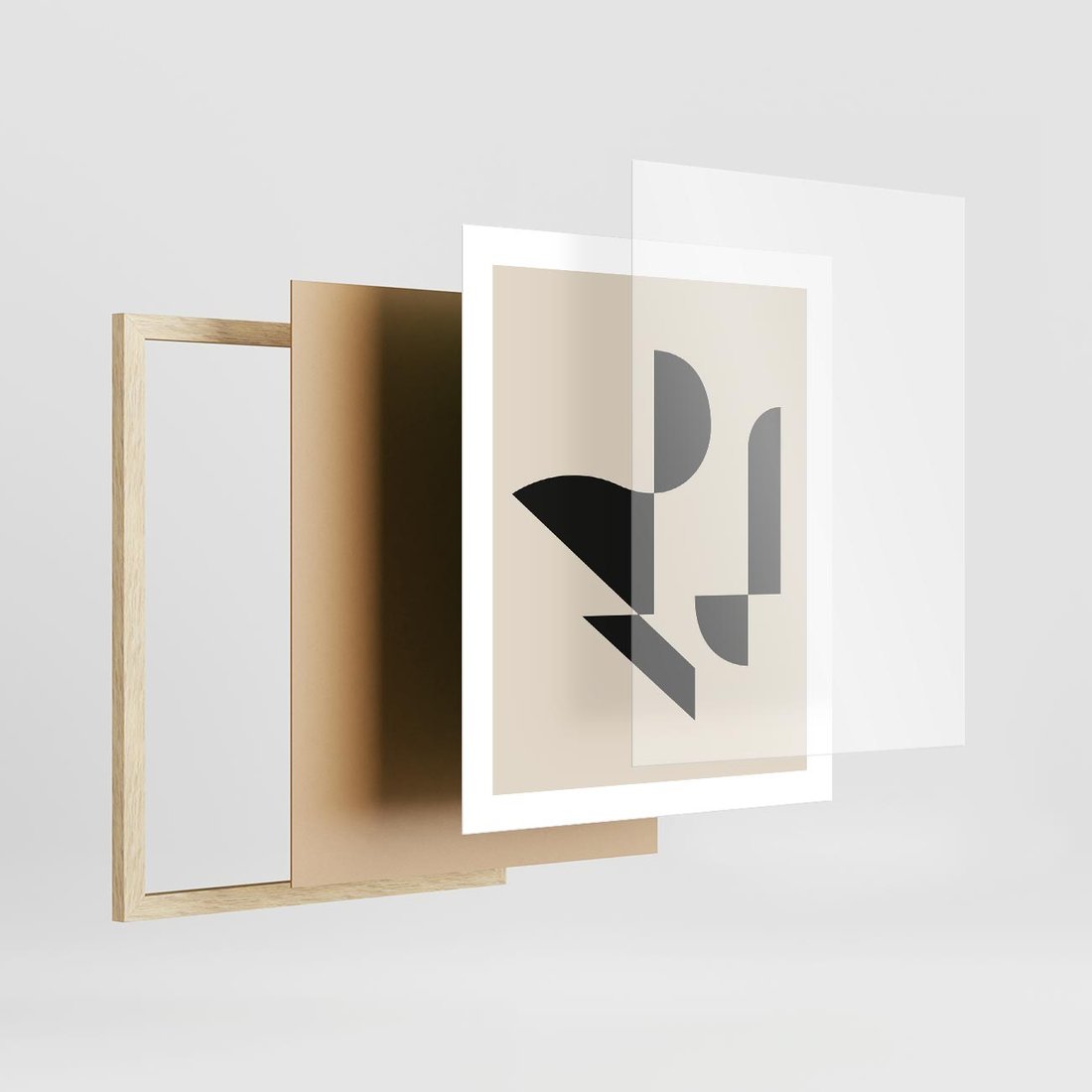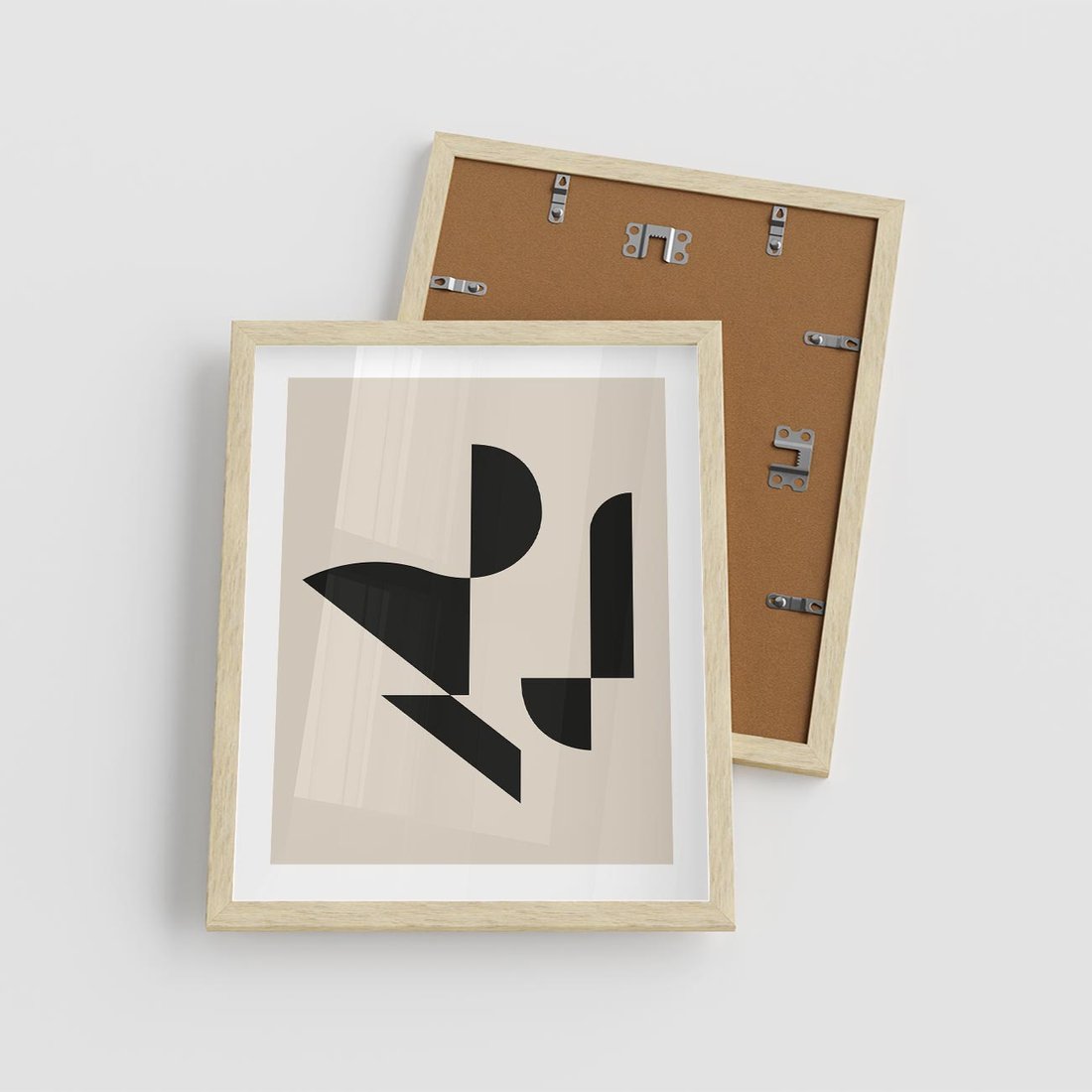 Ten plakat prezentuje abstrakcyjne geometryczne kształty w minimalistycznym stylu czarno-białym. Sztuka ta eksploruje formy i proporcje, tworząc dynamiczną kompozycję, która oddziałuje na zmysły i zachęca do refleksji, stanowiąc zarazem elegancki i nowoczesny element dekoracyjny w Twojej przestrzeni.