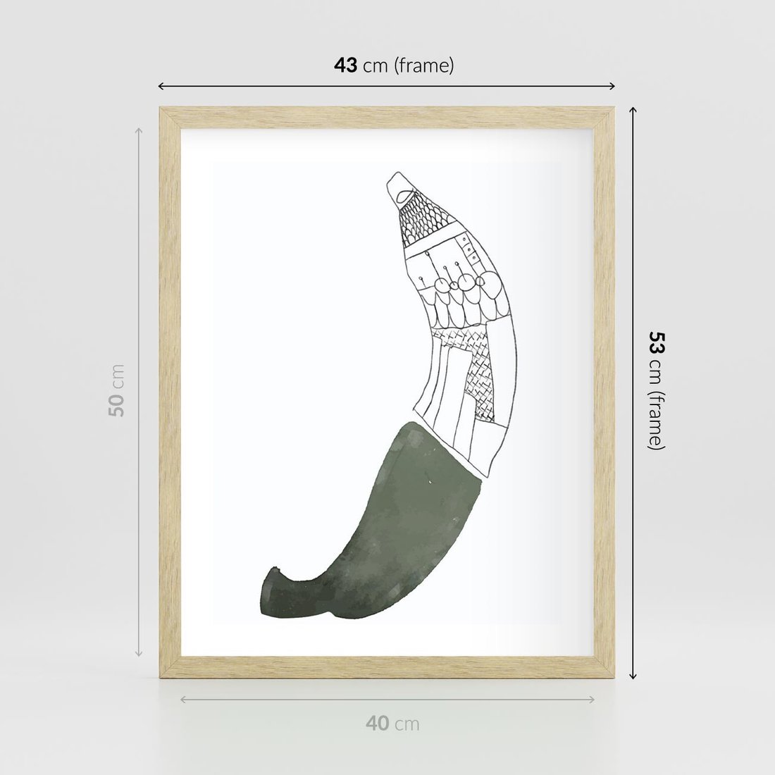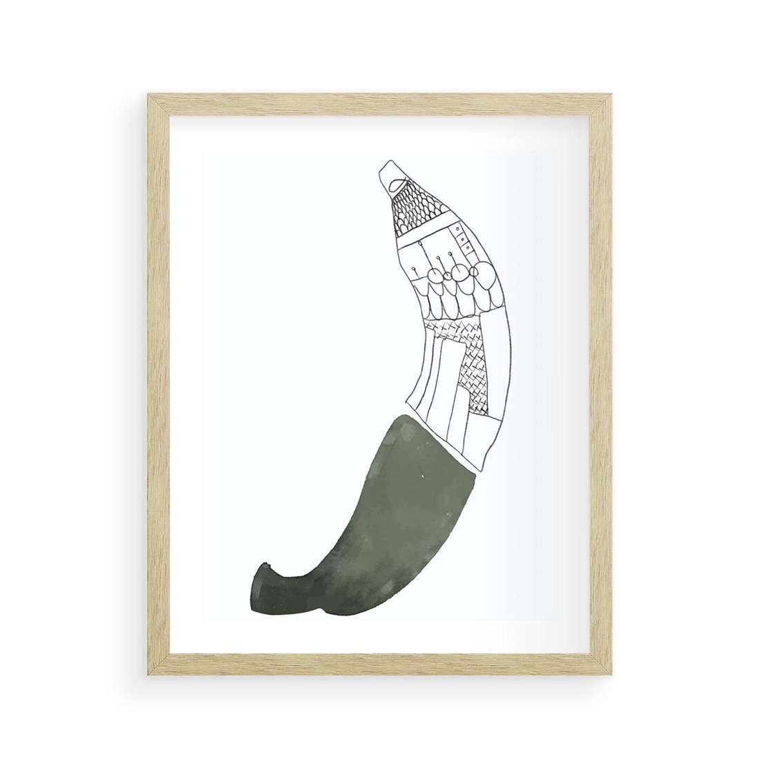 Ten minimalistyczny plakat przedstawia abstrakcyjną interpretację banana w stonowanej, zgaszonej zieleni. To dzieło sztuki łączy w sobie minimalizm z abstrakcją, tworząc subtelny i nowoczesny efekt. Jest to doskonały wybór dla osób, które cenią sobie prostotę, elegancję oraz chcą dodać swojej przestrzeni delikatny, lecz wyrafinowany akcent.