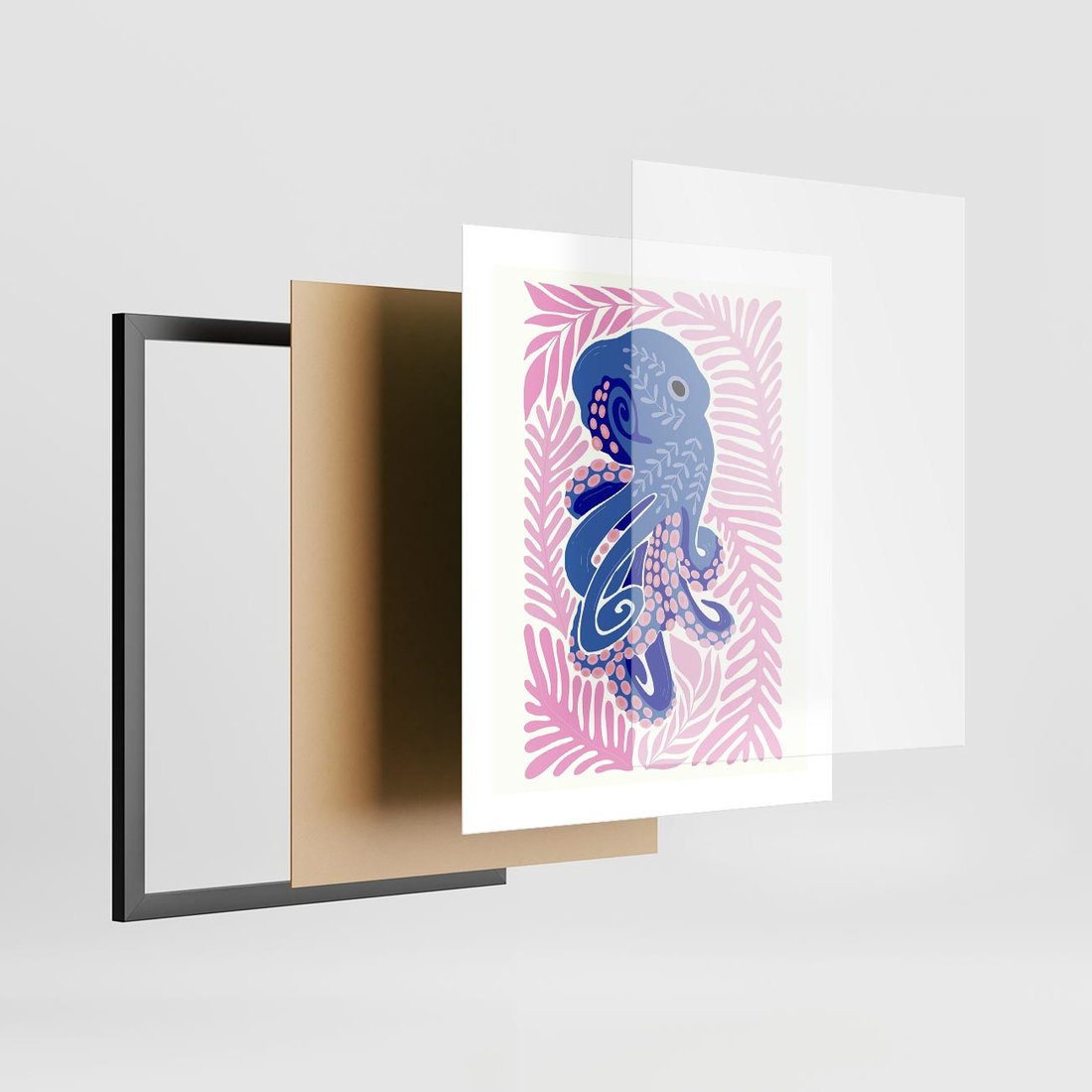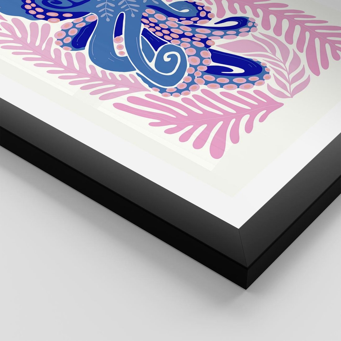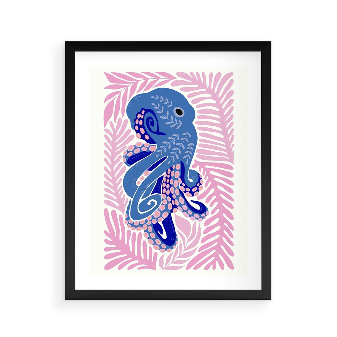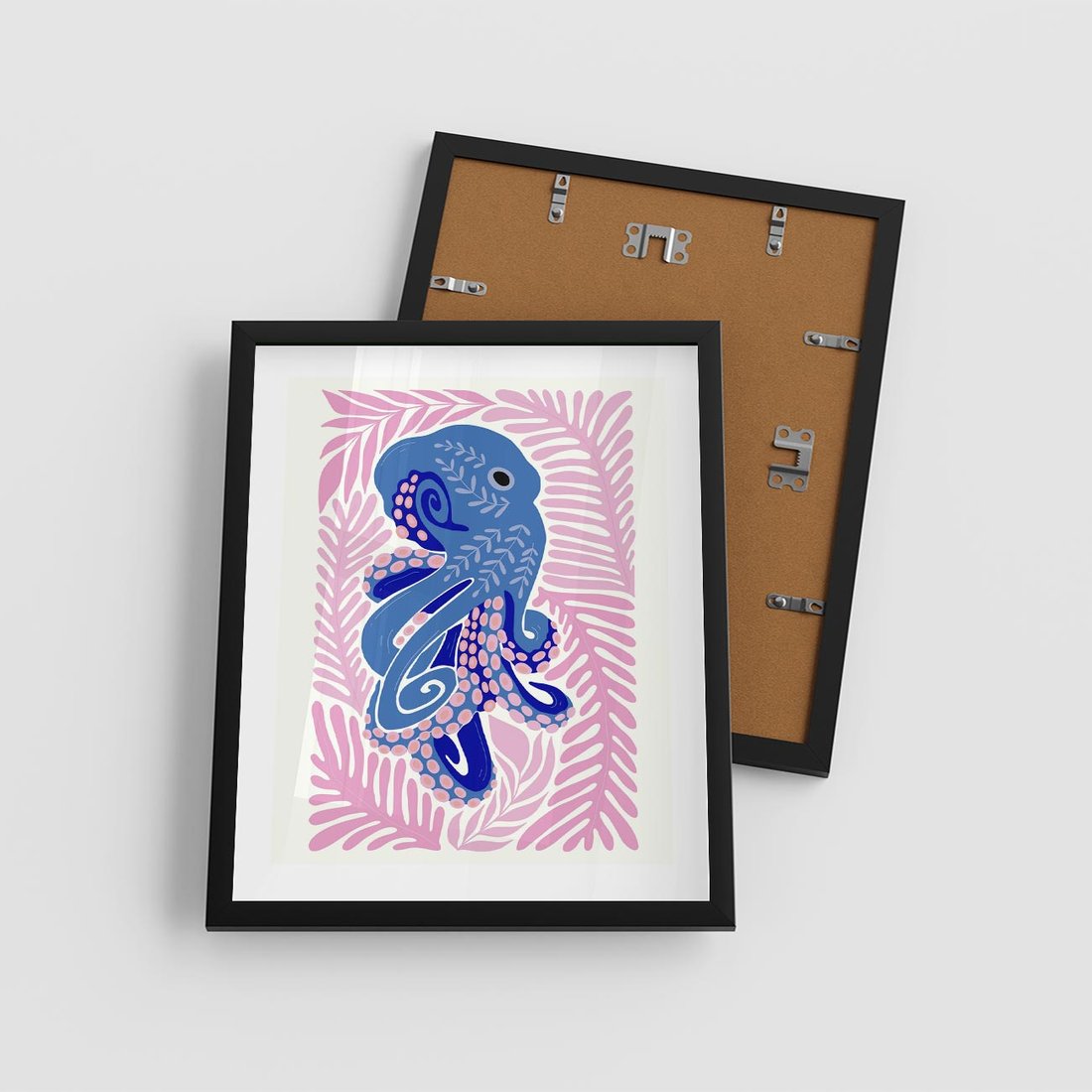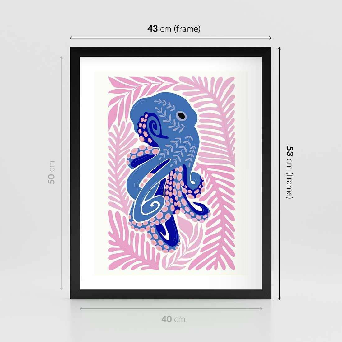 Plakat w ramie 40x50 - Rozkwitające marzenia - abstrakcyjna kompozycja, niebieska ośmiornica wśród różowej roślinnośći - rama czarna