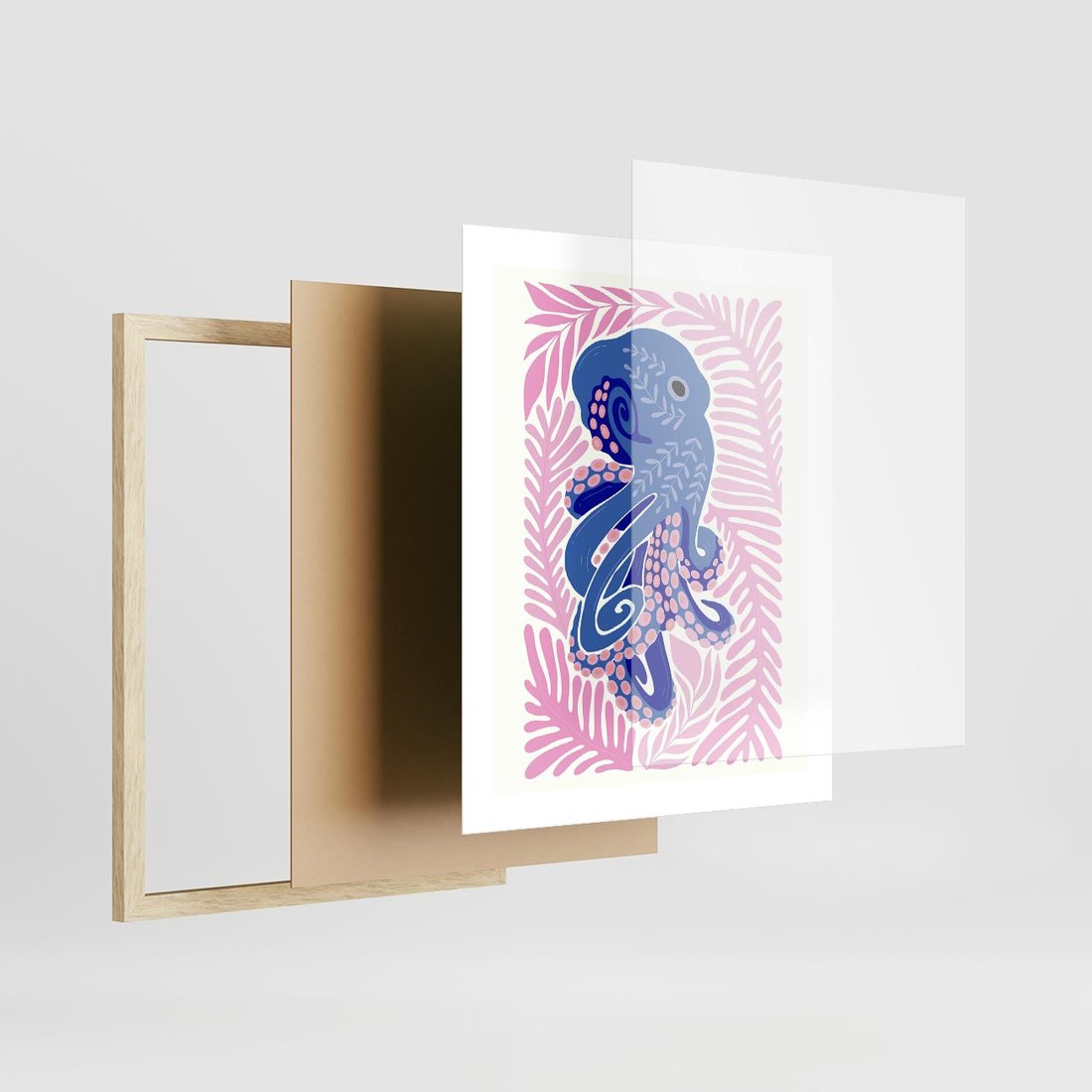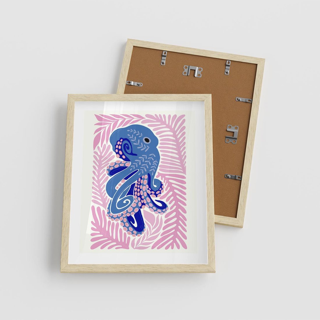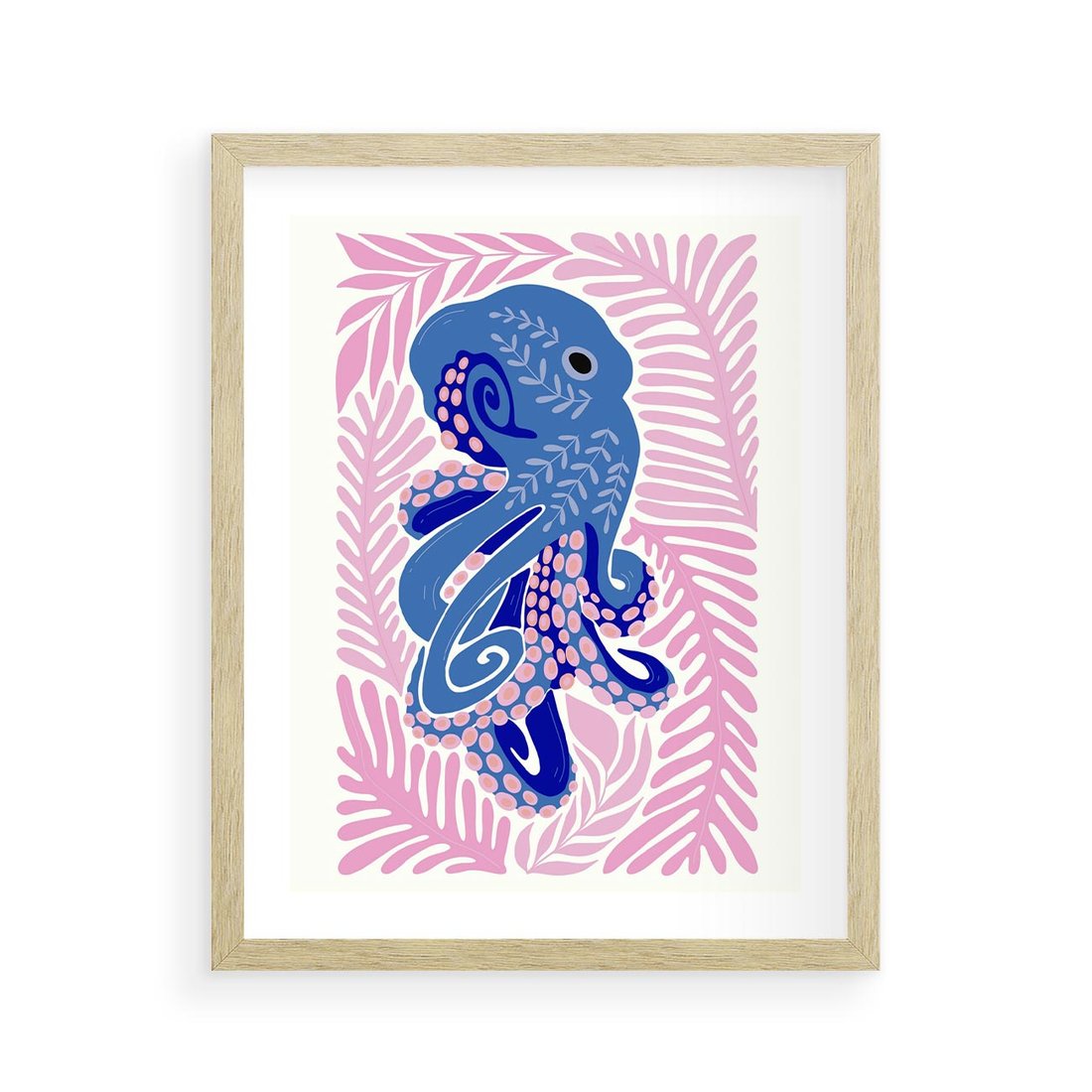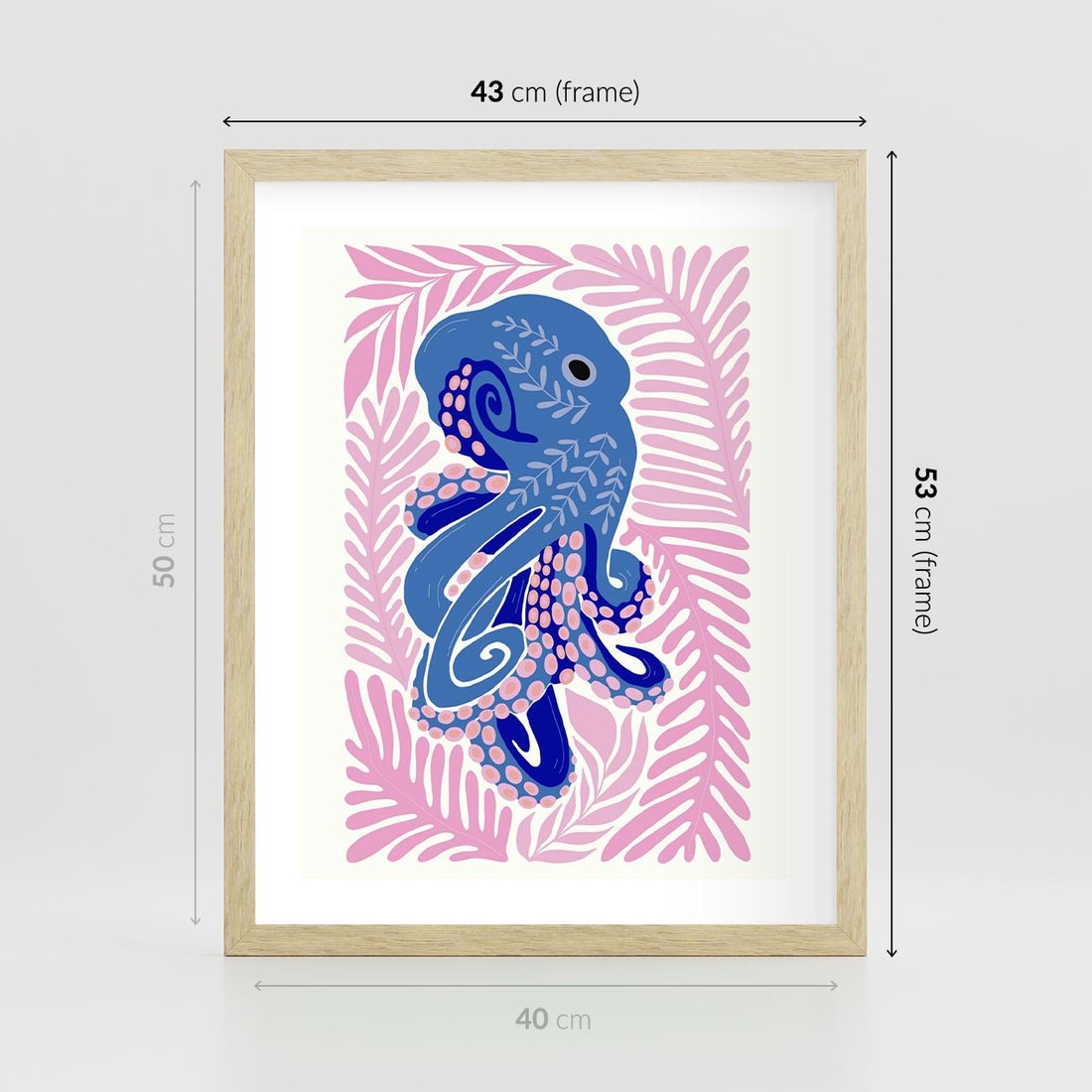 Plakat w ramie 40x50 - Rozkwitające marzenia - abstrakcyjna kompozycja, niebieska ośmiornica wśród różowej roślinnośći - rama drewno
