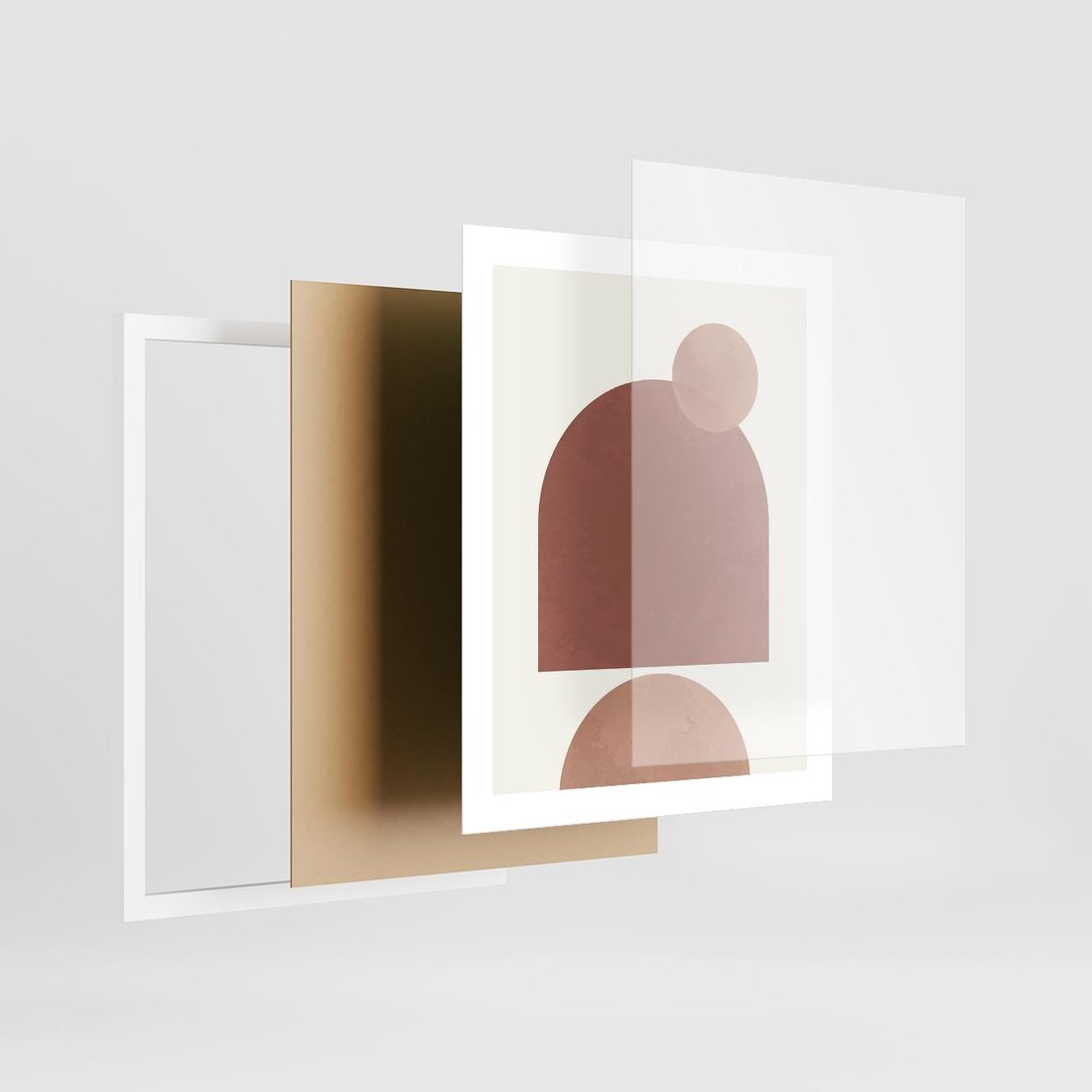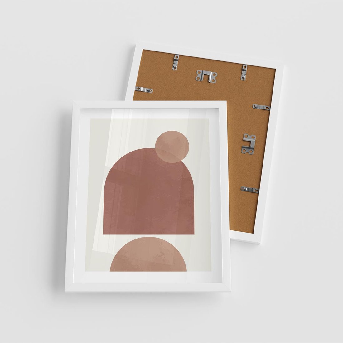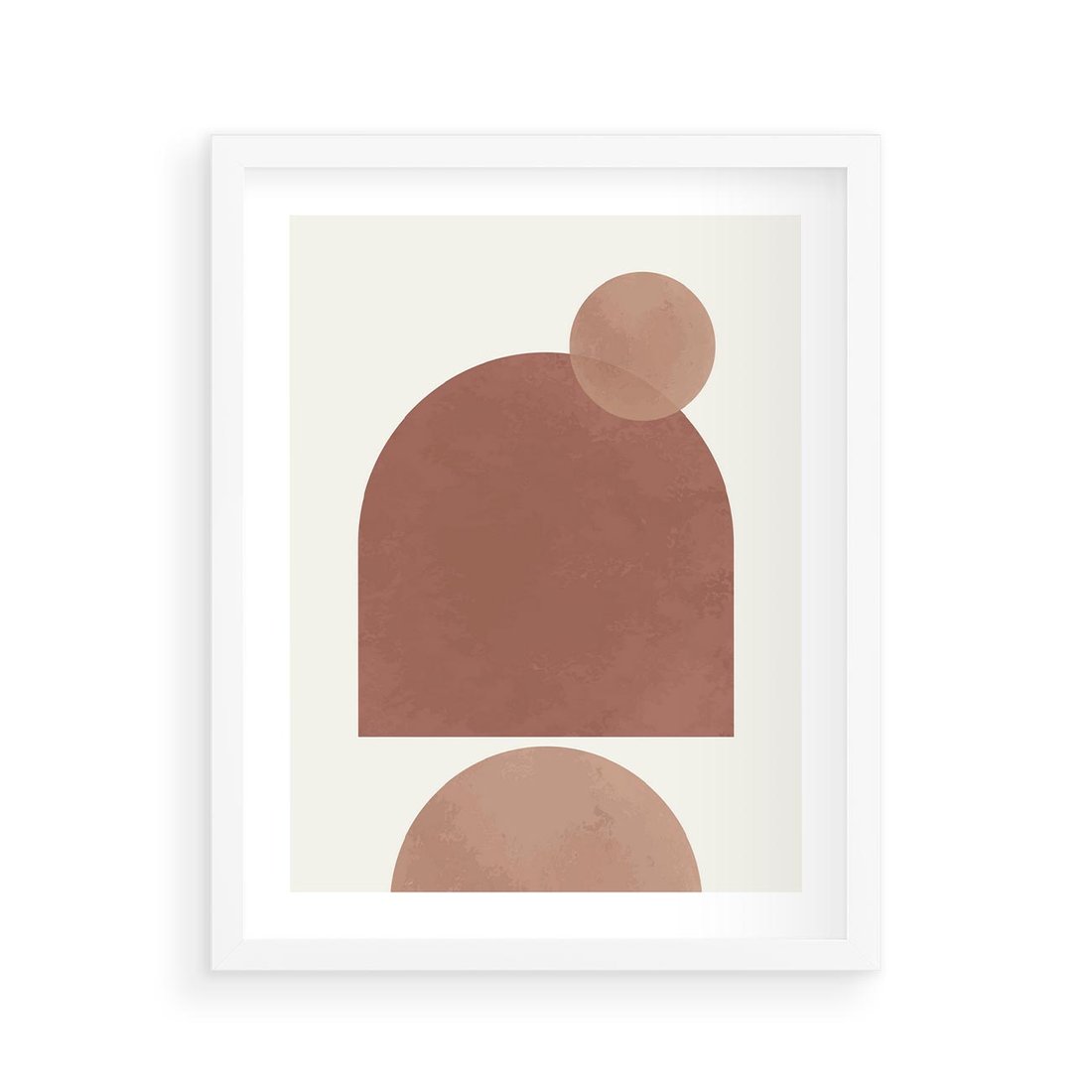 Ten plakat prezentuje abstrakcyjne, geometryczne kształty w odcieniach brązu i beżu, doskonale łącząc minimalizm z boho stylem. Idealny do nowoczesnych wnętrz.