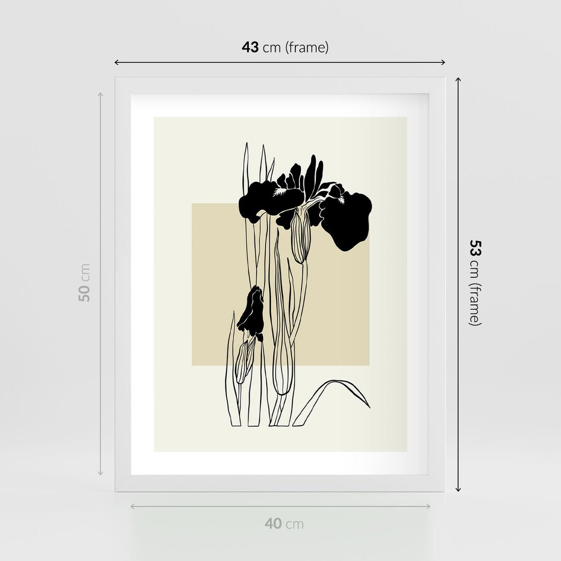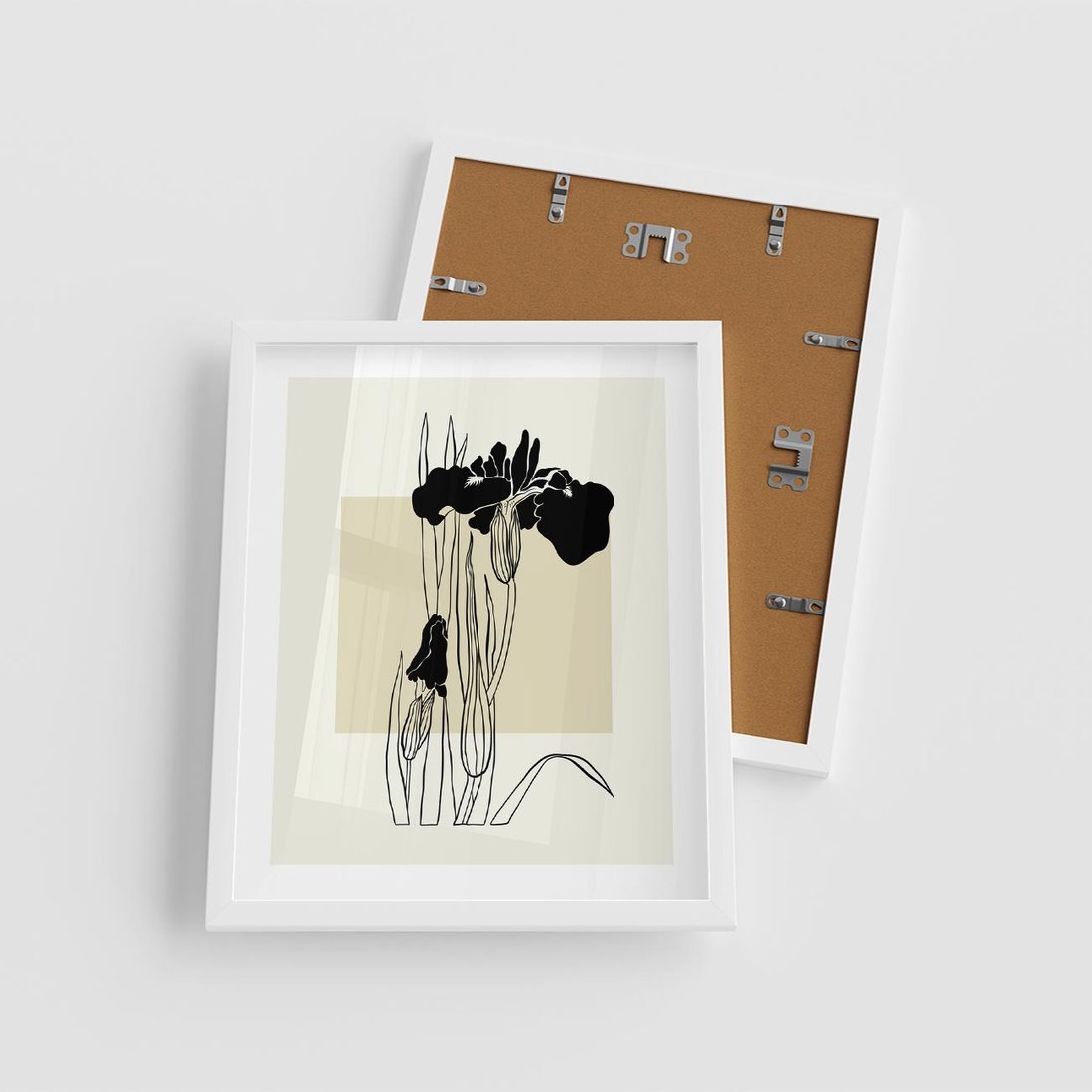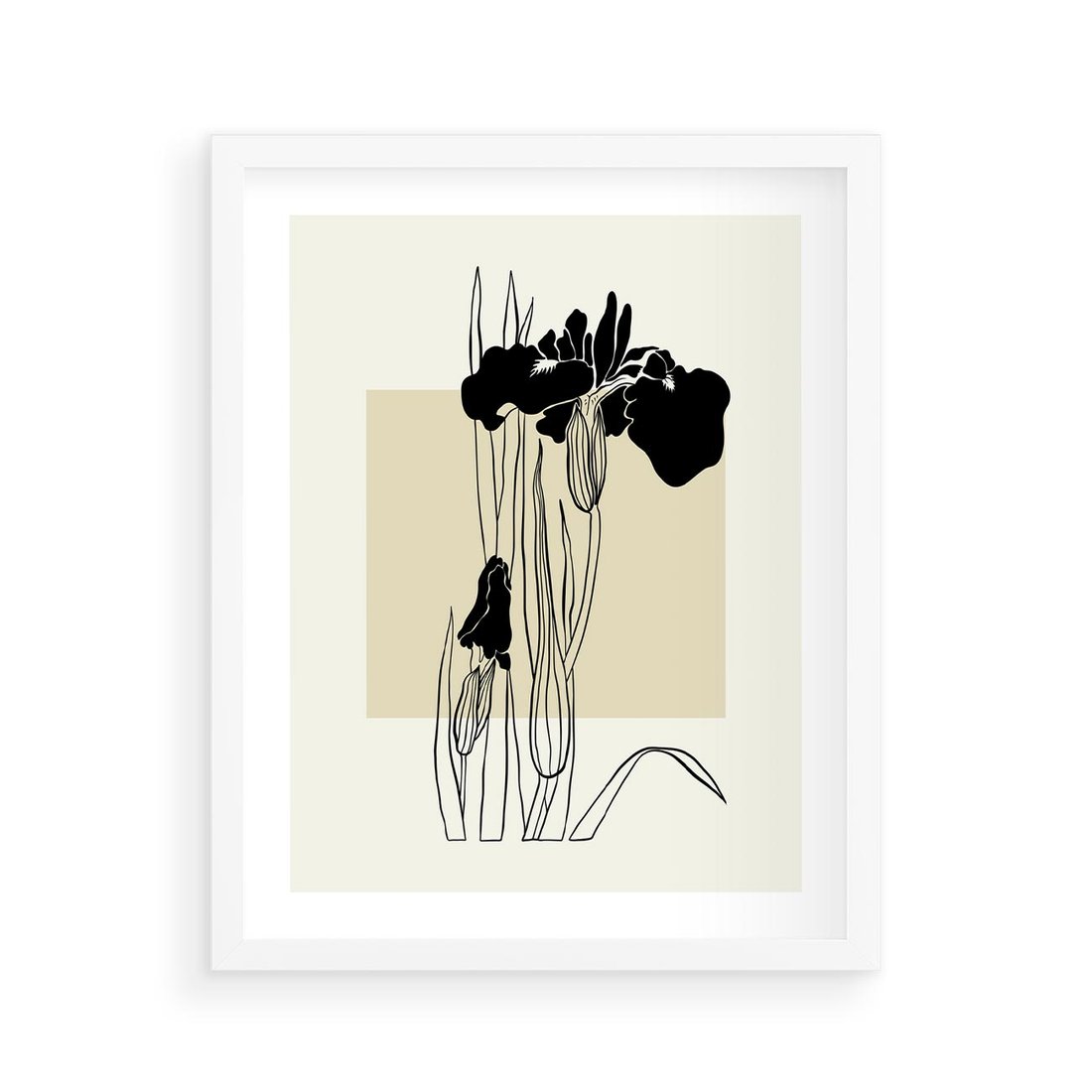 Uchwycenie piękna irysów w minimalistycznej grafice. Czarne kontury tworzą elegancką formę, a beżowe akcenty dodają delikatności. Ten obraz to idealny wybór dla miłośników minimalizmu, pragnących wprowadzić subtelny akcent natury do swojego wnętrza.