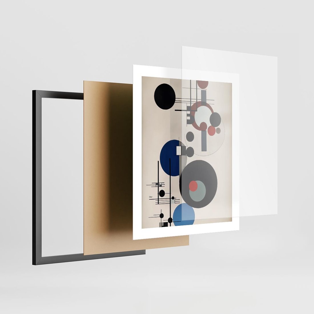 Ta abstrakcyjna geometryczna kompozycja inspirowana stylem Wassily'ego Kandinsky'ego połącza dynamiczne koła i linie w harmonijną całość. Zaskakujące połączenia kształtów tworzą fascynującą podróż wzrokową, podobnie jak w dziełach mistrza abstrakcji. To wyjątkowe dzieło sztuki emanuje energią i pasją, oddając hołd twórczości Kandinsky'ego w nowoczesnym kontekście.
