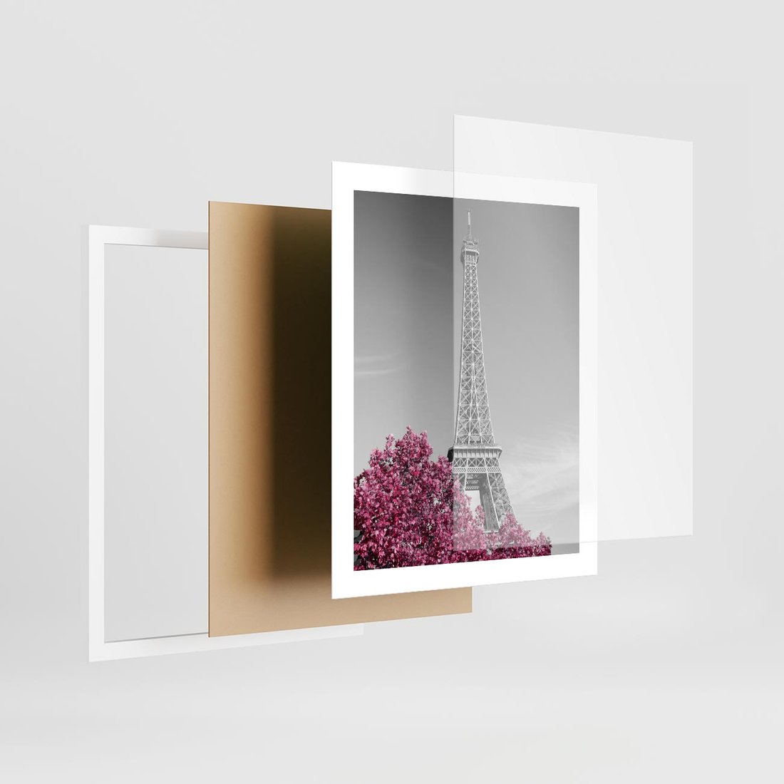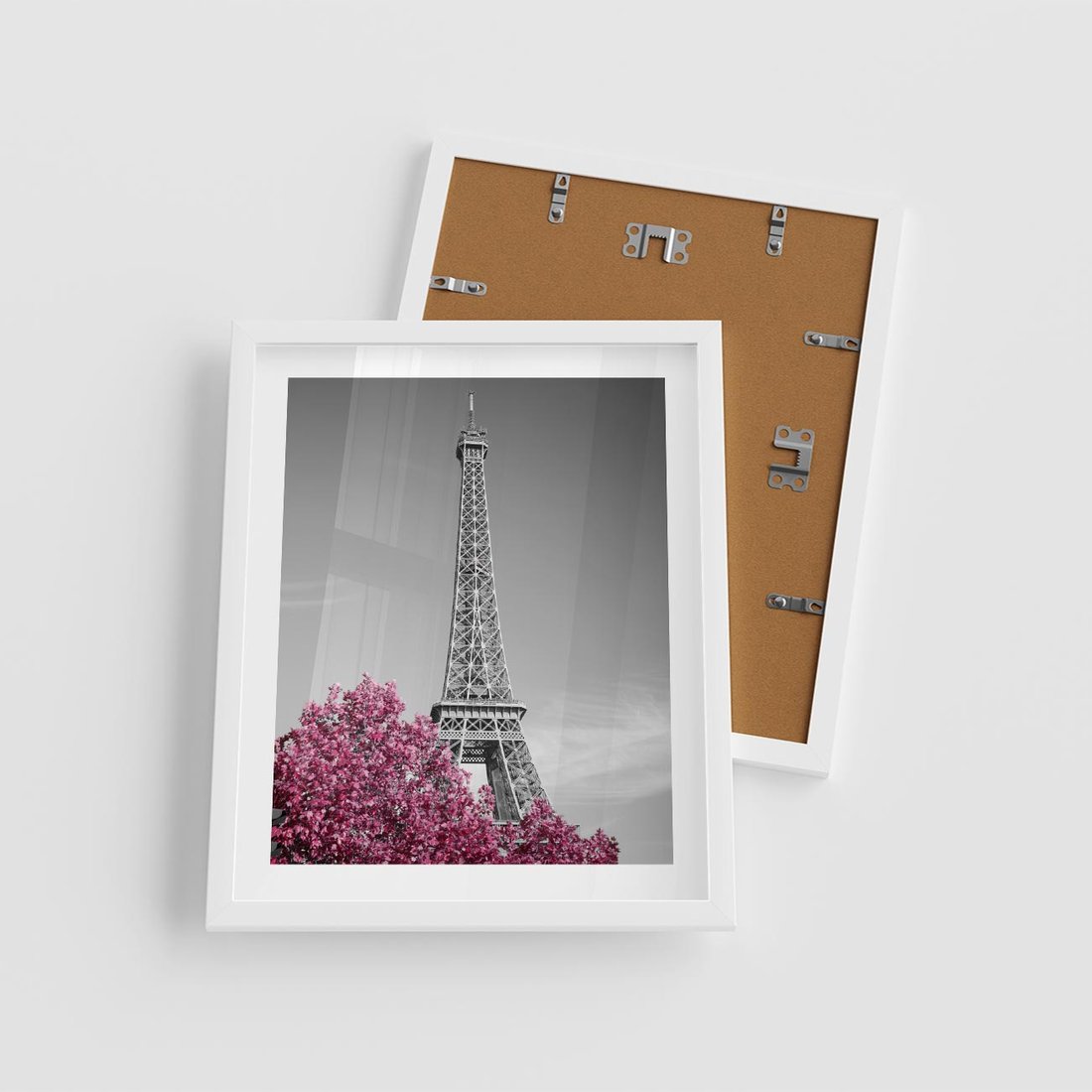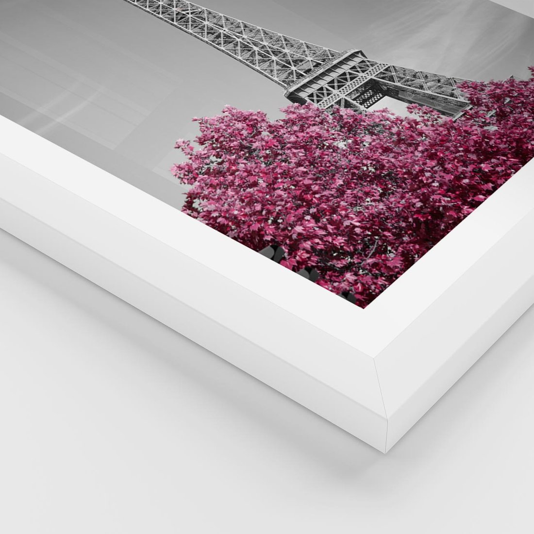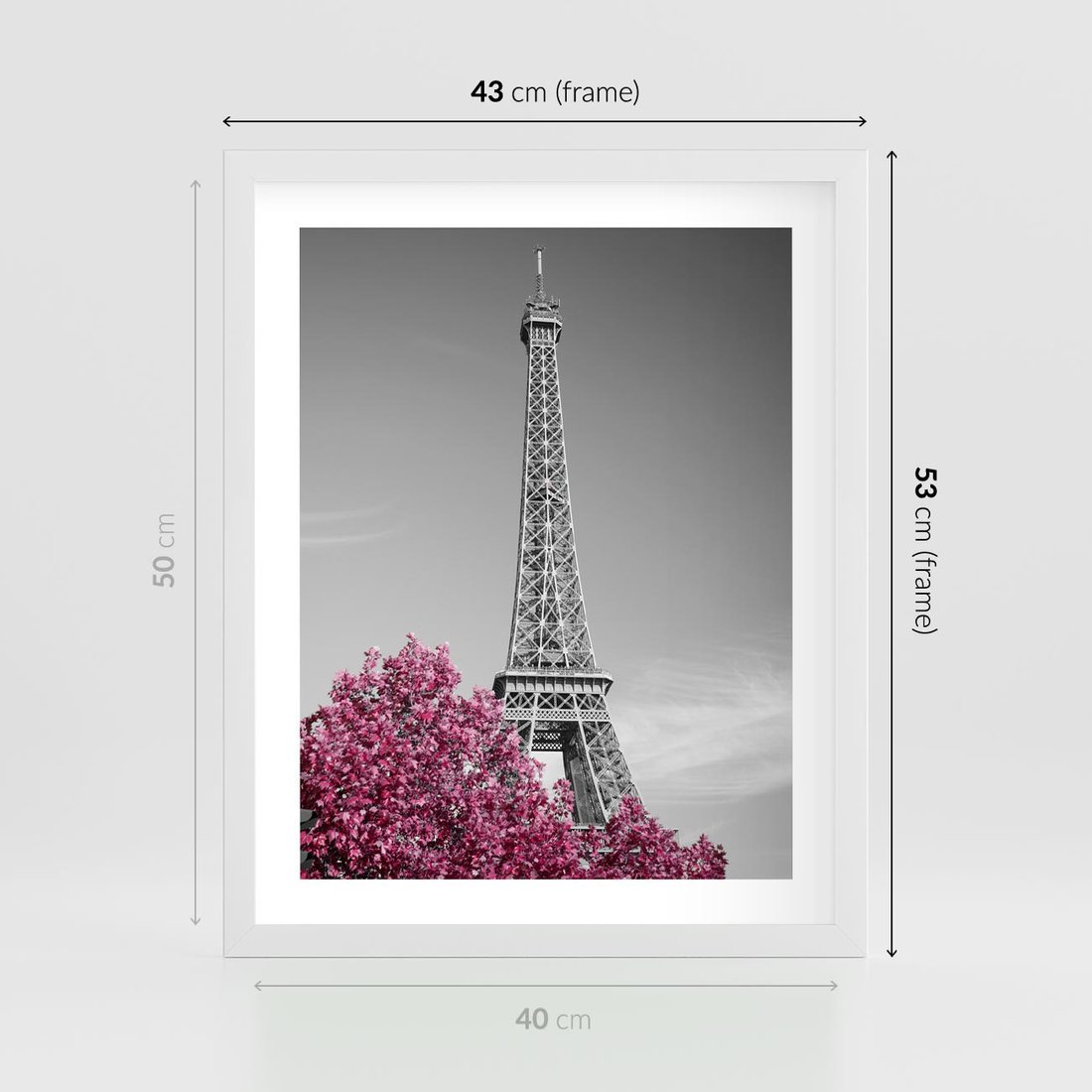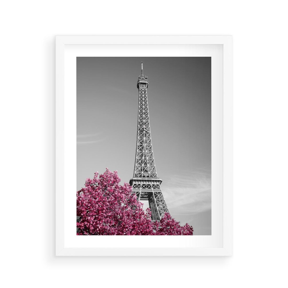 Plakat w ramie 40x50 - Różowy Paryż - czarno białe zdjęcie, wieża eiffla - rama biała