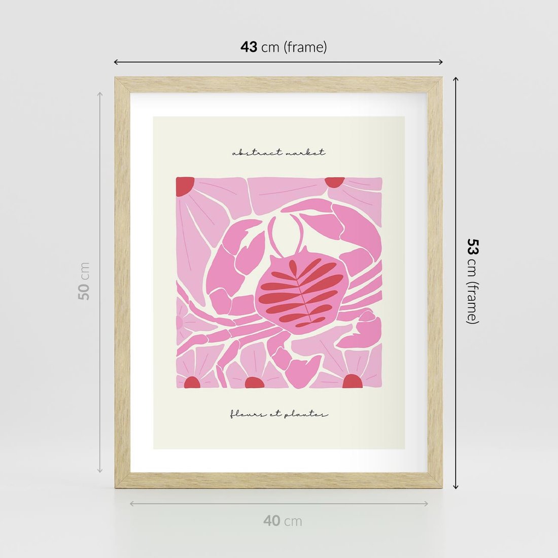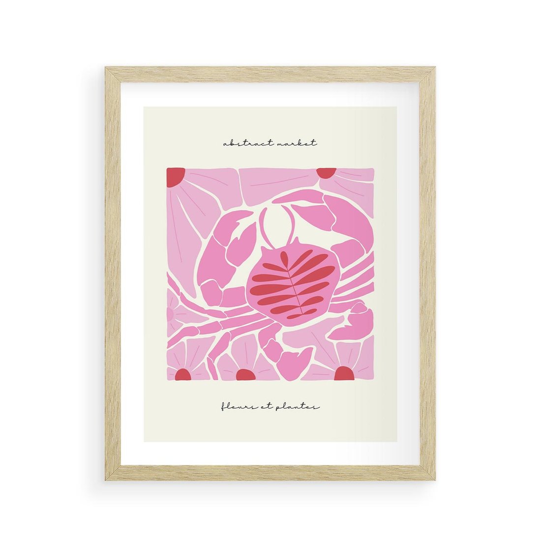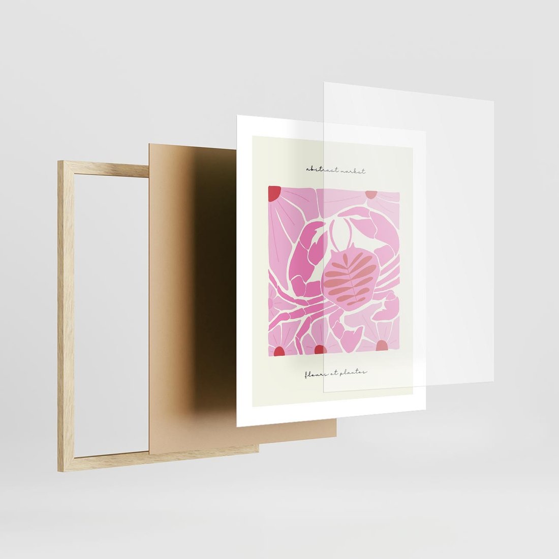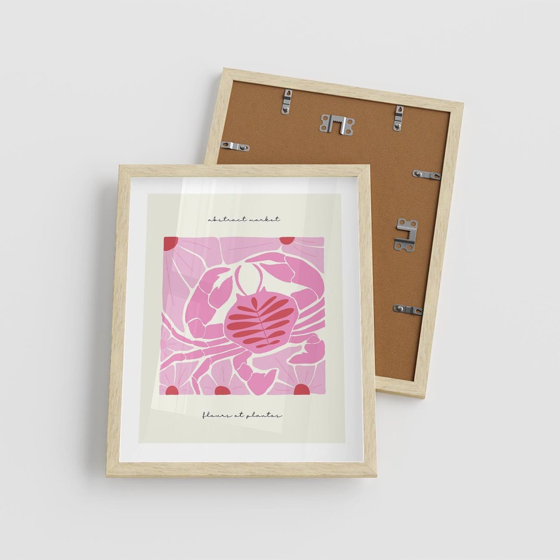 Ten abstrakcyjny plakat przedstawia kraba w nowoczesny sposób, używając delikatnych odcieni różu. Sztuka ta nadaje nową perspektywę naturze, tworząc kompozycję pełną wyobraźni i harmonii.