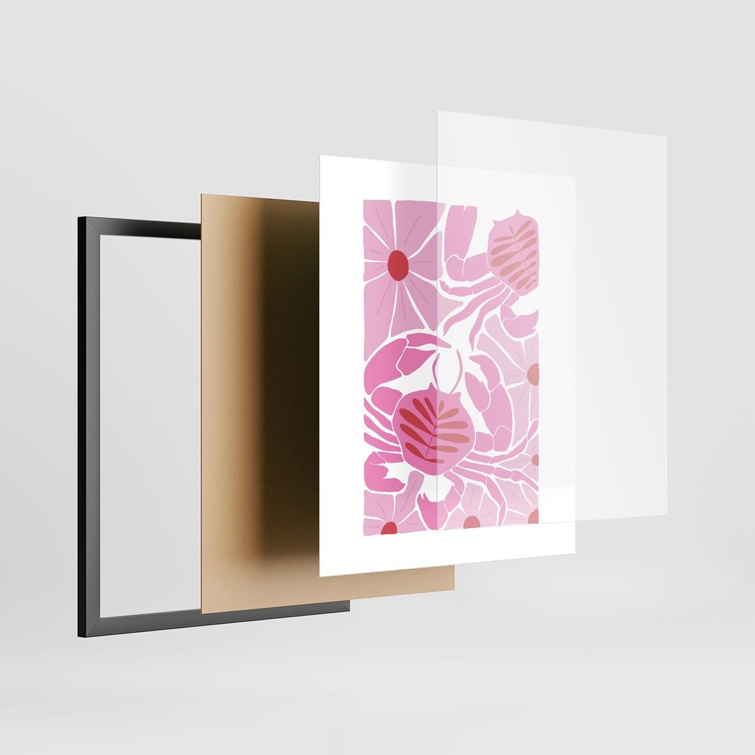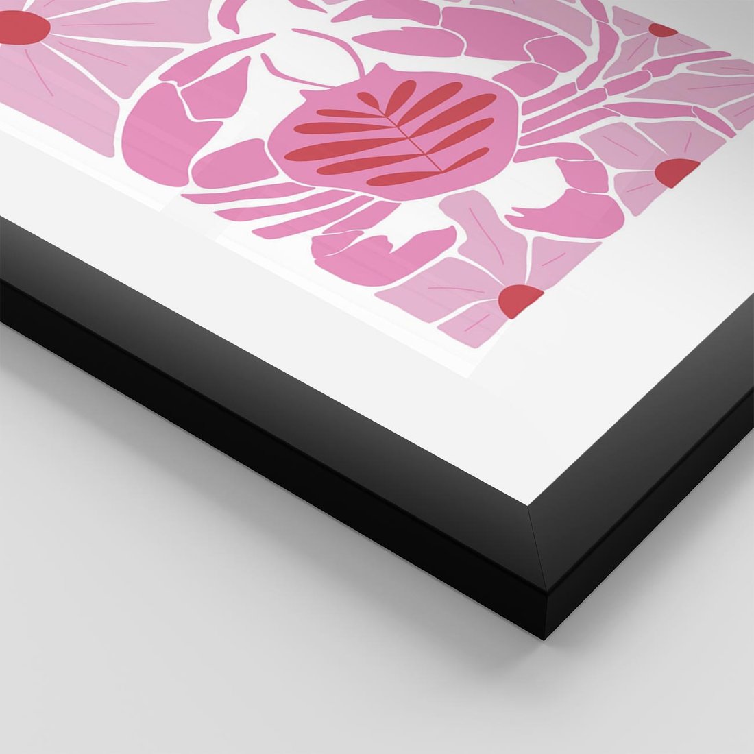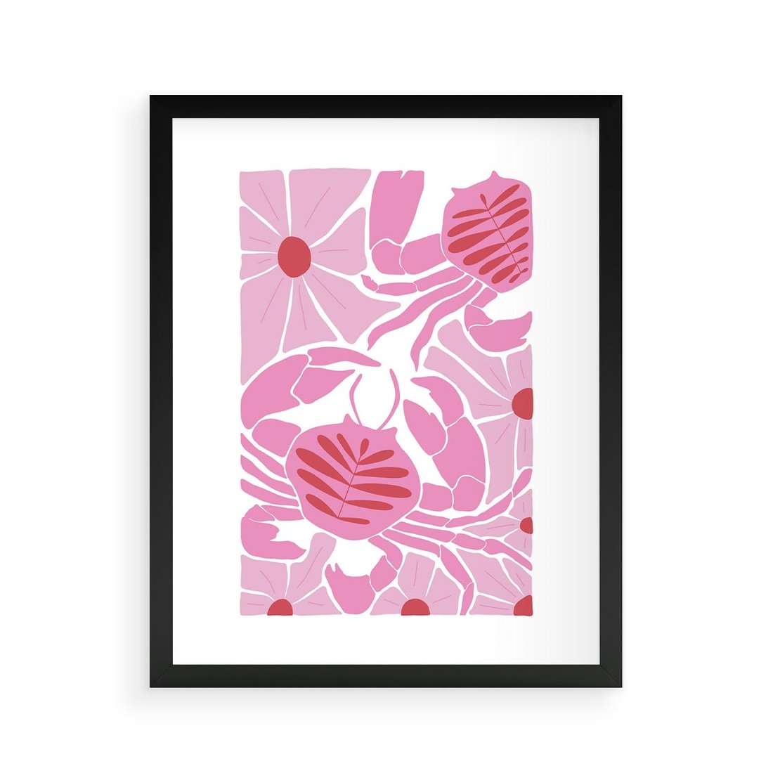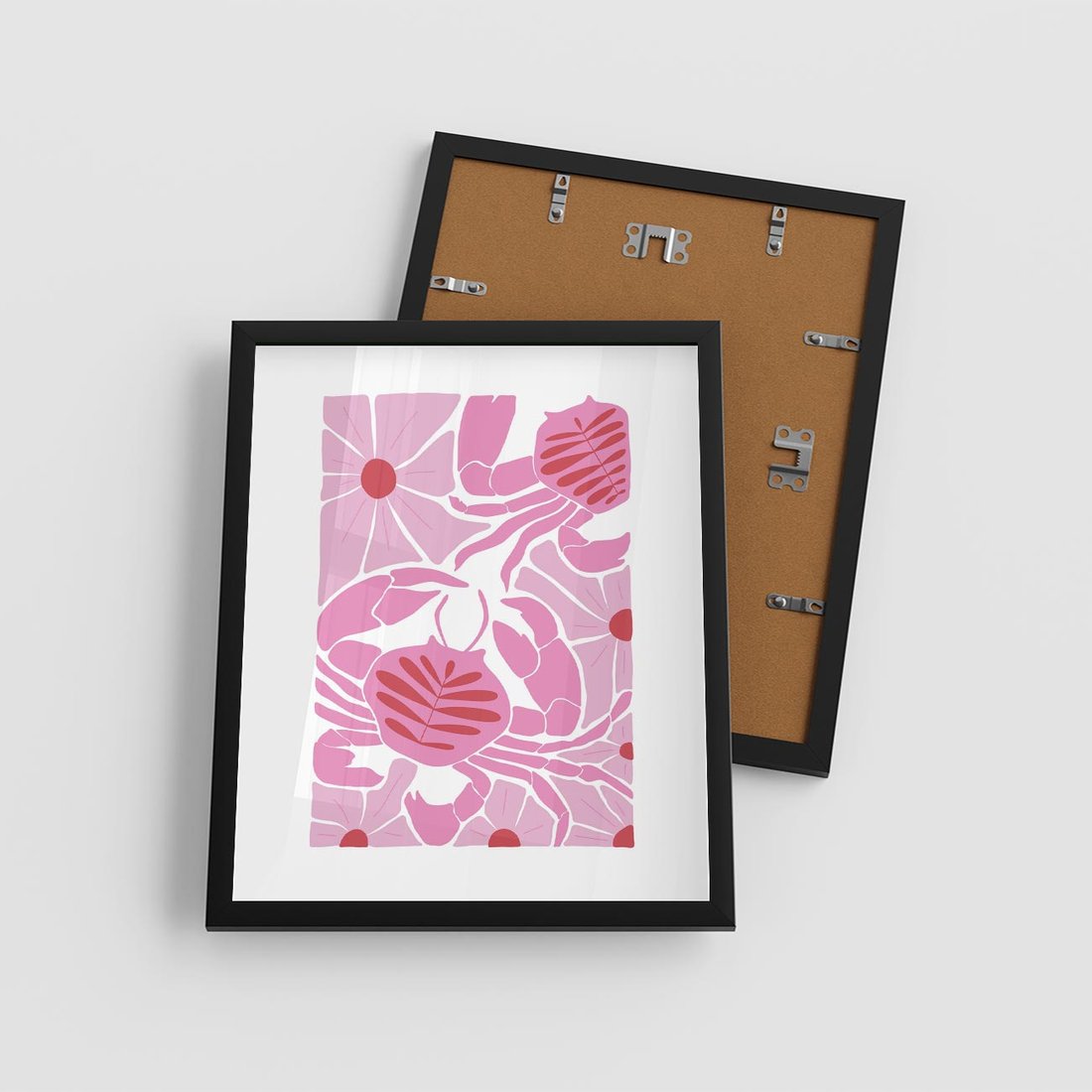 Plakat w ramie 40x50 - Roztańczone Kraby - różowe kwiaty i kraby, abstrakcyjna kompozycja - rama czarna
