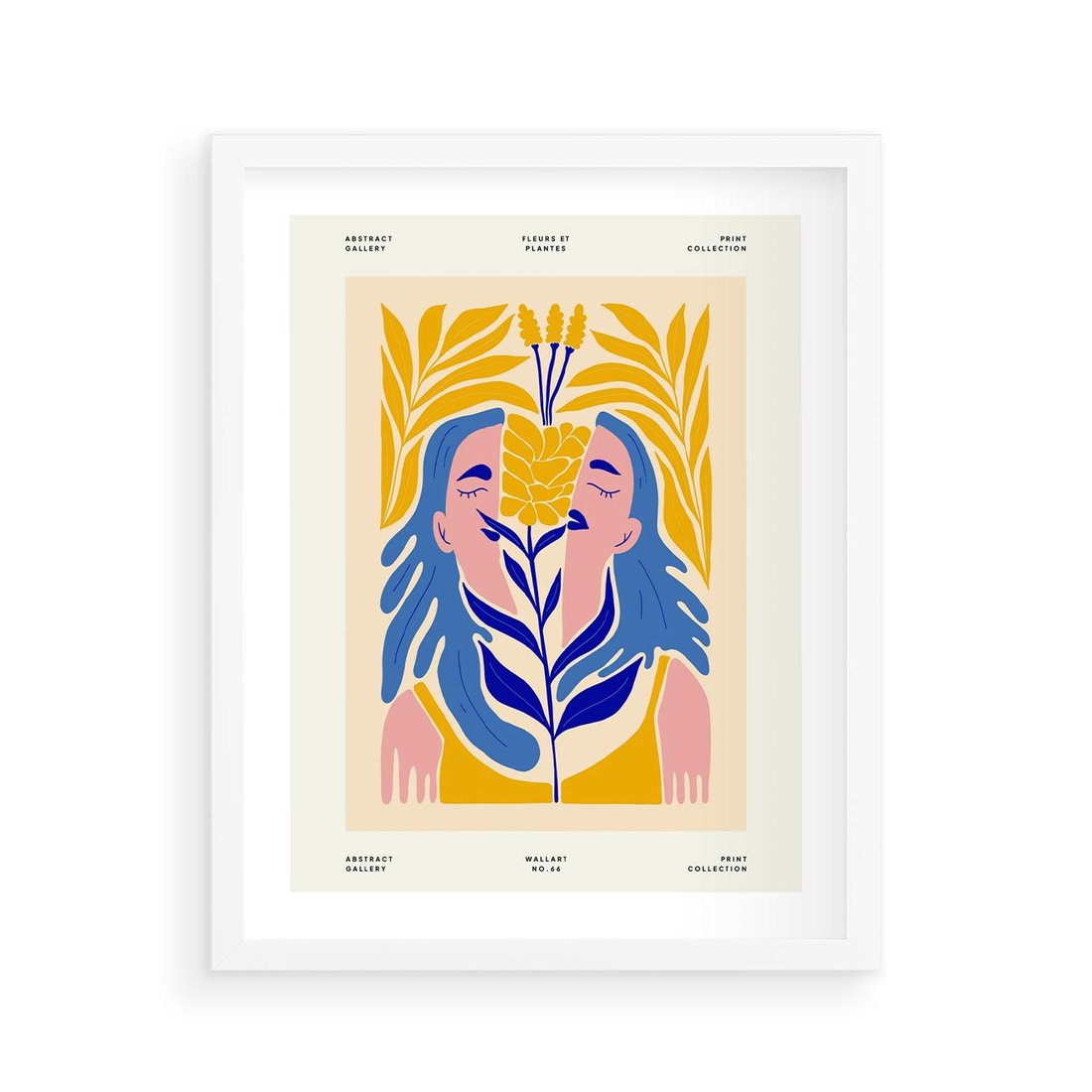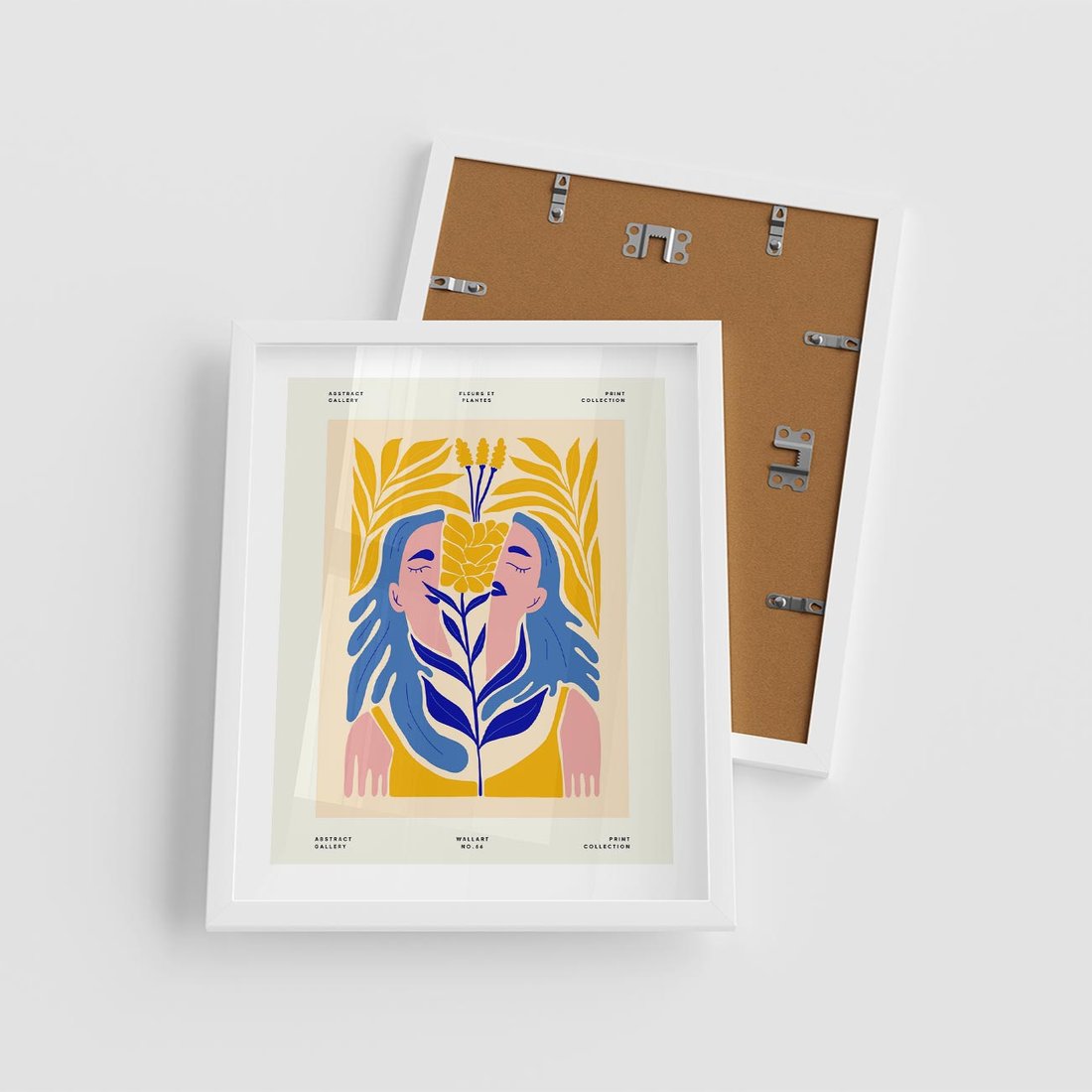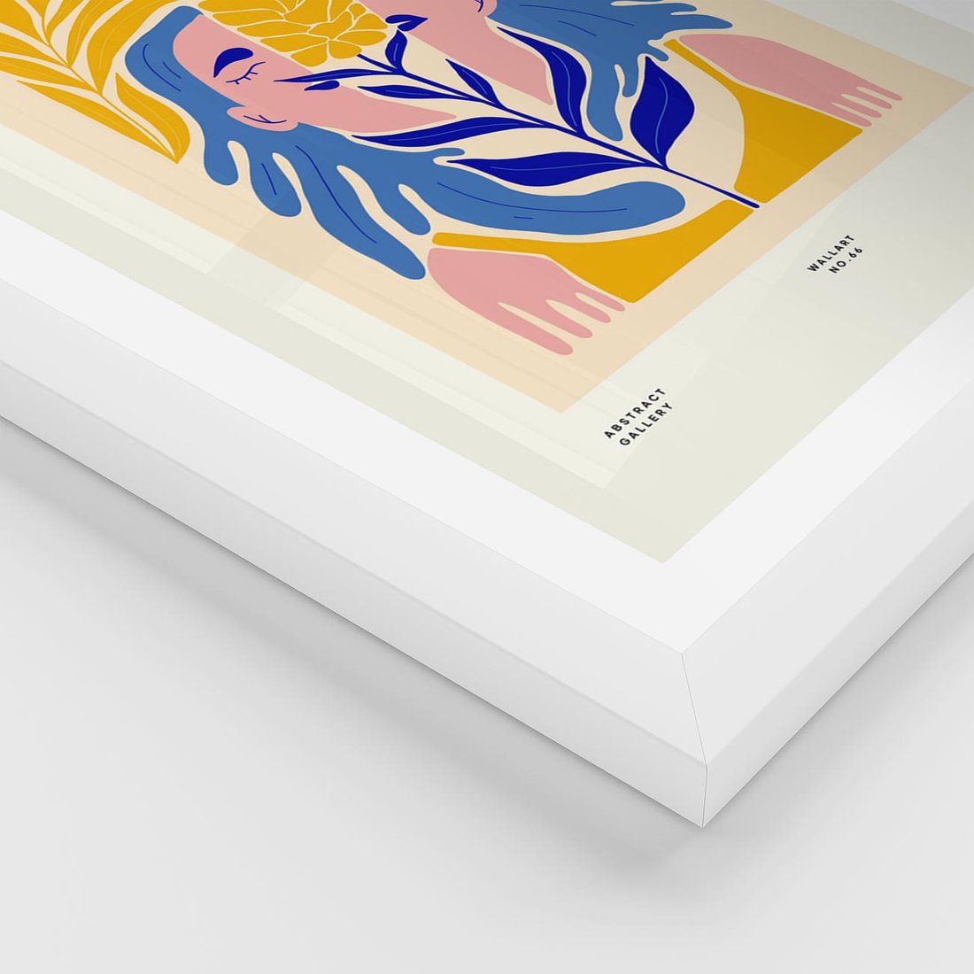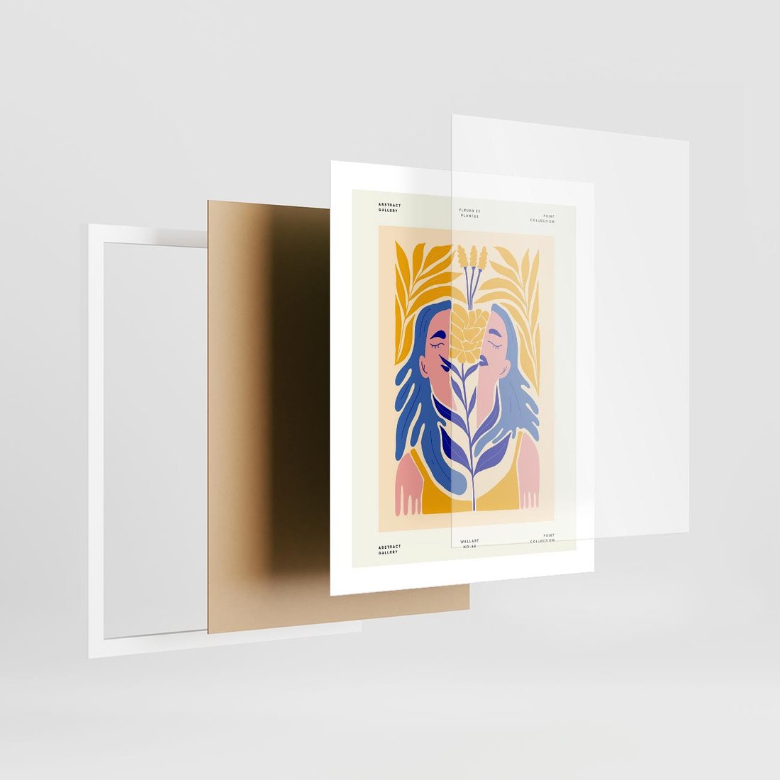Ta nowoczesna sztuka łączy abstrakcyjne kwiaty z delikatnymi pastelowymi odcieniami, tworząc harmonijną kompozycję wokół postaci kobiecej. Inspirująca i pełna piękna refleksja nad naturą i kobiecością.