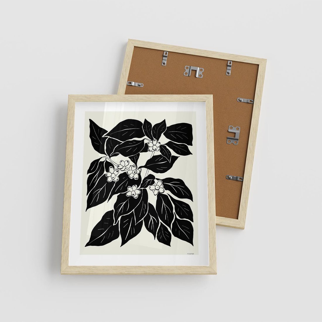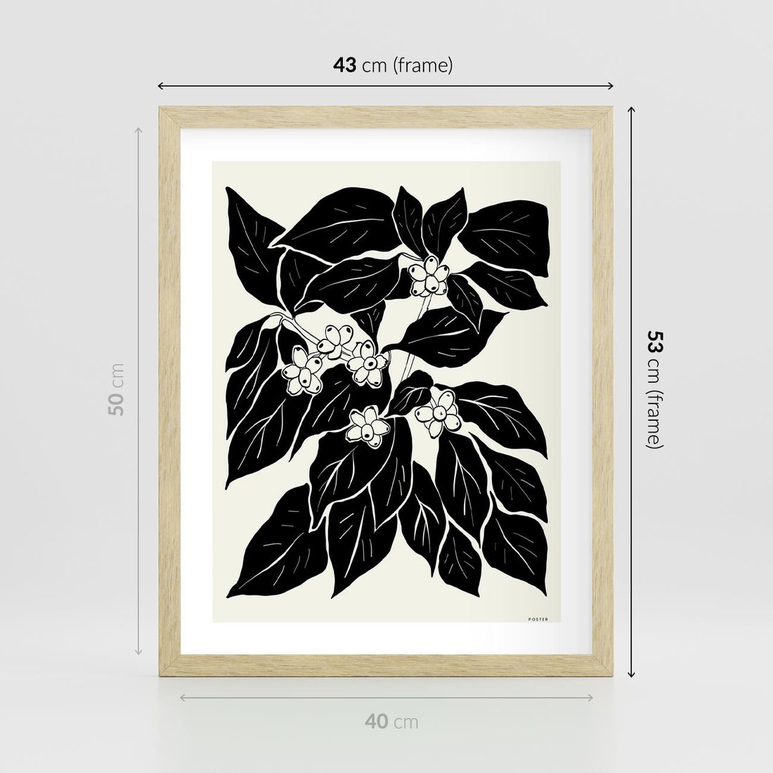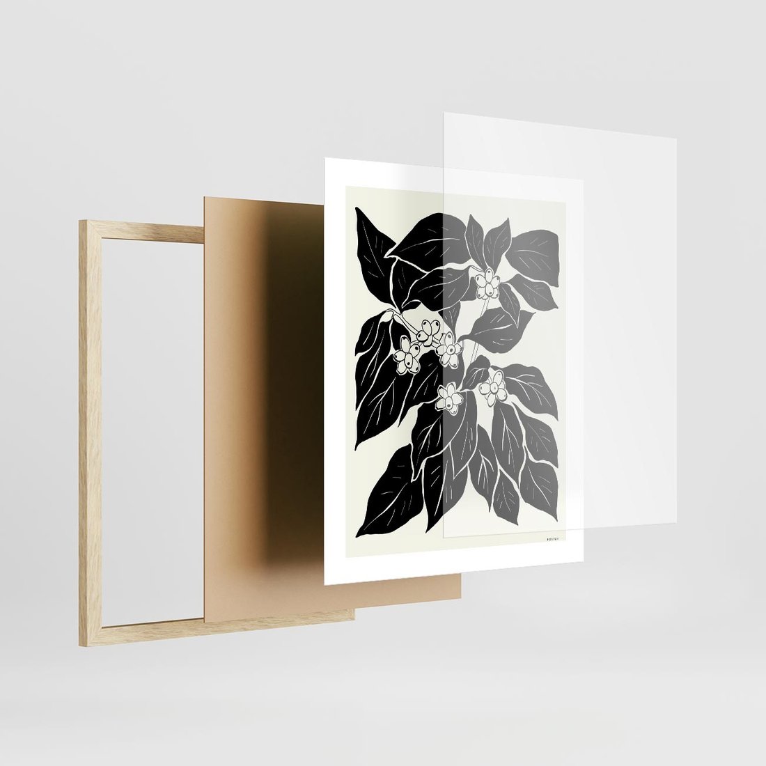Odkryj urok natury w tej czarno-białej grafice. Liście i roślinne motywy tworzą minimalistyczną formę, oddając piękno roślinności w prostym stylu. Ten obraz doskonale wpisuje się w estetykę minimalizmu, wnosząc do wnętrza delikatny akcent przyrody i spokoju.
