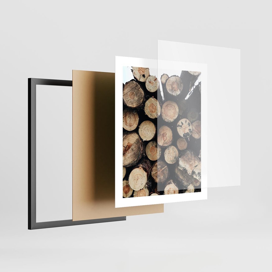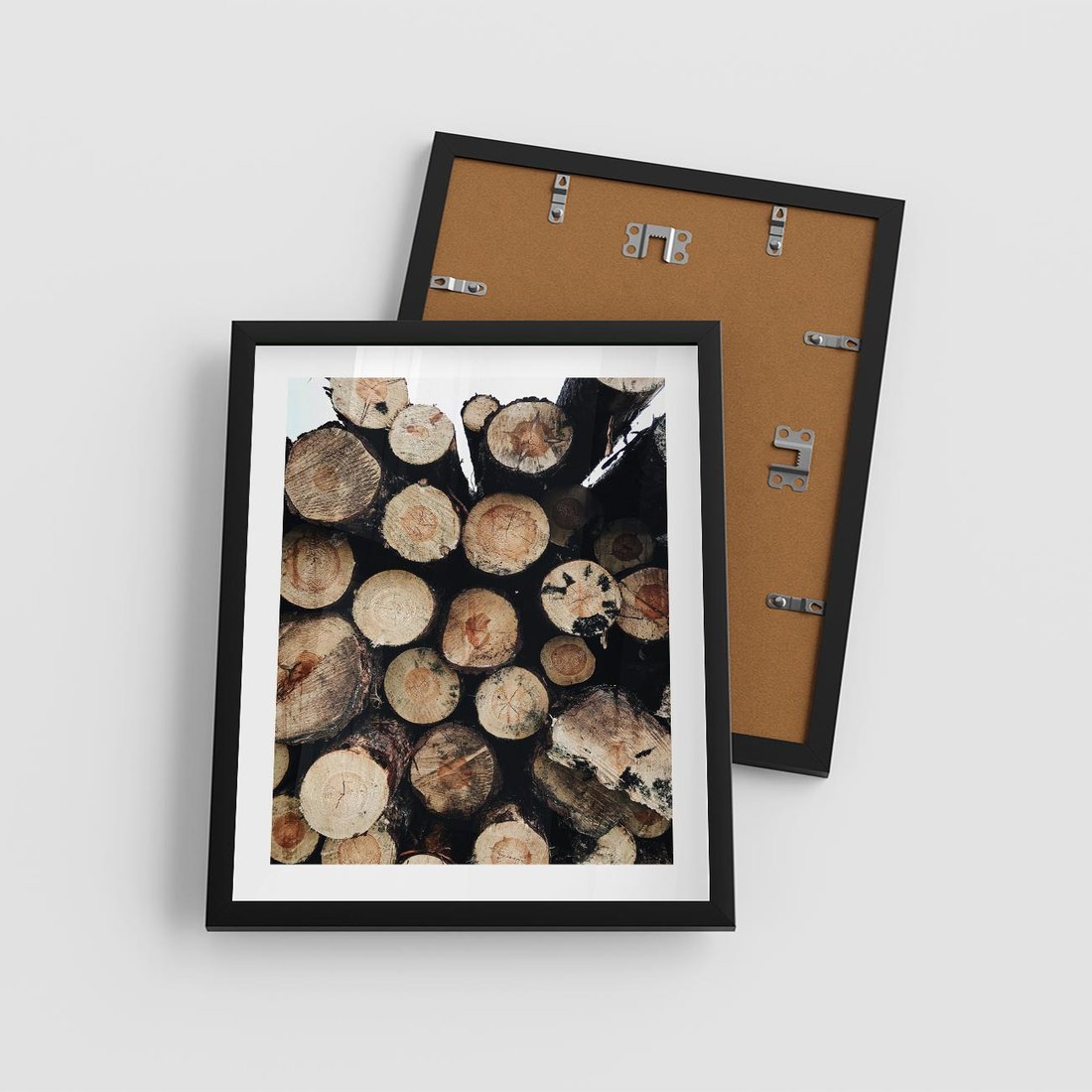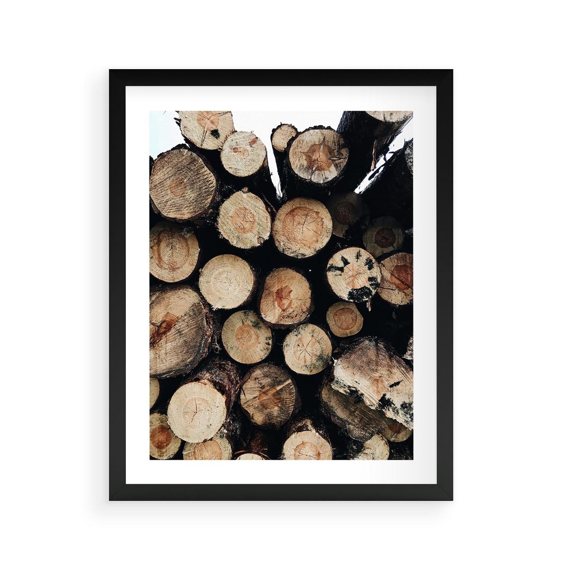 Plakat w ramie 40x50 - Siła Drewna - ścięte drewno, belki drewna ułożone jedna na drugiej - rama czarna