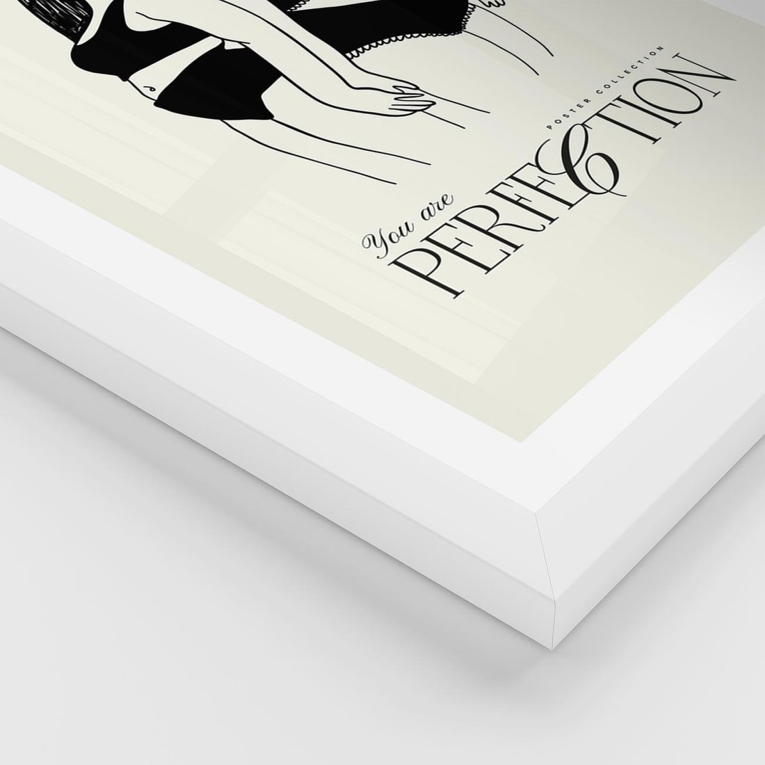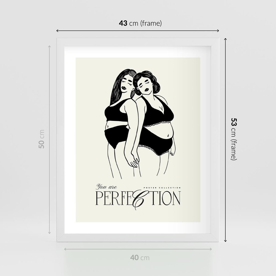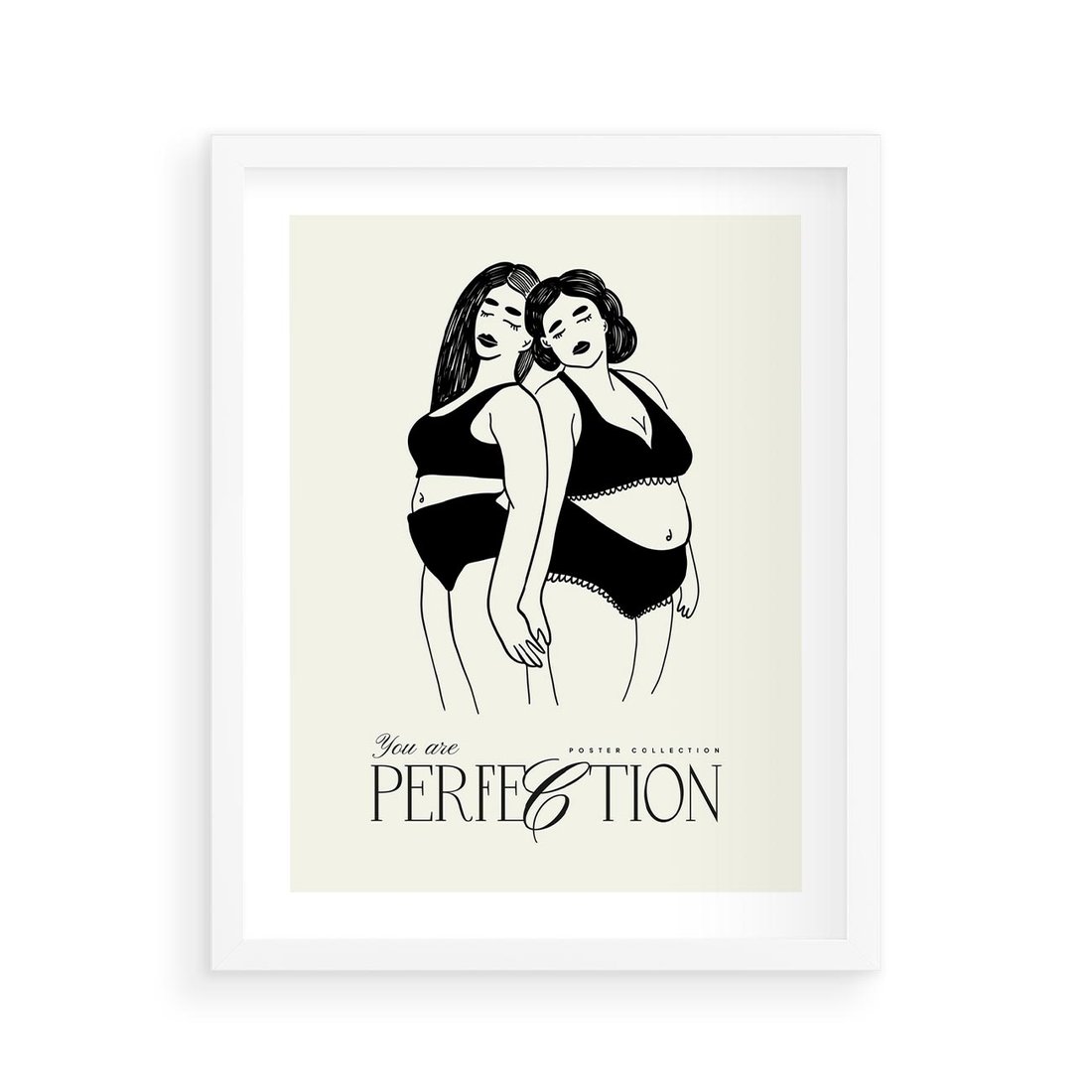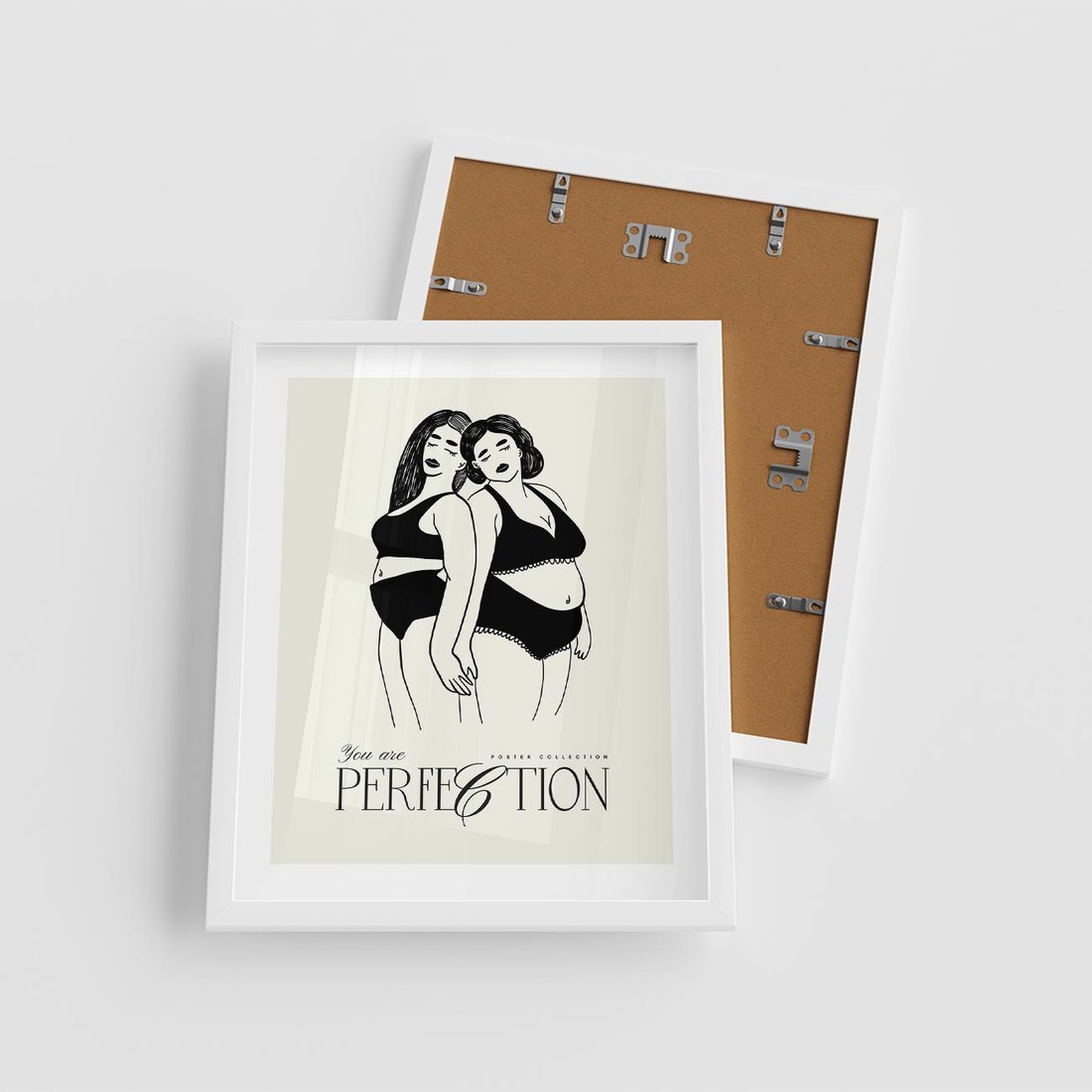 Ten nowoczesny plakat przedstawia dwie kobiety w bieliźnie, promując wartość samoakceptacji. Ich połączenie symbolizuje wspólnotę i siłę kobiecej natury, podkreślanej inspirującą typografią.